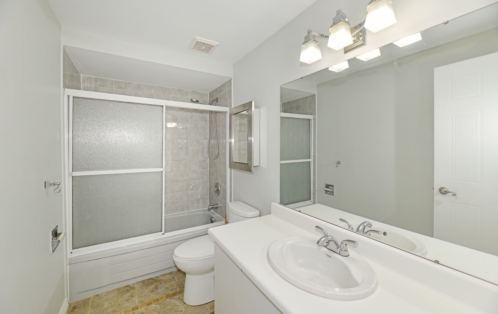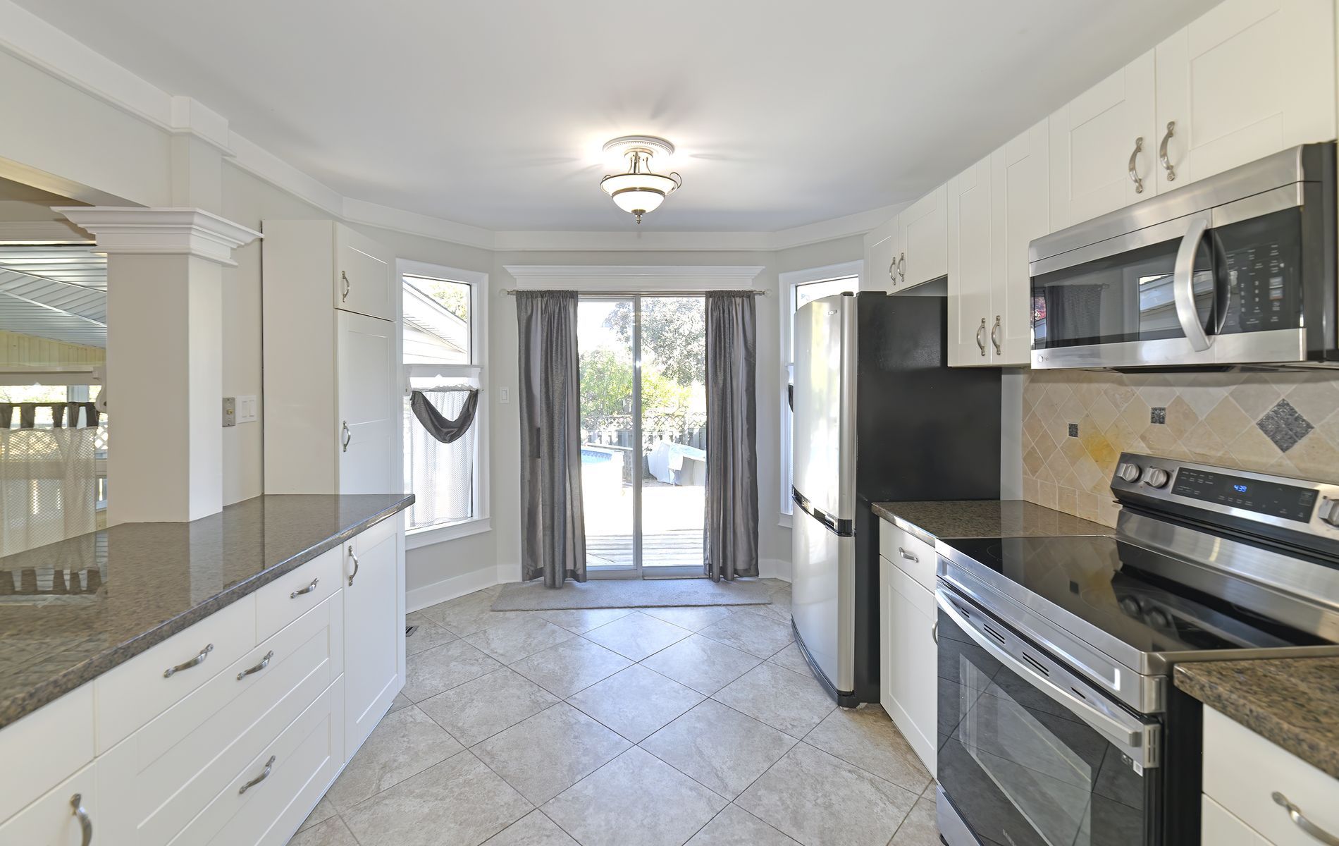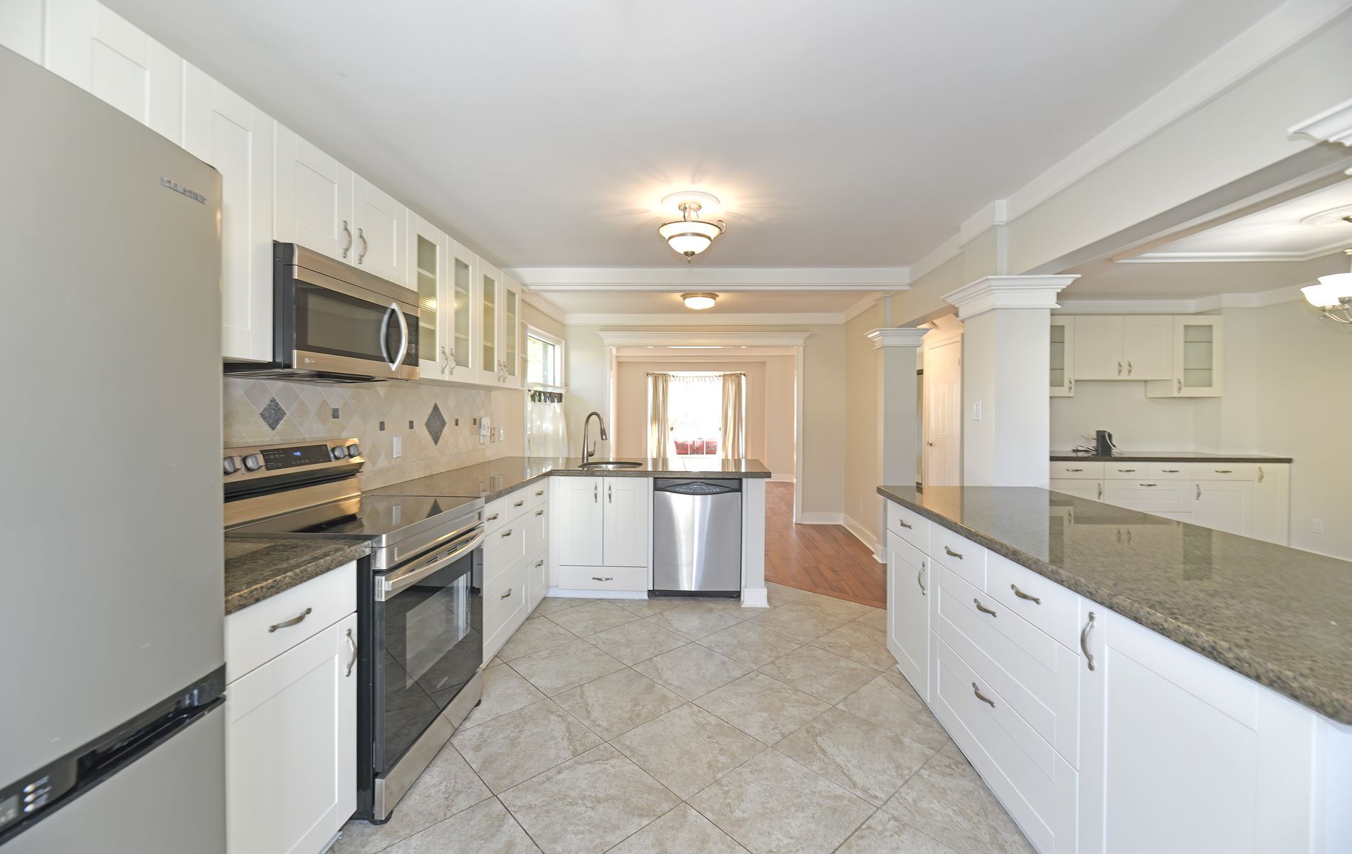 • Modern kitchen features ceramic flooring and granite counters.