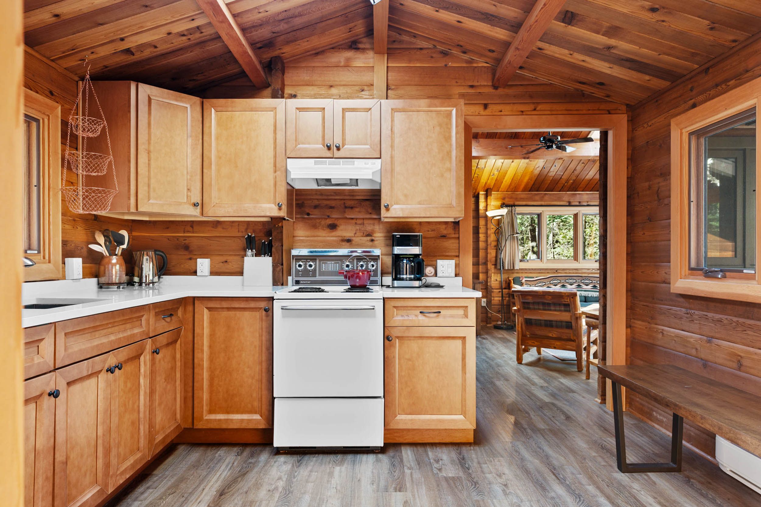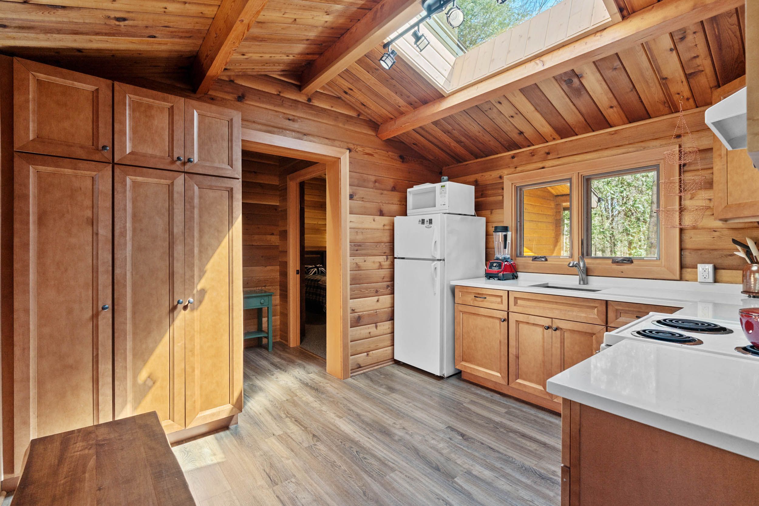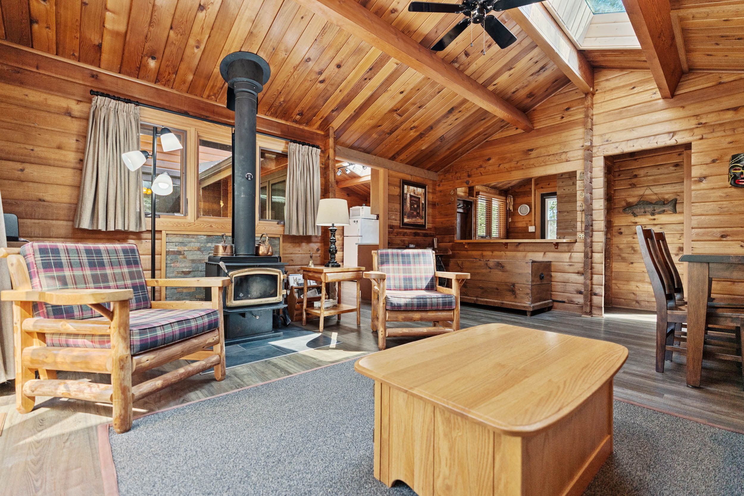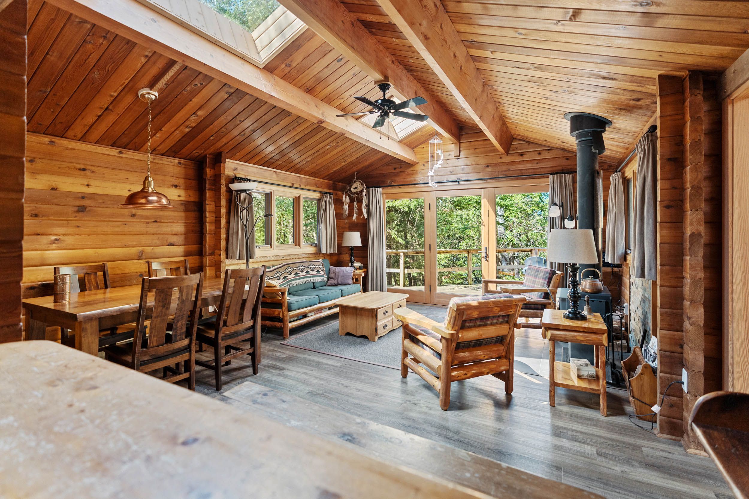 • Cozy Pan-abode home with warm wood interiors and skylights.