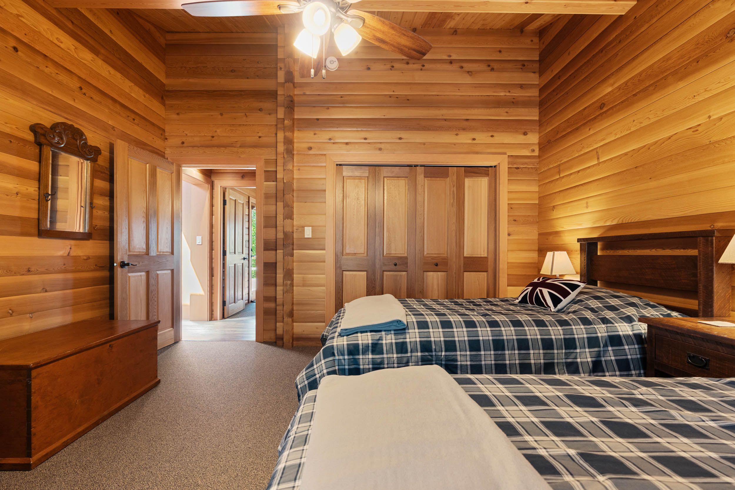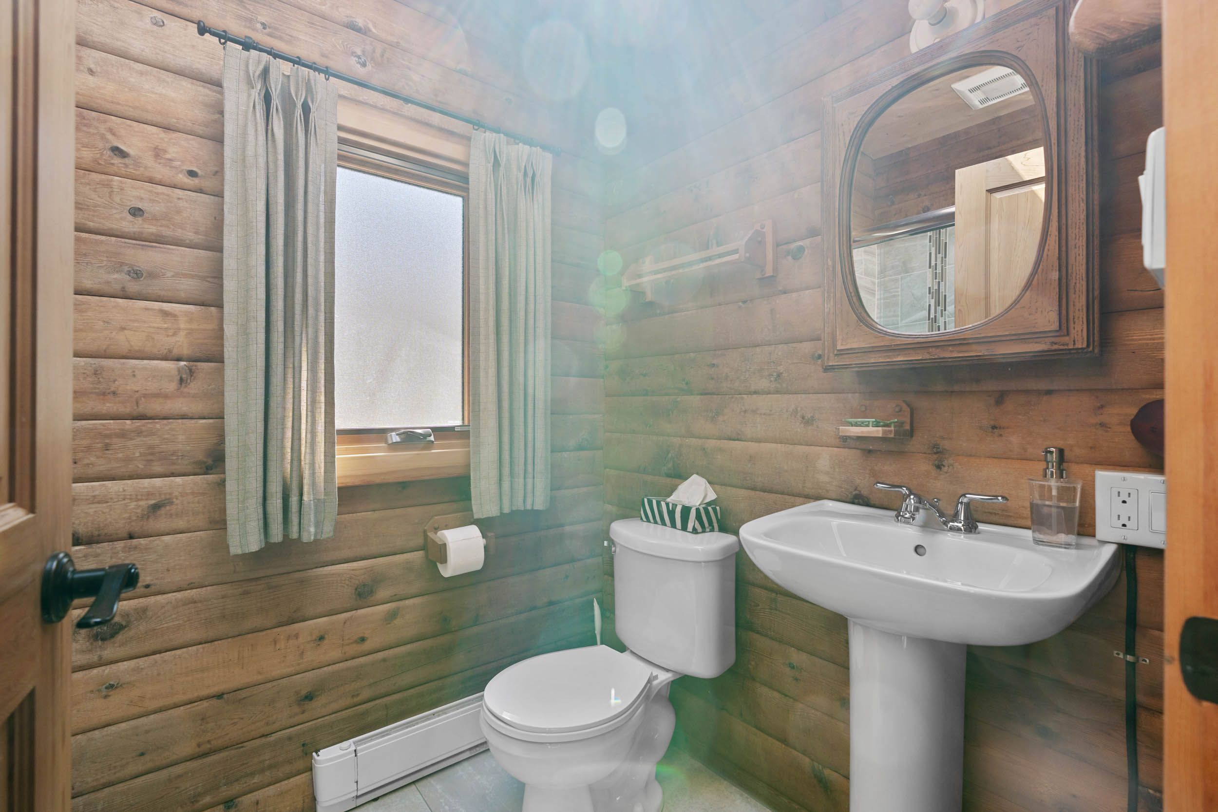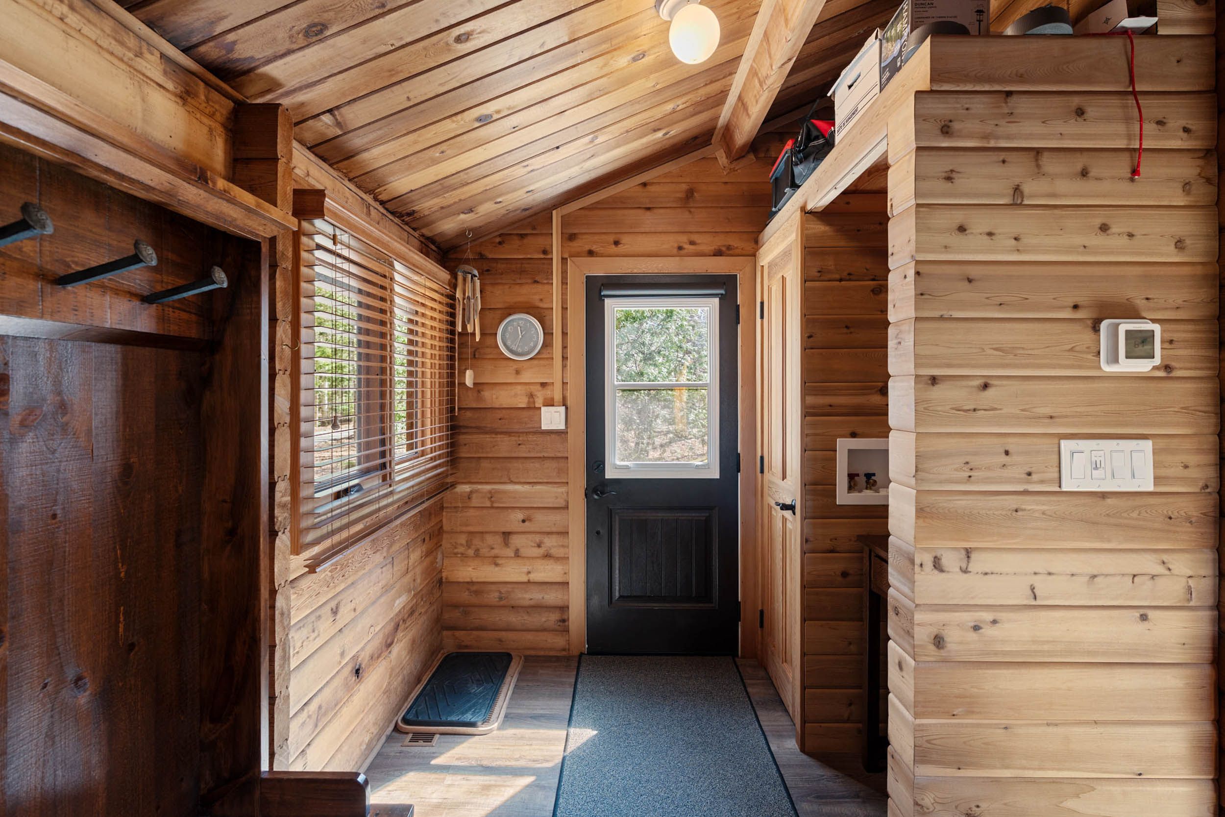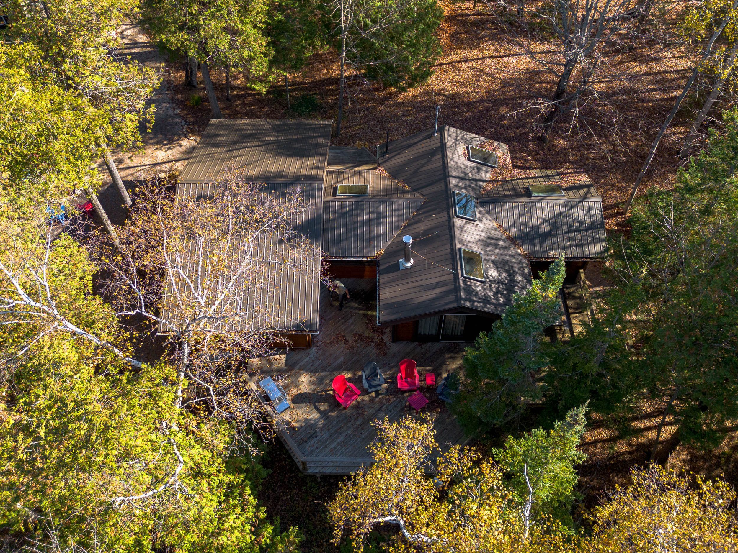 • Cozy Pan-abode home with warm wood interiors and skylights.