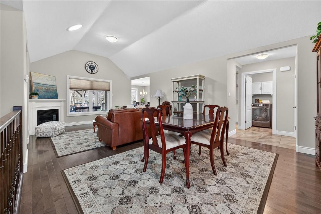 • Open concept living and dining area with vaulted ceilings and fireplace.