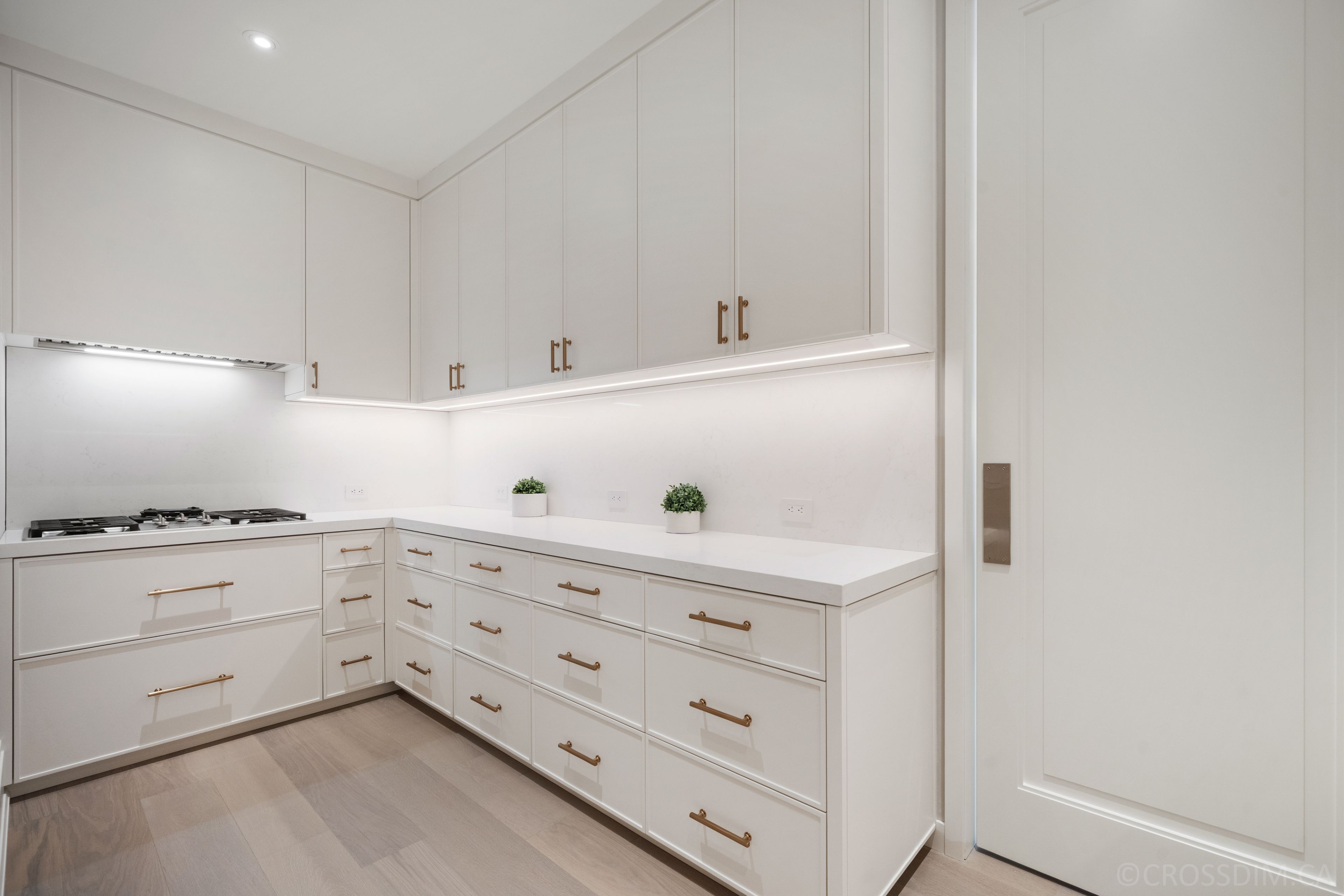 • Chef-inspired kitchen with marble island and hidden prep area.