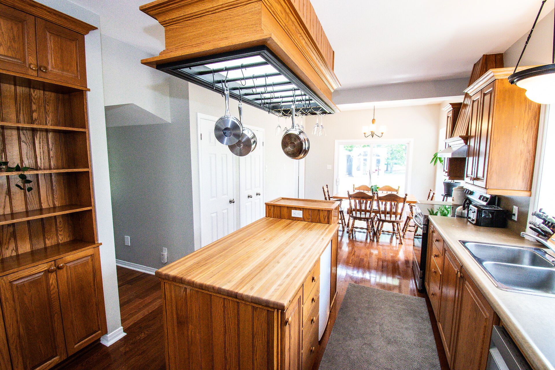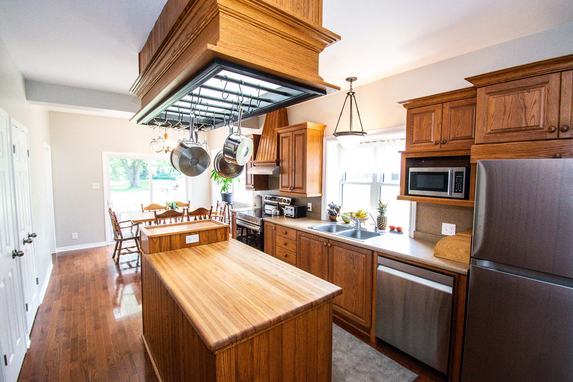 • Modern kitchen with natural oak cabinets and stainless steel appliances.