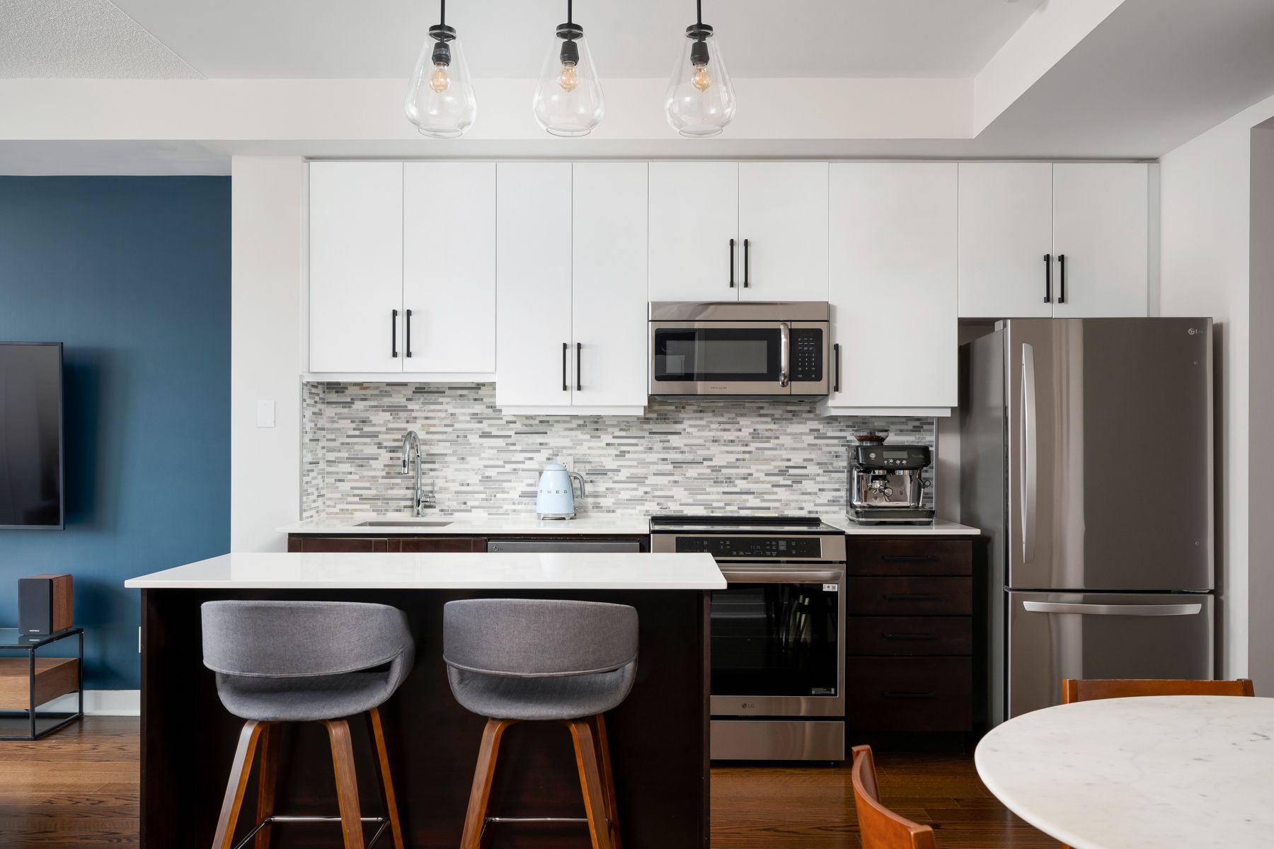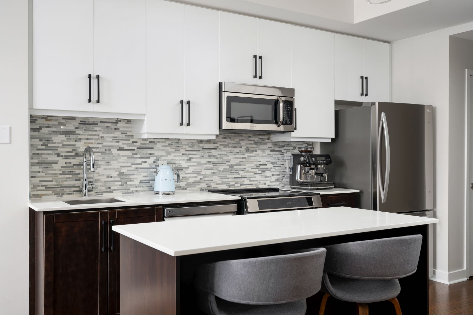 • Modern kitchen features upgraded appliances, a large island, and plenty of storage.