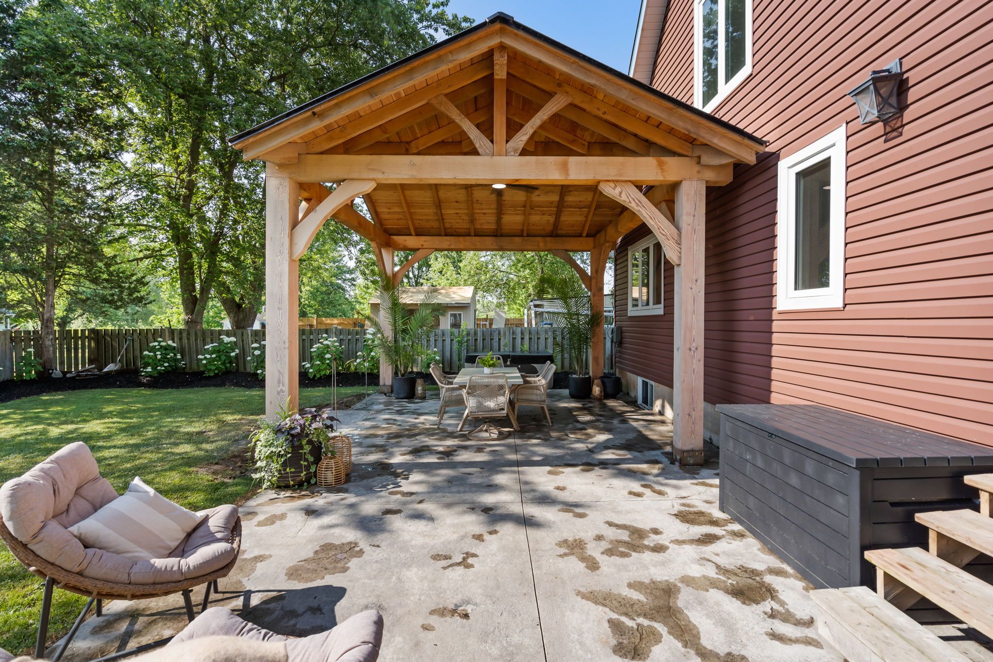 • Wrap-around porch and deck overlooking a private fenced yard.