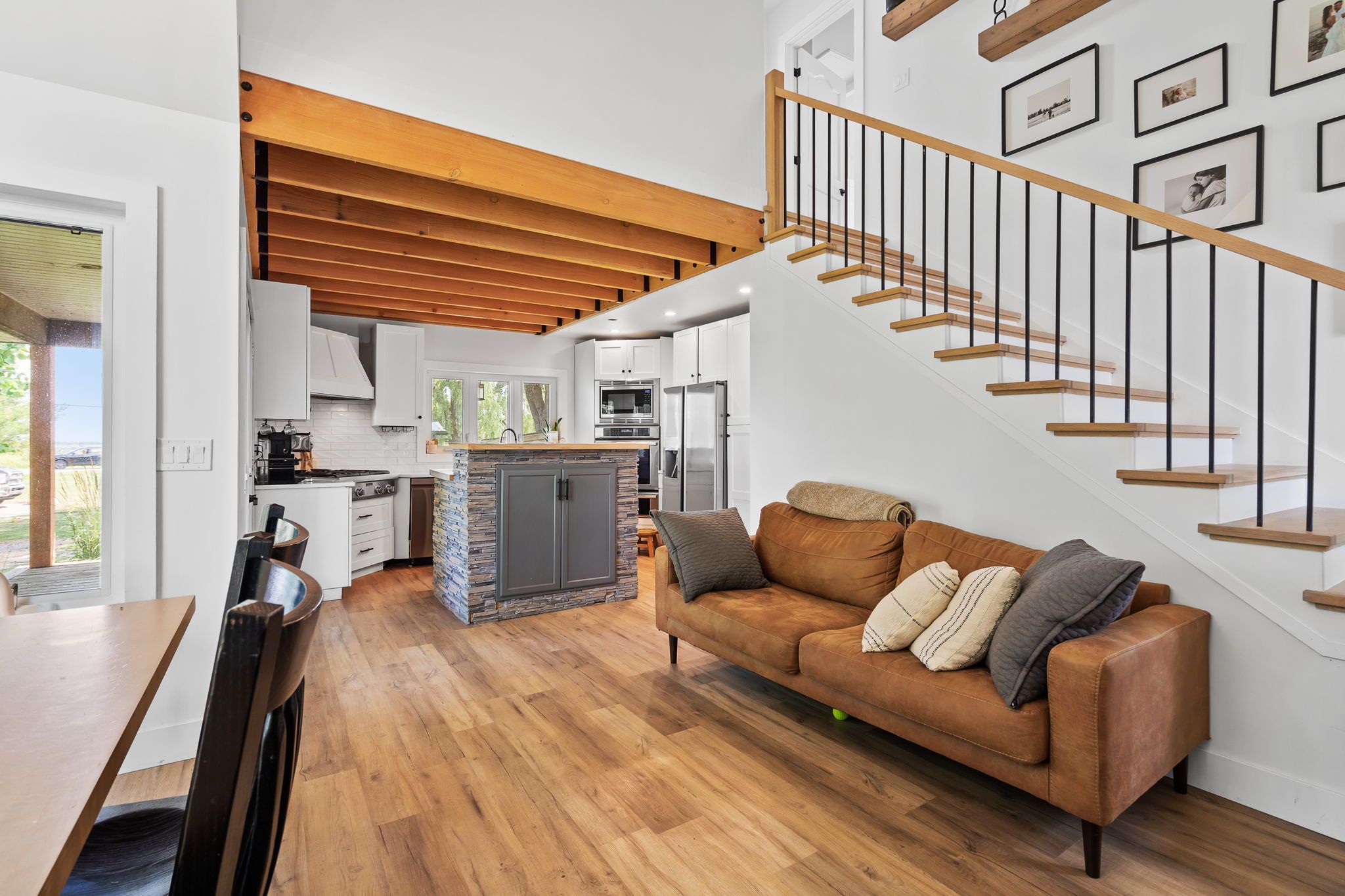 • Open concept design with high ceilings and an elegant kitchen.