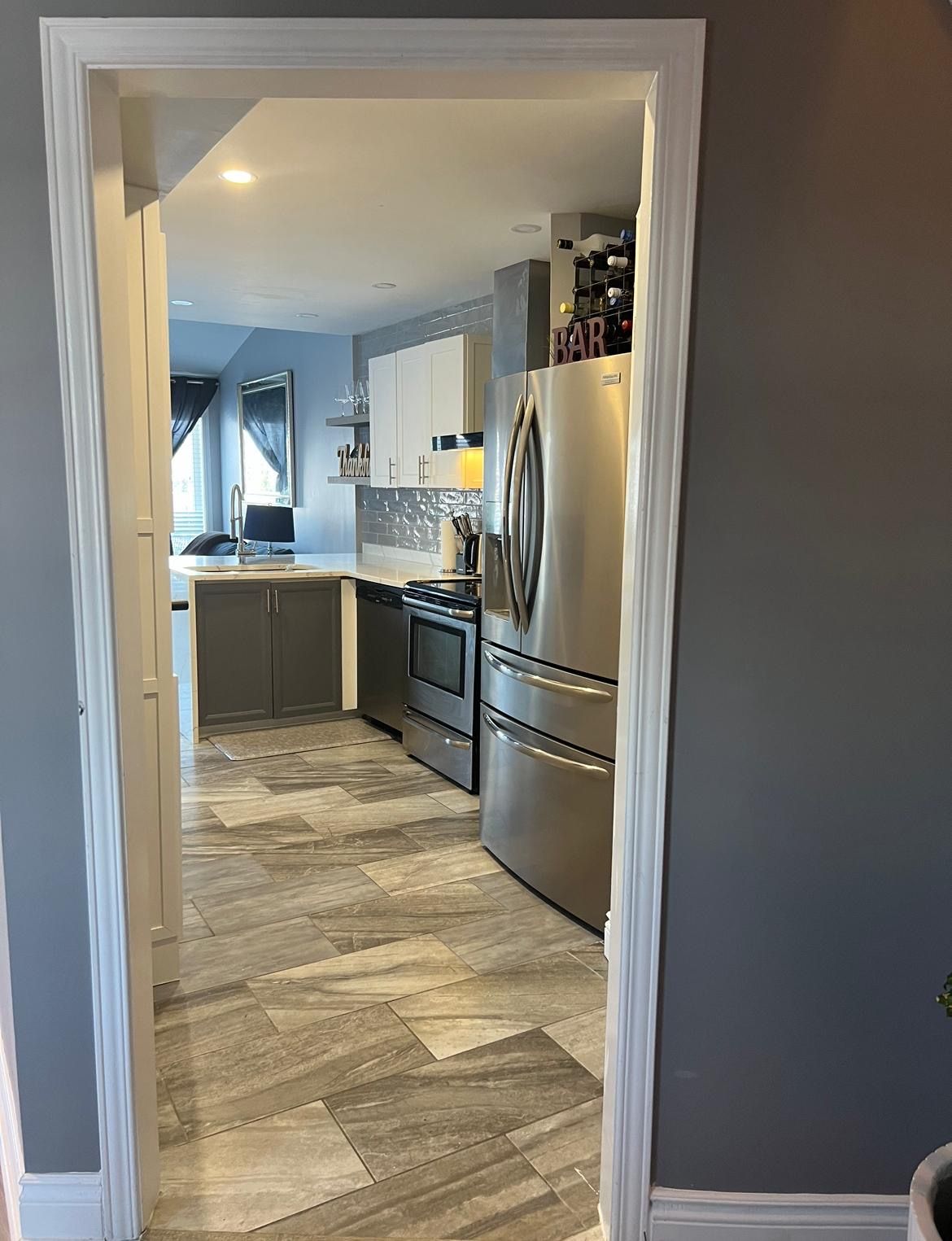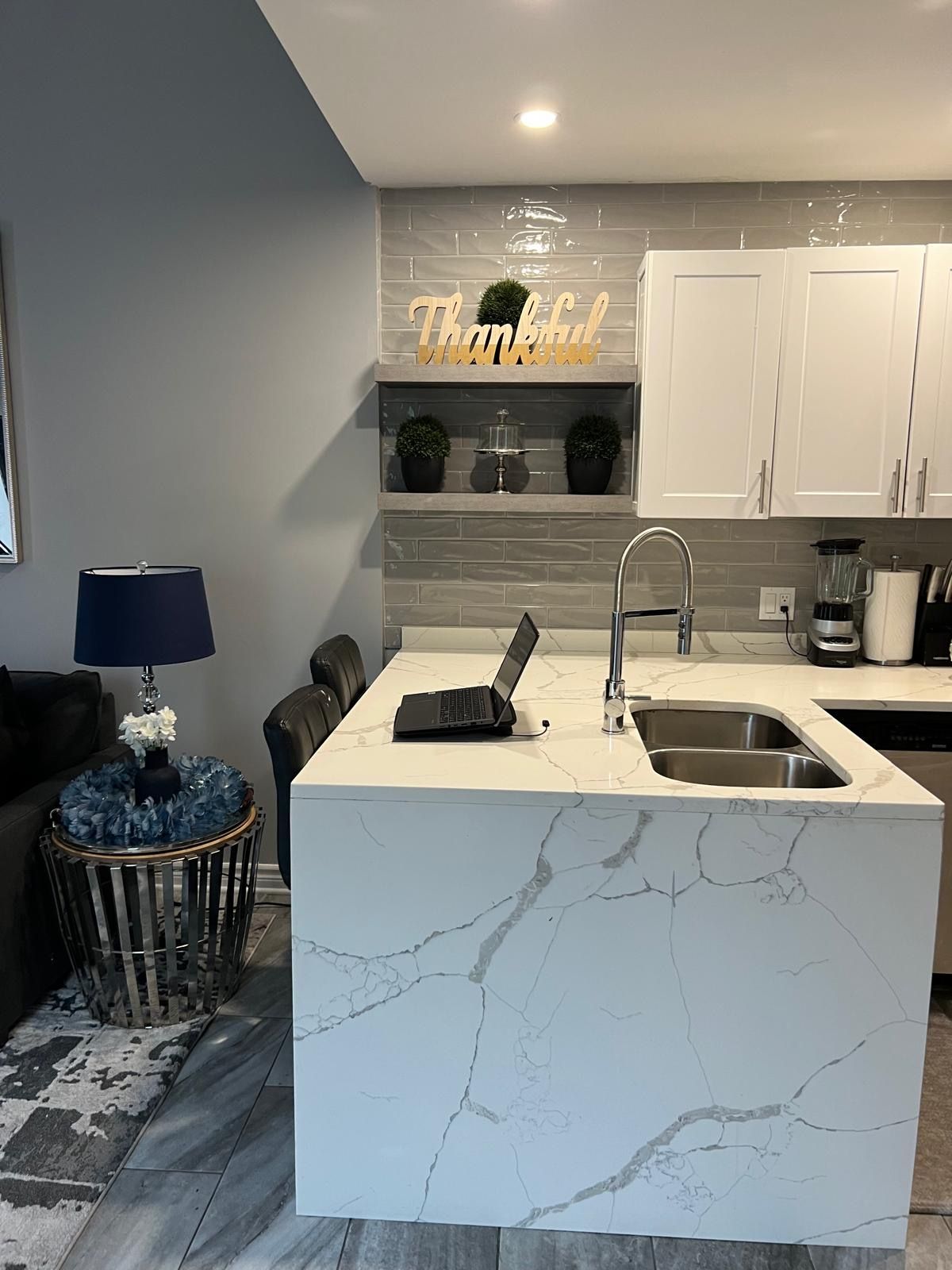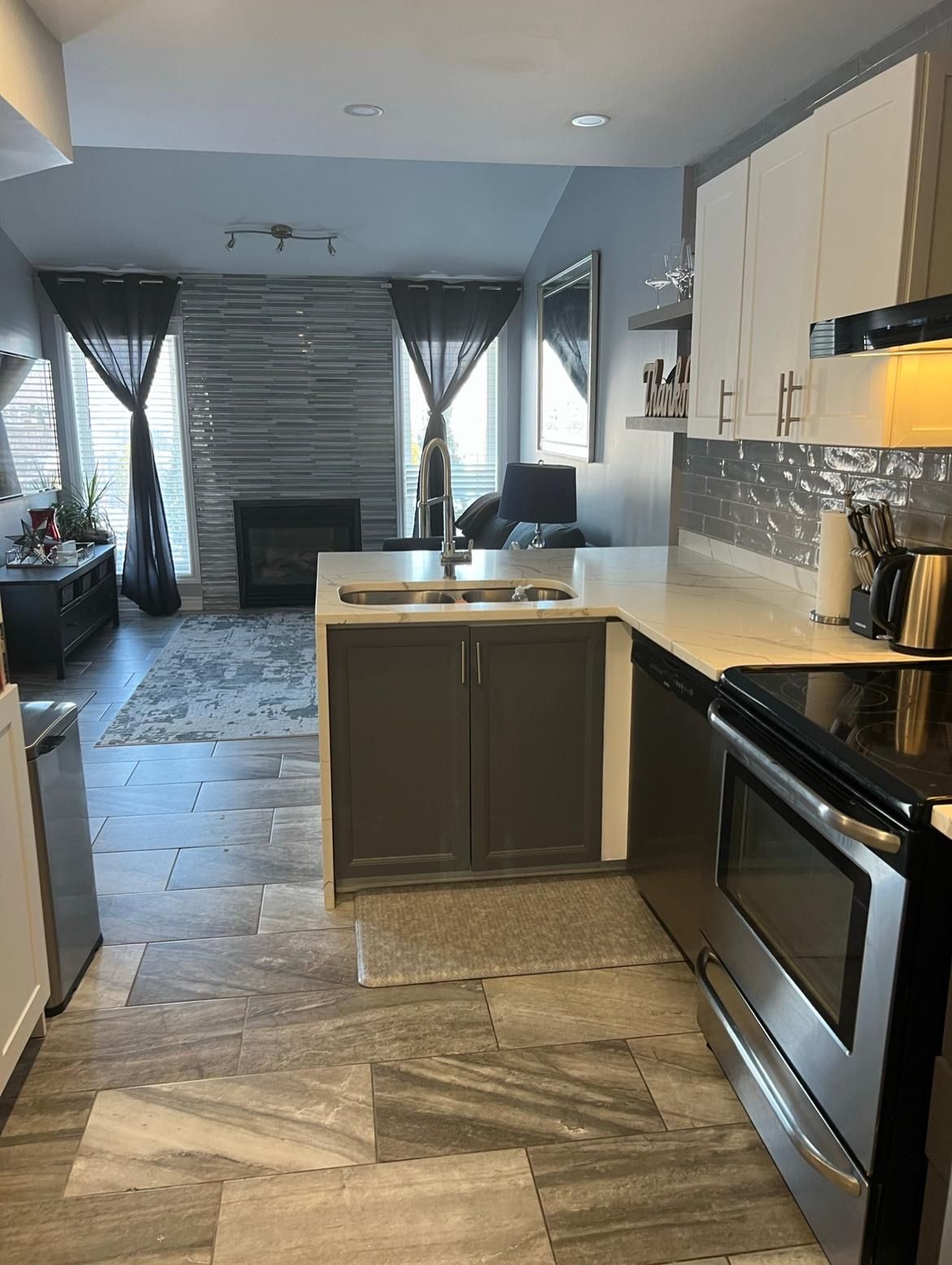 • Modern kitchen with dining area and cozy gas fireplace.
