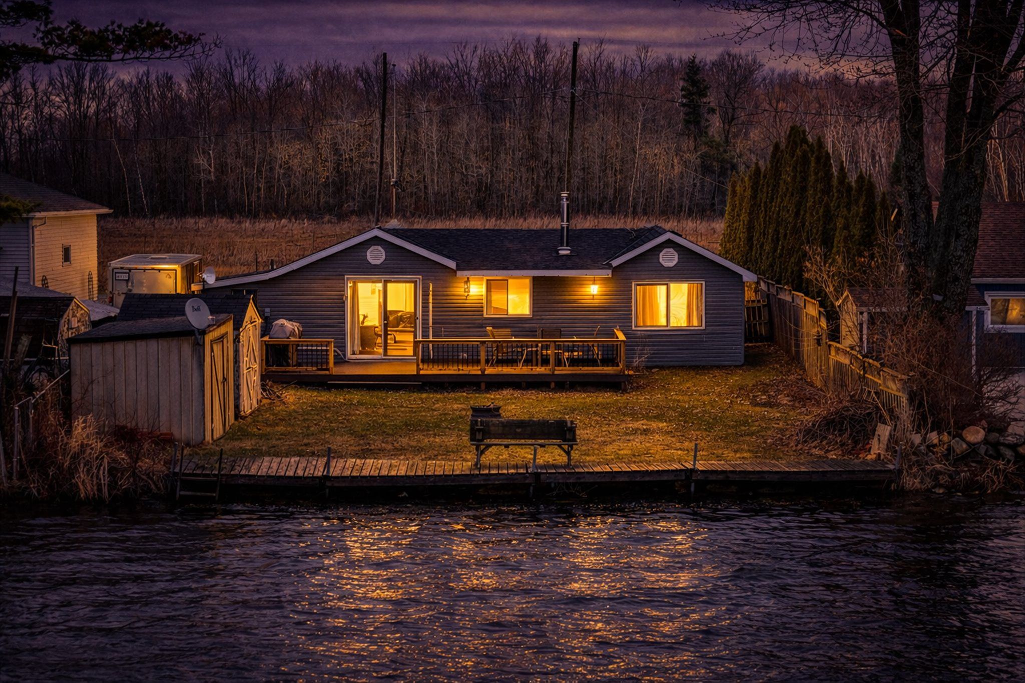 • Private lot with a covered patio and large storage shed.