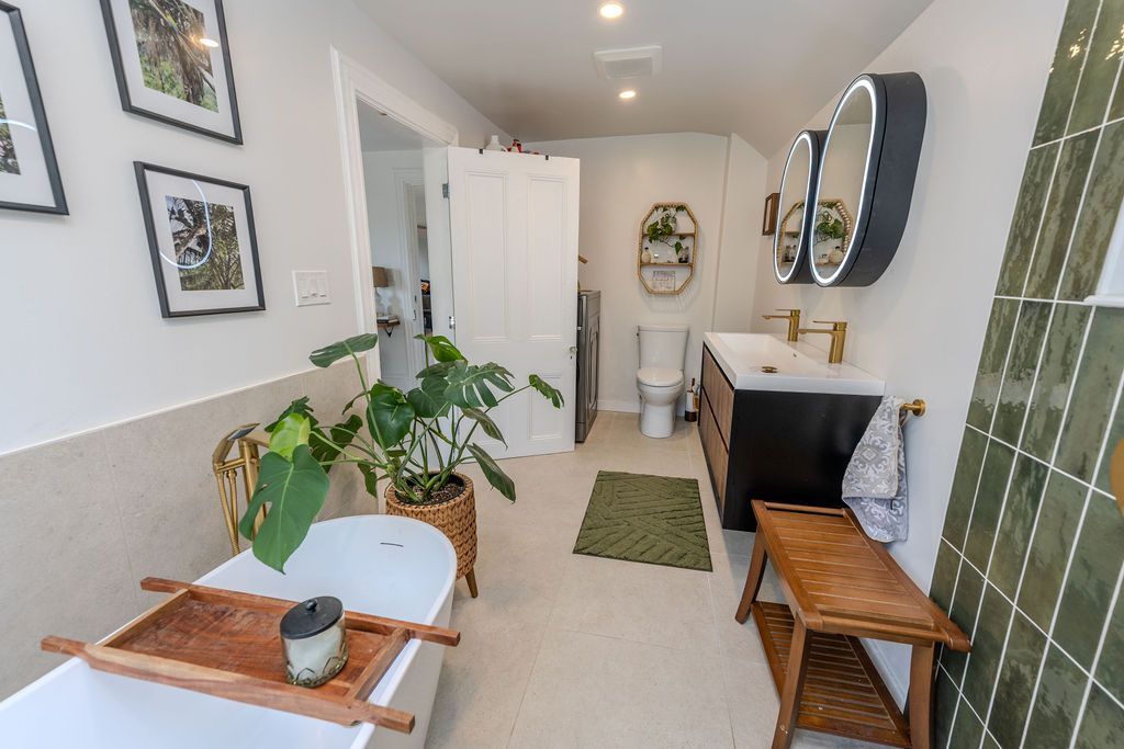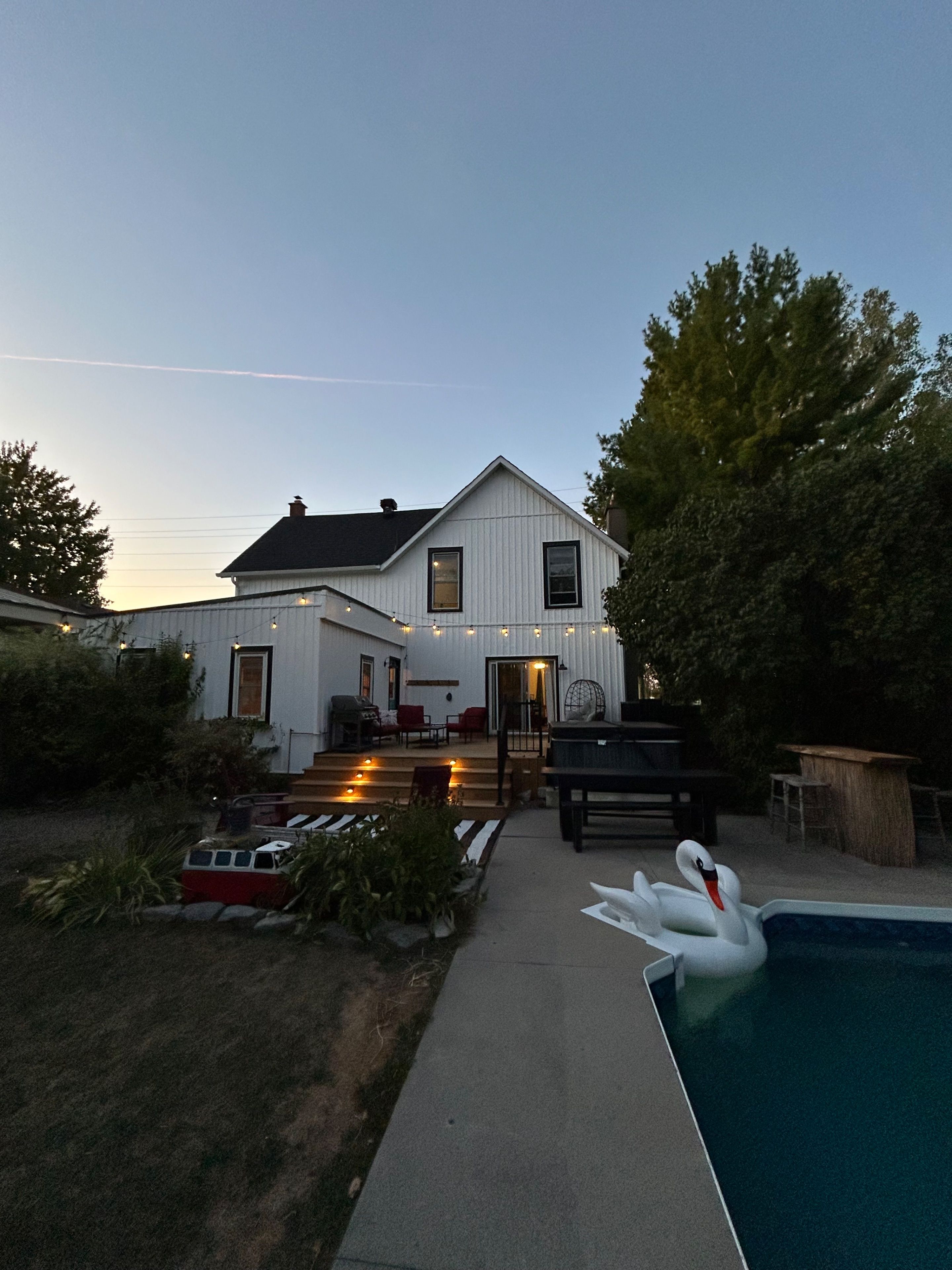 • Private backyard oasis with an expansive deck, inground pool, and hot tub.