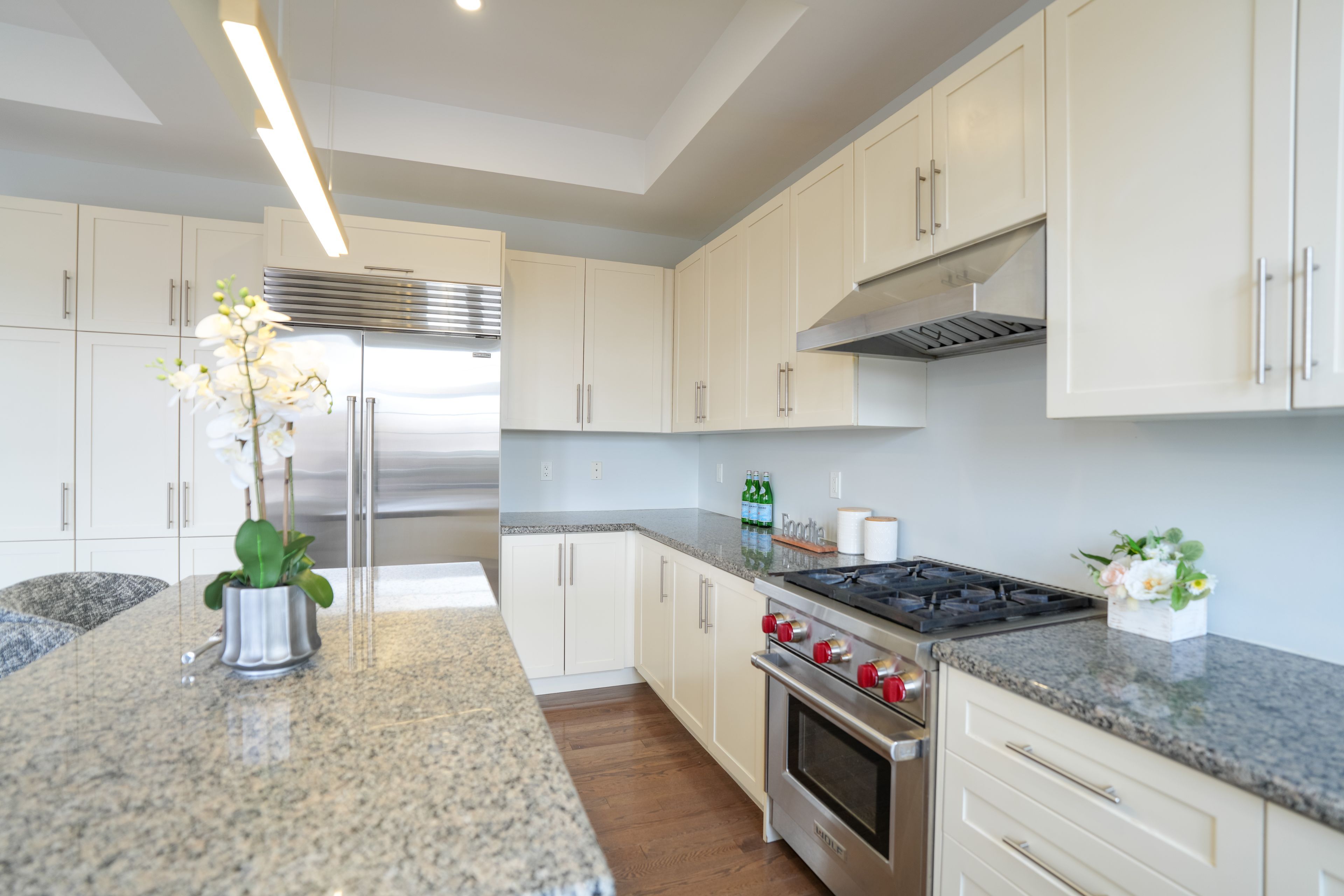 • Modern eat-in kitchen with stainless steel appliances and ample counter space.