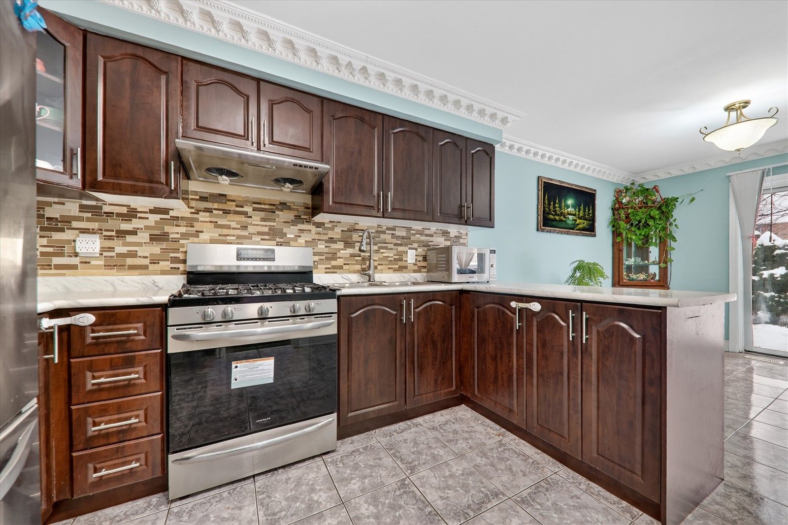 • Renovated kitchen features stainless steel appliances and backsplash.