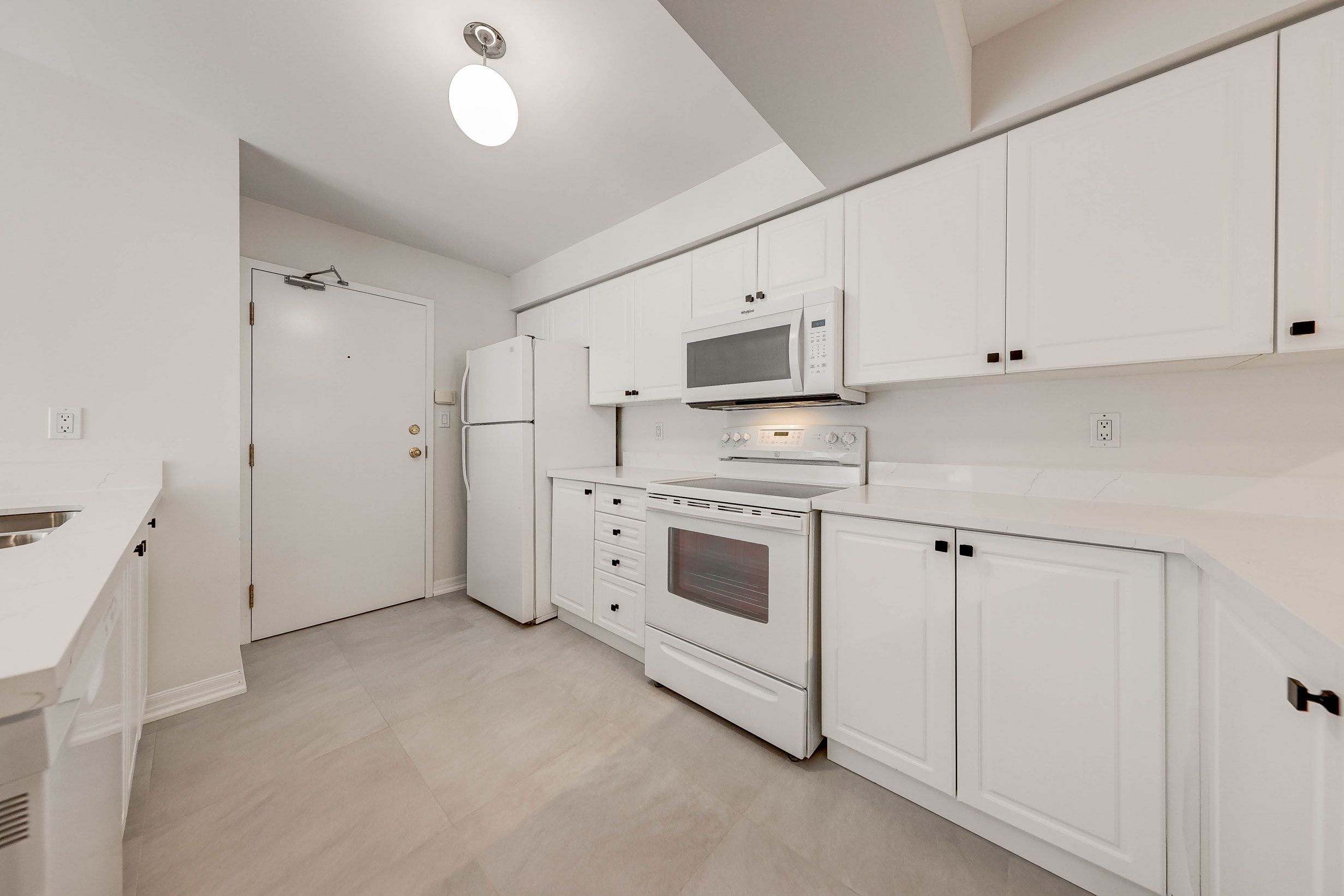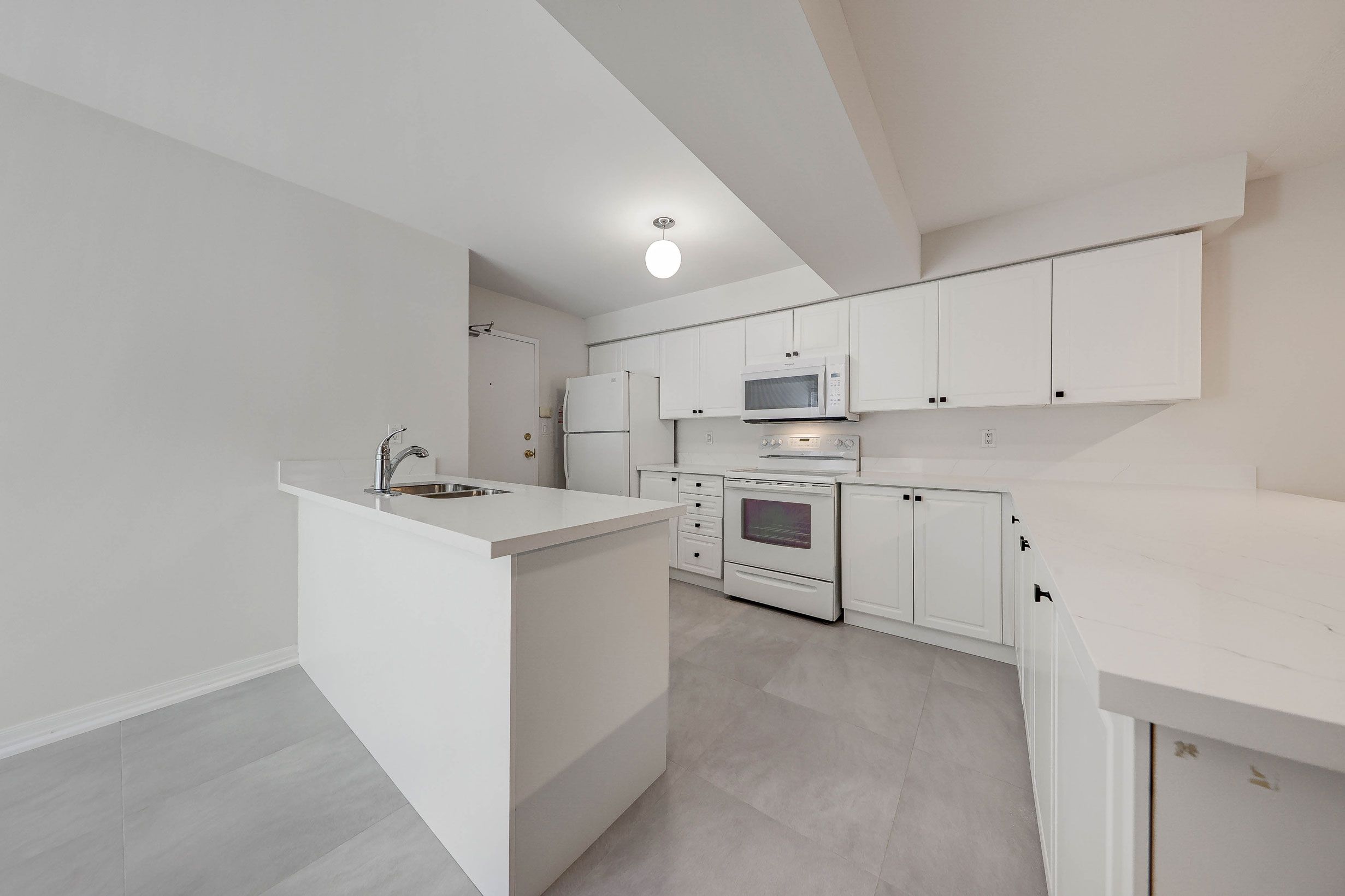 What a great value, almost 1500 sqft of living space. Steps from public transit, community center , public park, restaurants and supermarkets. A large living and dining combination with large window, walkout to balcony. Recent updates, brand new kitchen flooring and counter tops with breakfast bar. Spacious breakfast area over looking the morning sun of the east. New lower level flooring and updated ensuites, fresh paint thru/out. Spacious primary bedroom with updated 4 pcs ensuite and a large w/i closet, above grade windows bring natural light into space. 2nd bedrooms features new carpet flooring, udpated 3 pcs ensuite and large above grade windows. 2 underground parking. Furnace and water heater (2025), ac (2019), washer & dryer (2025), otr microwave (2025).