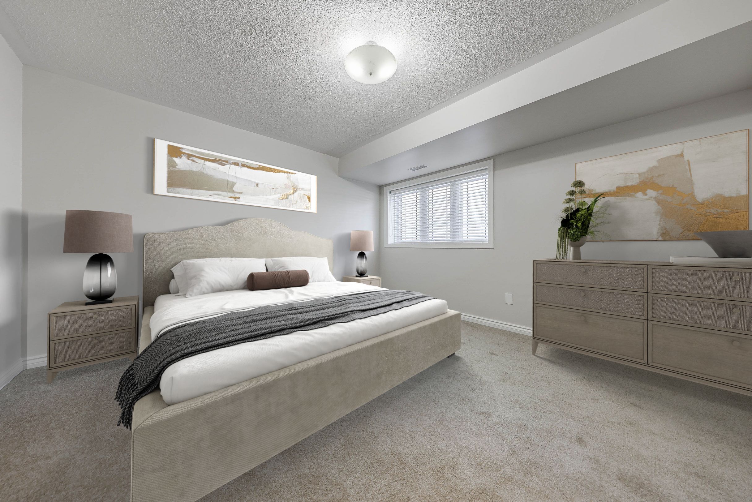 • Spacious primary bedroom with large windows and a walk-in closet.
