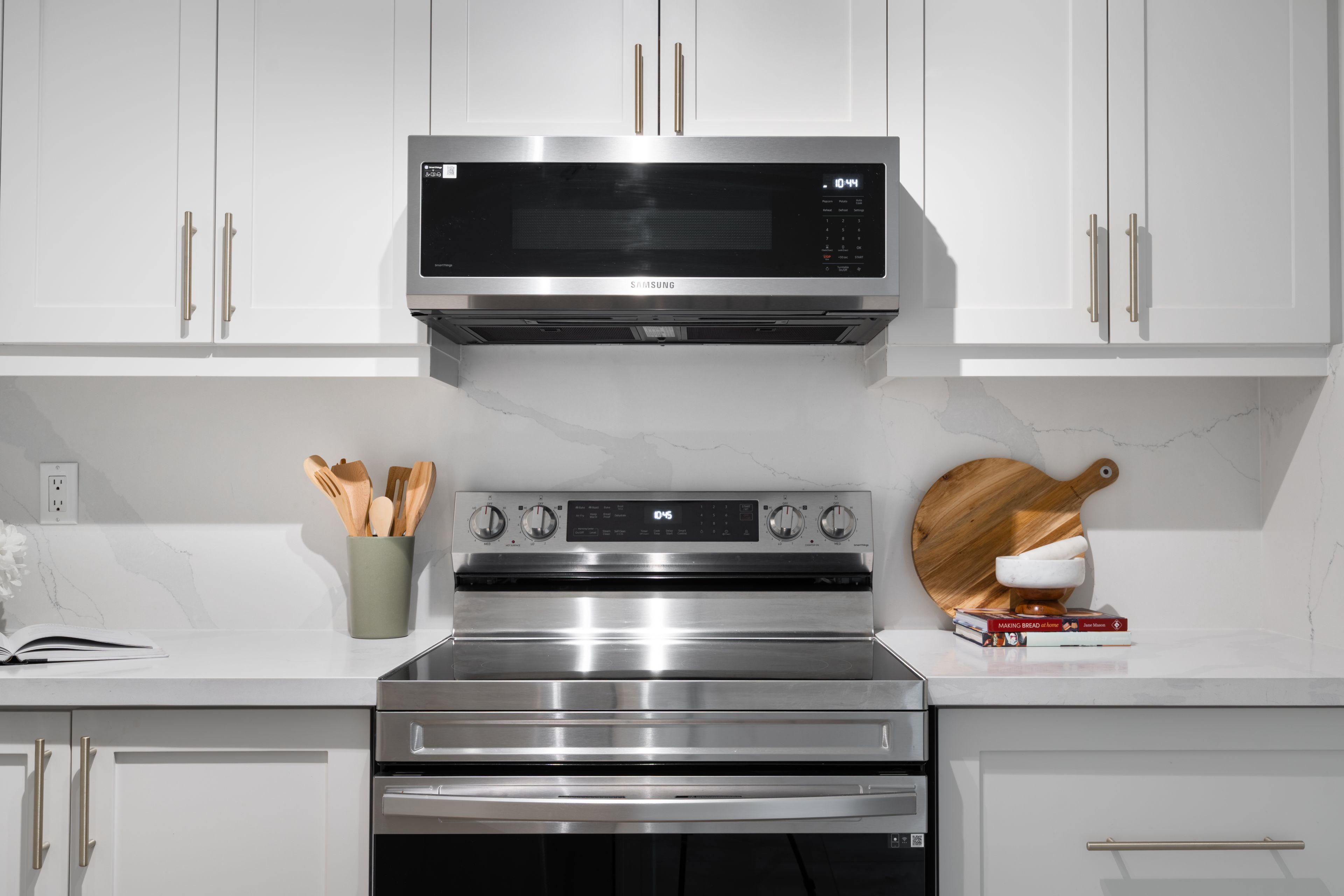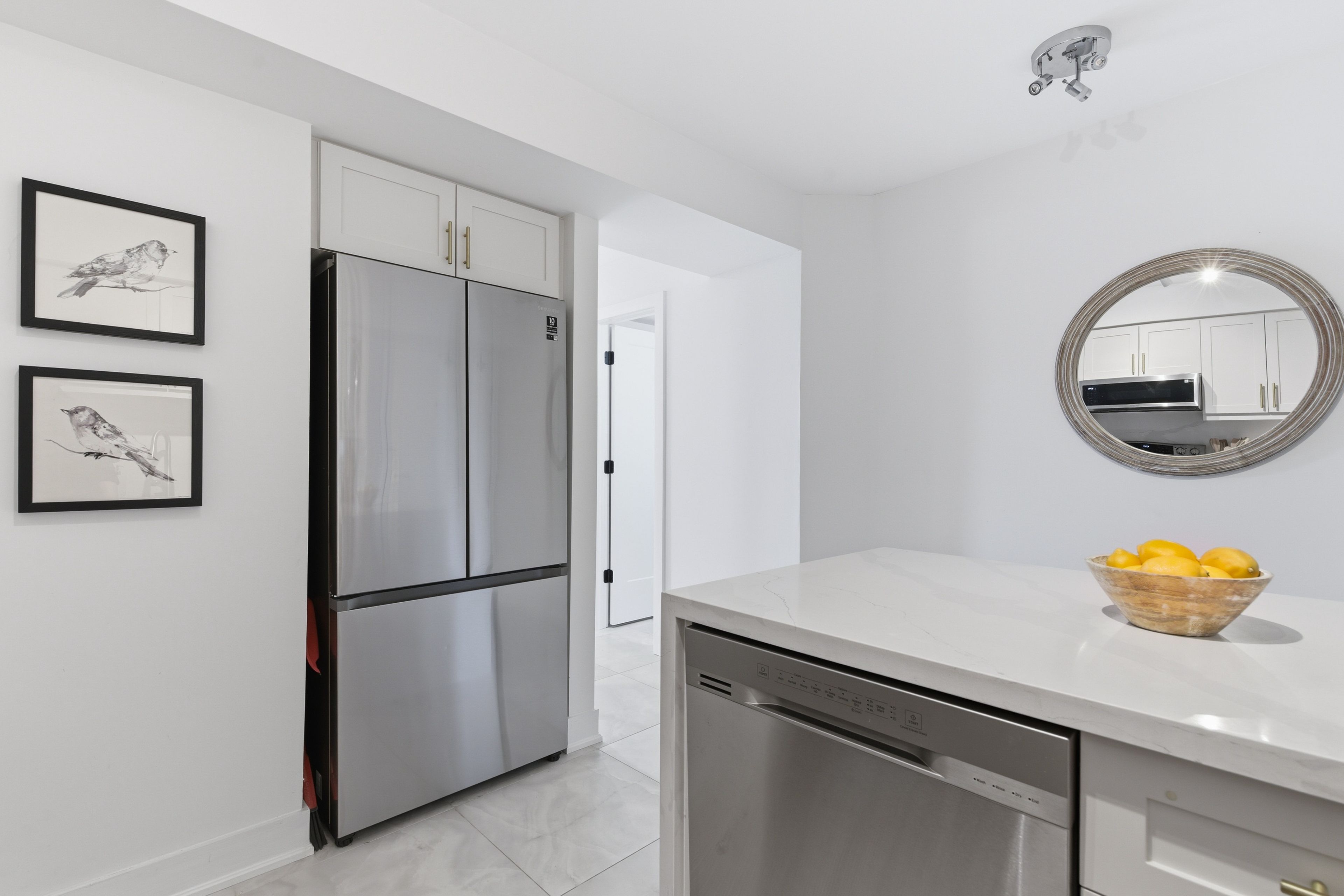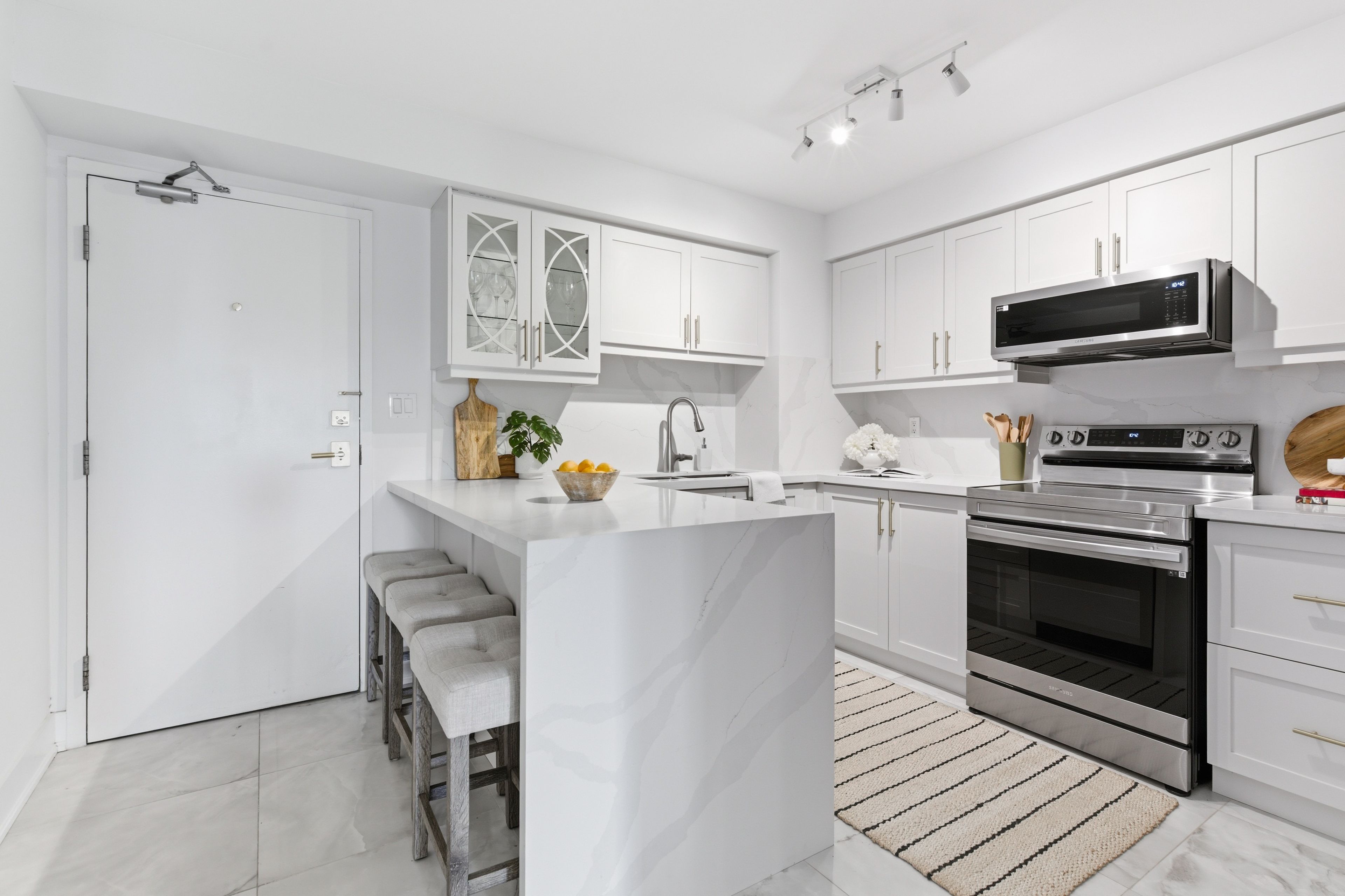 • Spacious kitchen with quartz countertops and ample prep space.