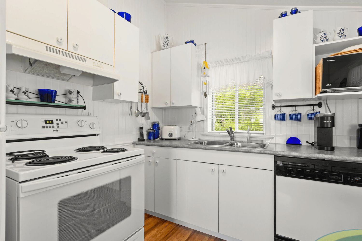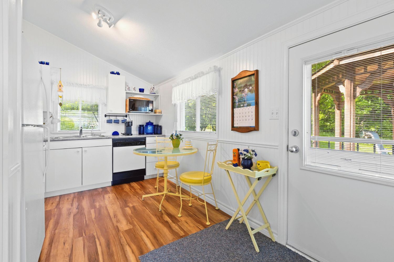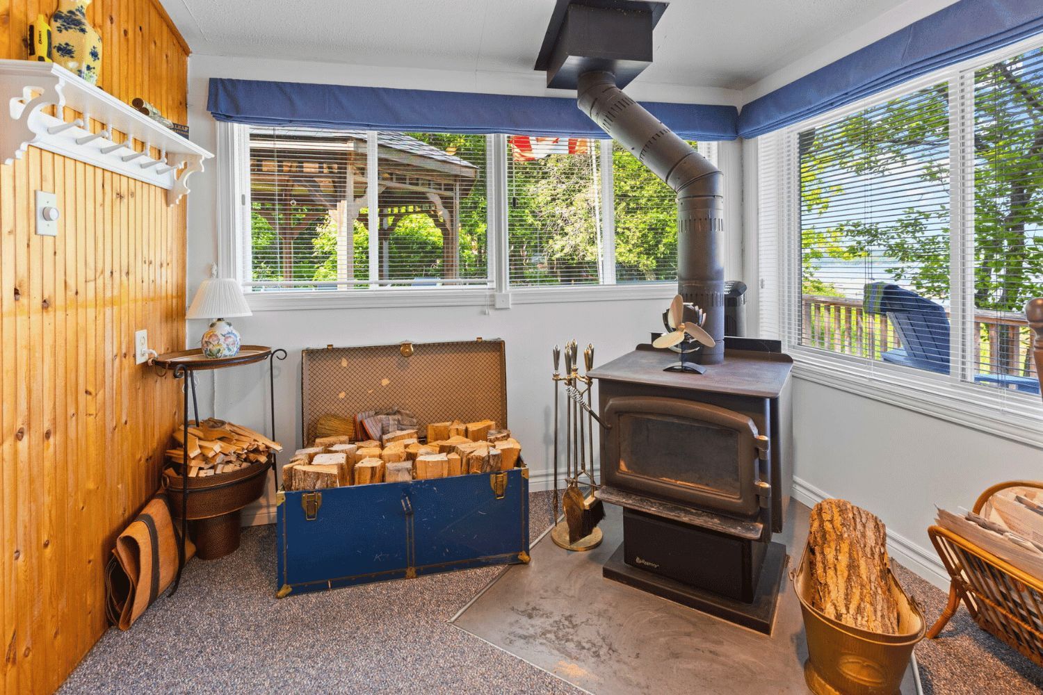 • Bright kitchen and cozy dining area with a wood stove.