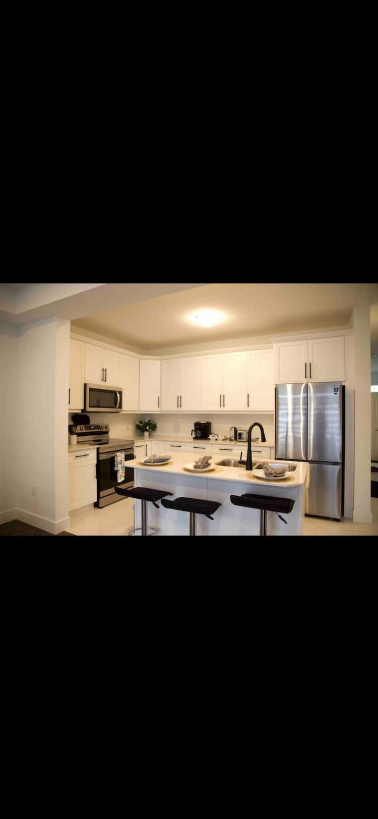 • Modern kitchen with stainless steel appliances and quartz countertops.