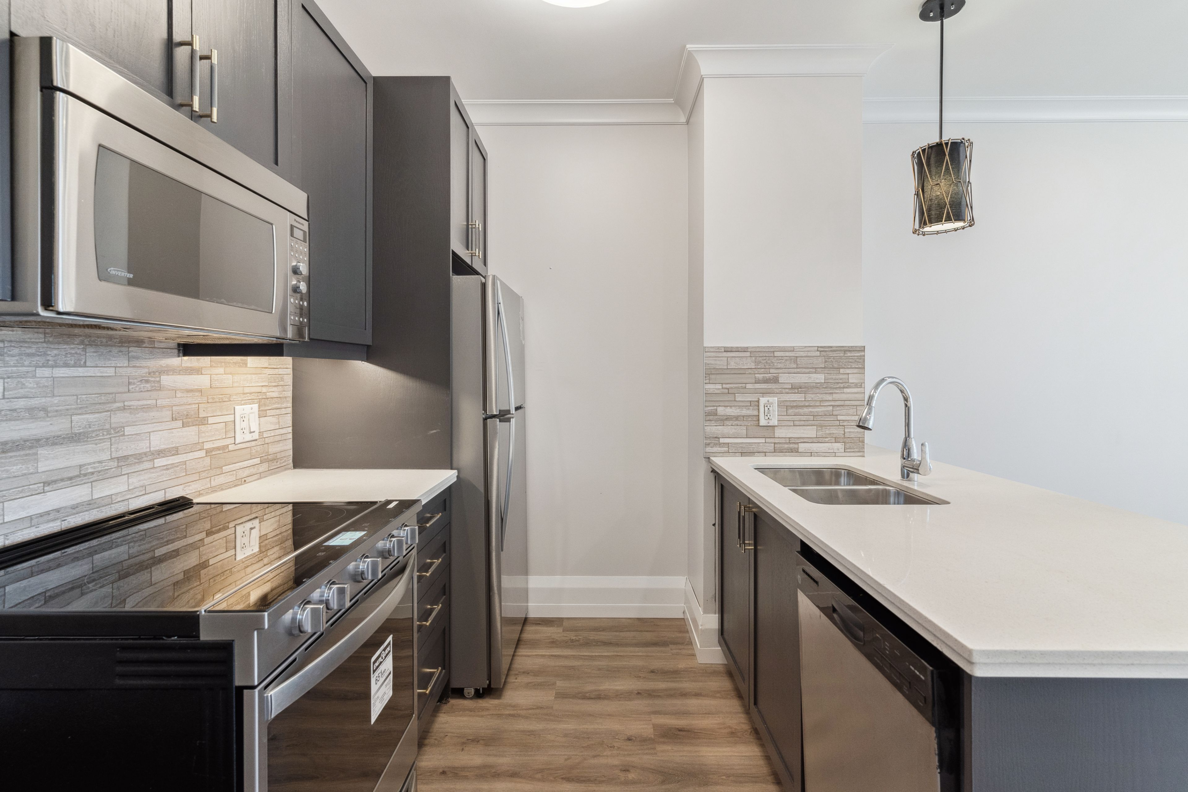• Functional kitchen featuring quartz countertops and stainless steel appliances.