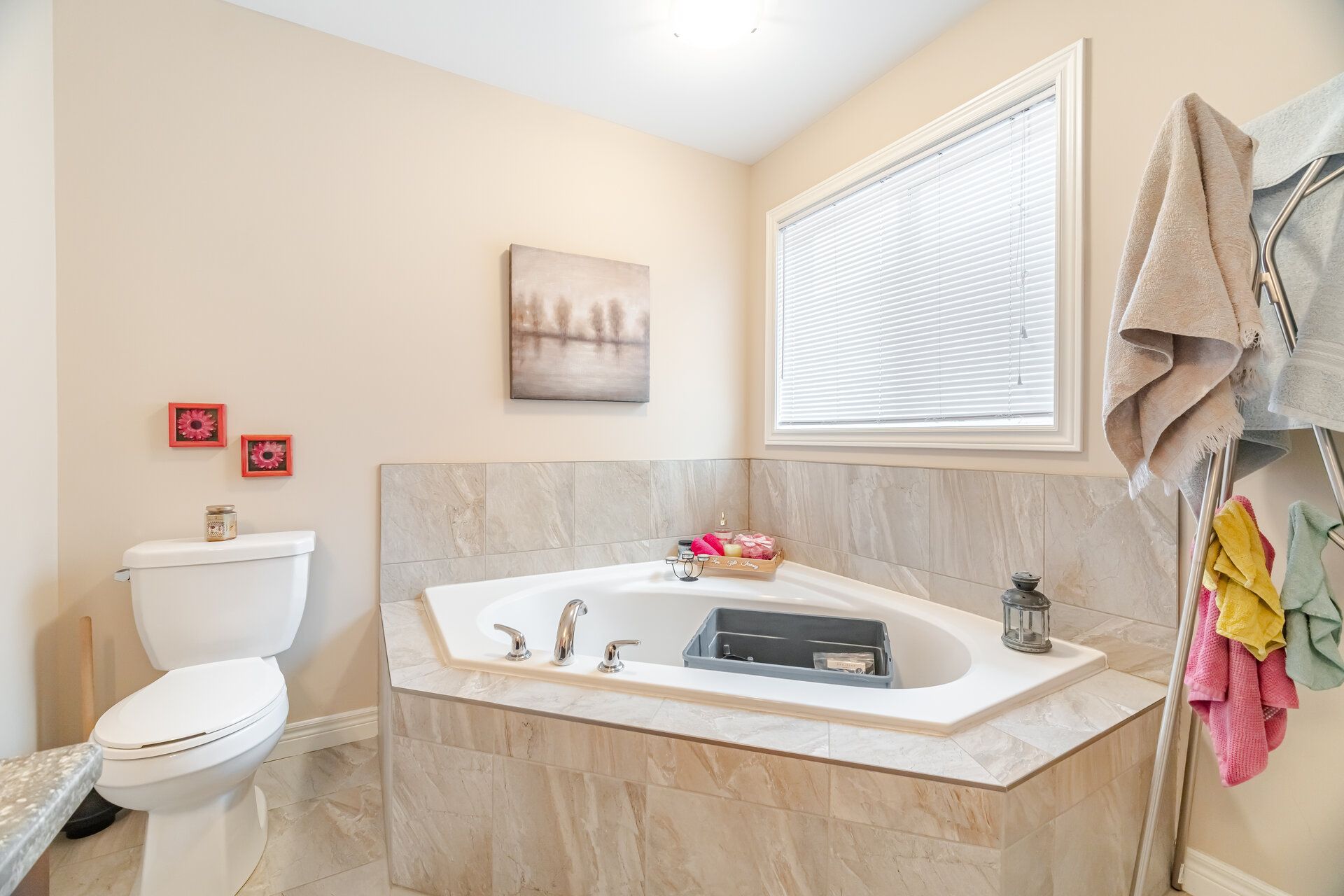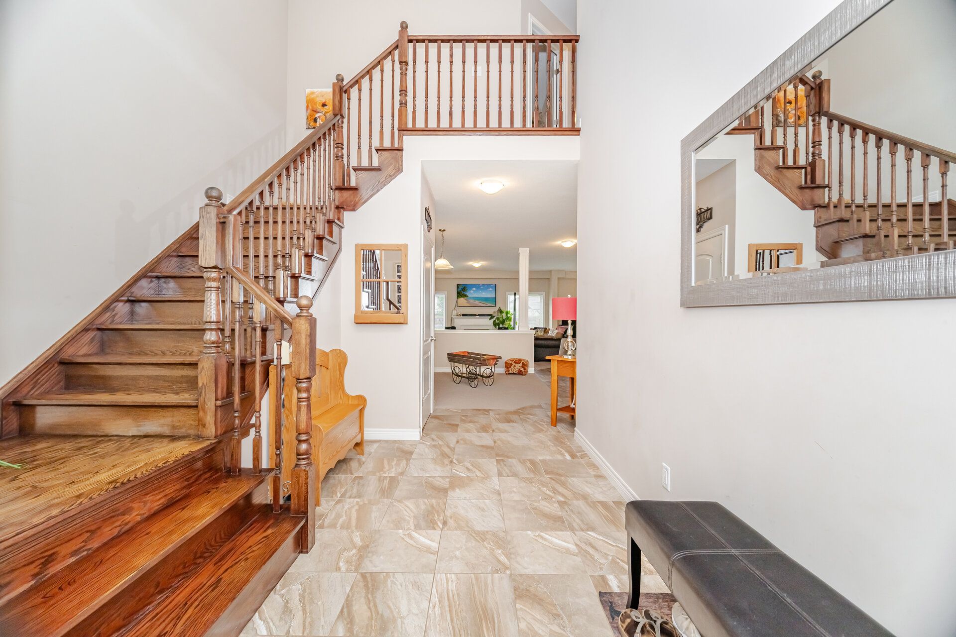 Tucked away on a quiet, low-traffic street, this home and neighbourhood offer privacy & peaceful living , just a stones throw from a large park, 4 bedroom home, approx 2587 sq ft, with grand two-storey entryway with soaring 18' ceilings with bright and open feel throughout the home. The main floors large windows with natural light, open-concept design, main level offers a spacious and versatile layout featuring a large living room, formal dining room, and a bright dinette that flows from the kitchen. Main floor laundry room, private fenced backyard,just 3 minutes from the costco power centre and with quick qew access, this home offers incredible convenience in a family-friendly neighbourhood. Move-in ready!
