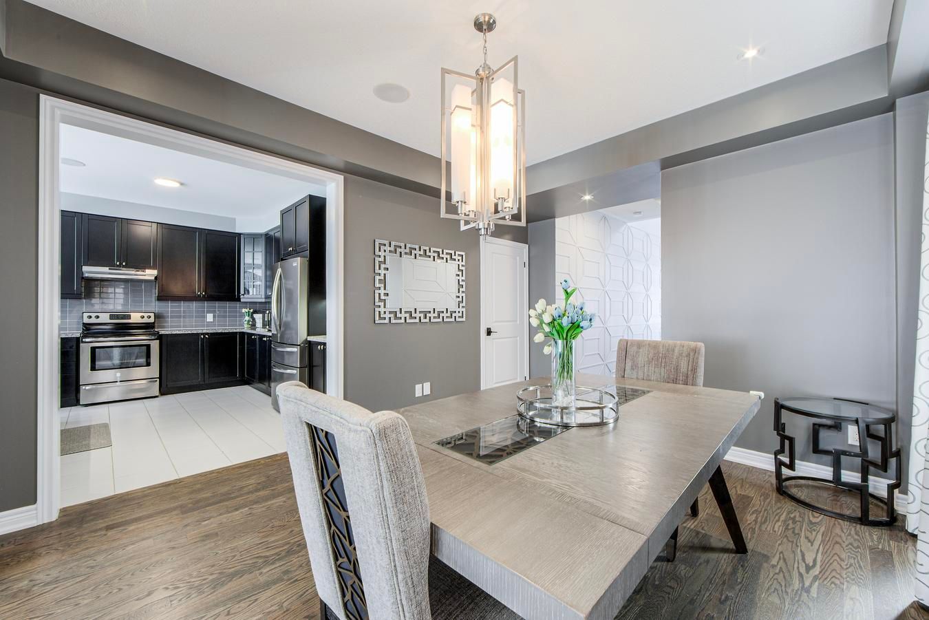 • Granite countertops and stainless steel appliances in the kitchen.