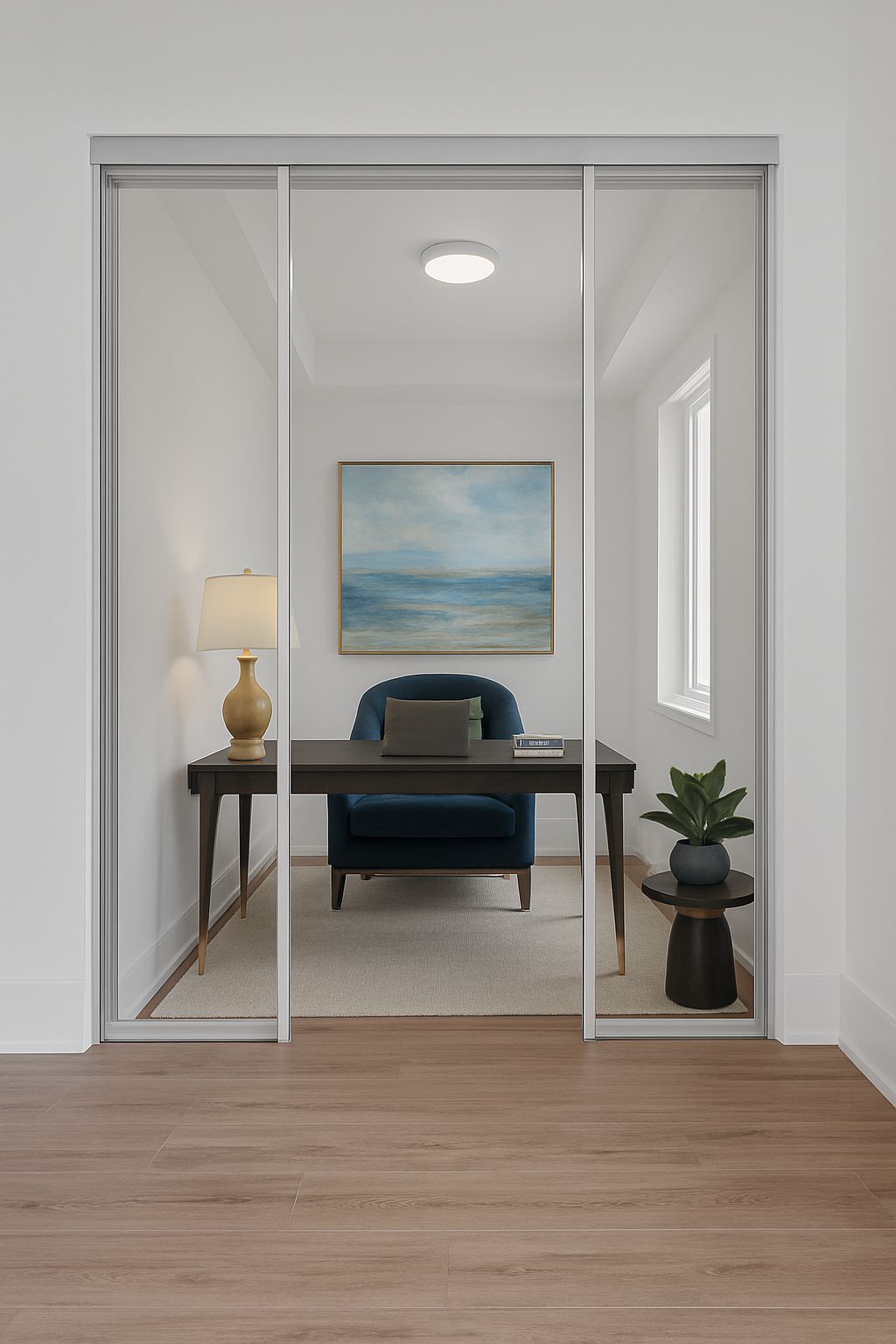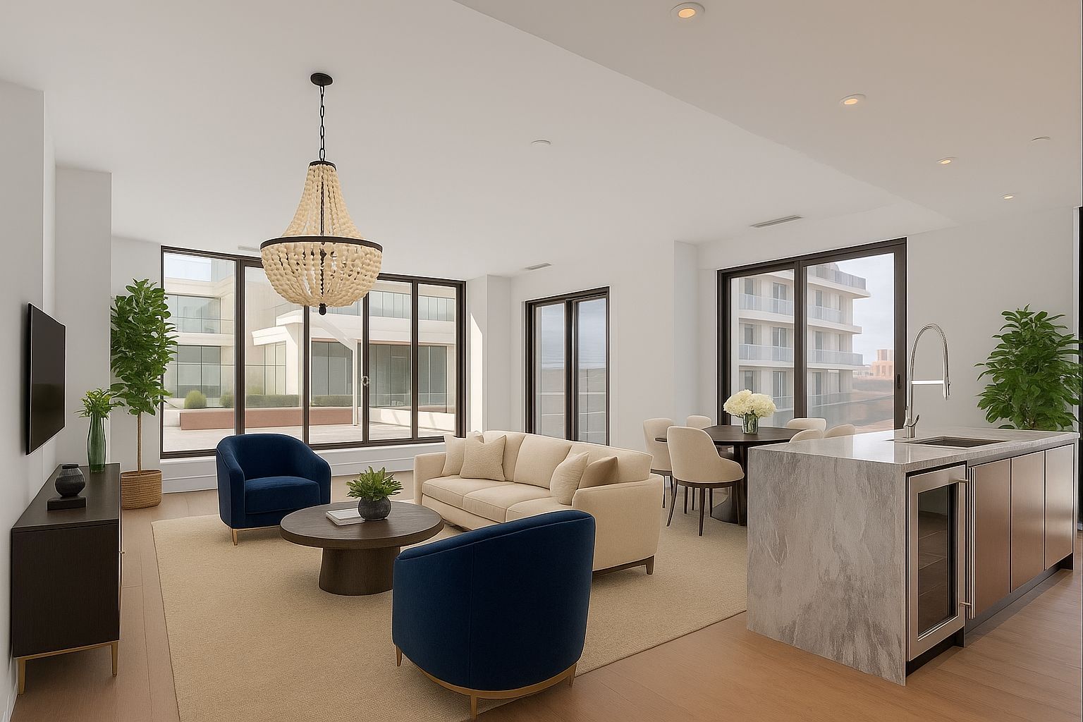 • Bright living space with wide plank white oak flooring and modern finishes.
