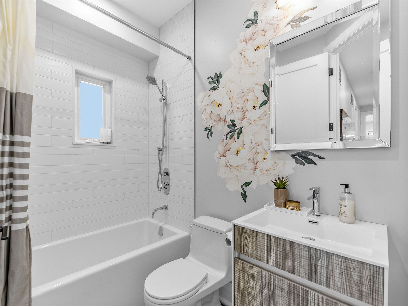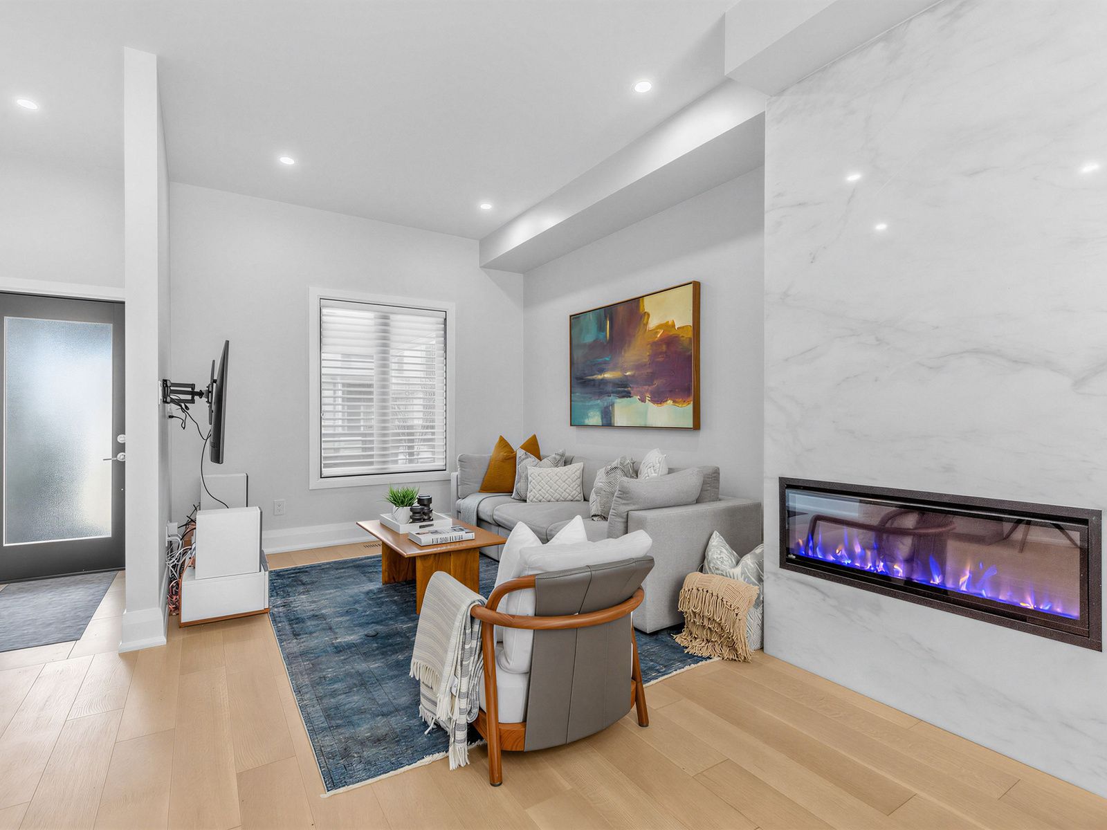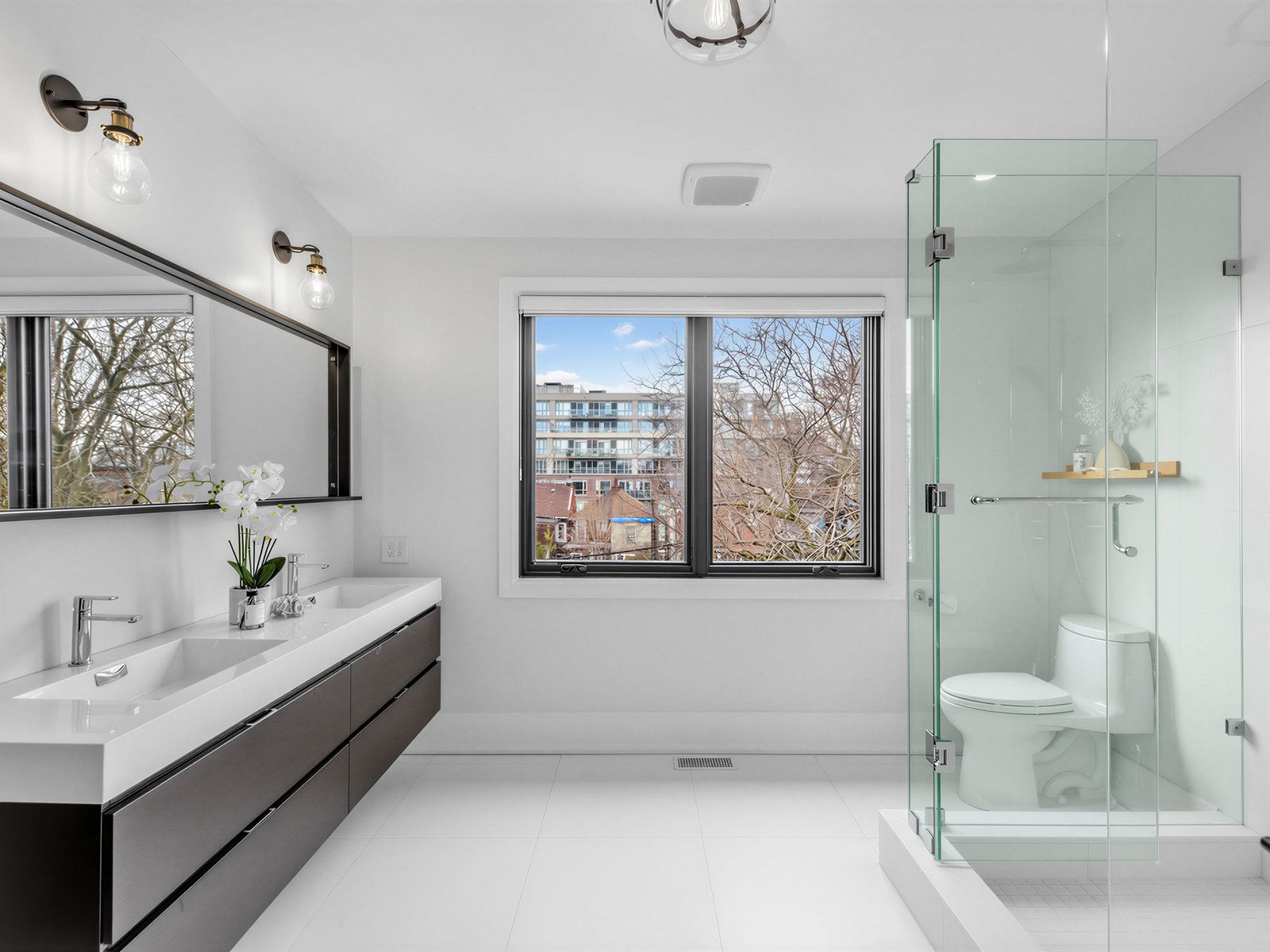 Welcome to this stunning, design-forward home in the heart of leslieville, offering exceptional finishes and a thoughtfully curated layout. The bright, open-concept main floor features soaring 10' ceilings, wide-plank white oak flooring, and a sleek electric fireplace set within a marble surround. Large east and west-facing window fills the space with natural light, while the modern staircase with glass railings adds architectural elegance. The chef-inspired kitchen is both stylish and functional, showcasing custom cabinetry with extra-tall uppers, caesarstone countertops, and a porcelain herringbone backsplash. Premium stainless steel appliances, including a gas range, french-door fridge, wine fridge, and integrated dishwasher, elevate the space. A large sliding door opens to the beautifully landscaped backyard-perfect for entertaining. Upstairs, spacious bedrooms offer 9' ceilings, solid wood doors, and custom closet organizers. The primary retreat is a true standout, featuring dramatic vaulted ceilings and a walk-in closet. The spa-like ensuite includes a glass shower with rain head, floating double vanity, and designer fixtures. The exterior is equally impressive with professionally landscaped front and backyards, stone walkways, and a lower patio area in the backyard ideal for relaxing or hosting. Additional highlights include composite front decking with glass railings, backyard deck with gas bbq line, and a custom carport with garage access. A rare blend of modern design, luxury finishes, and prime leslieville living-this spacious home is truly move-in ready.