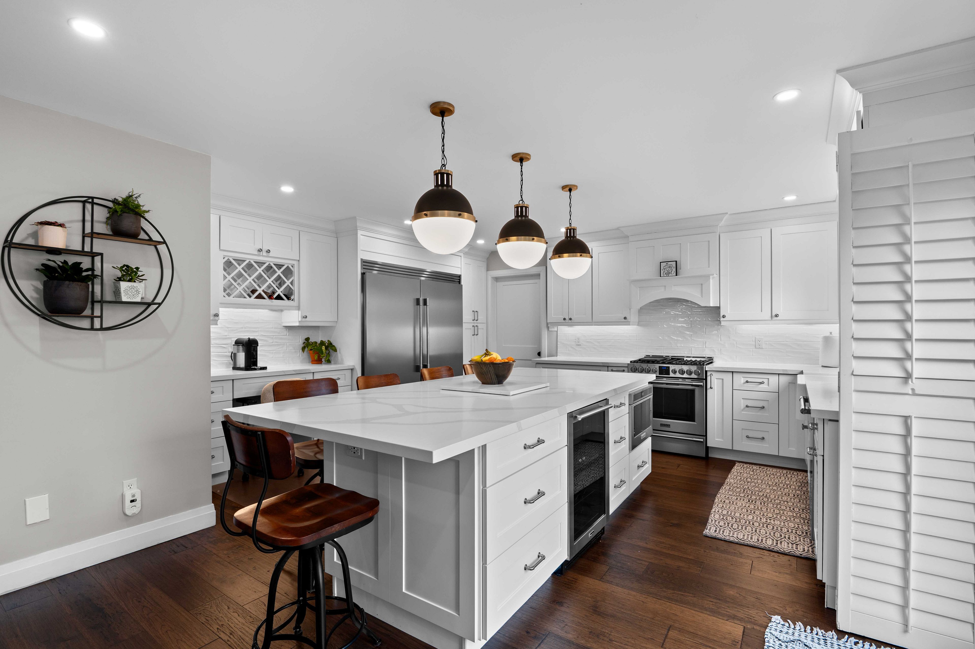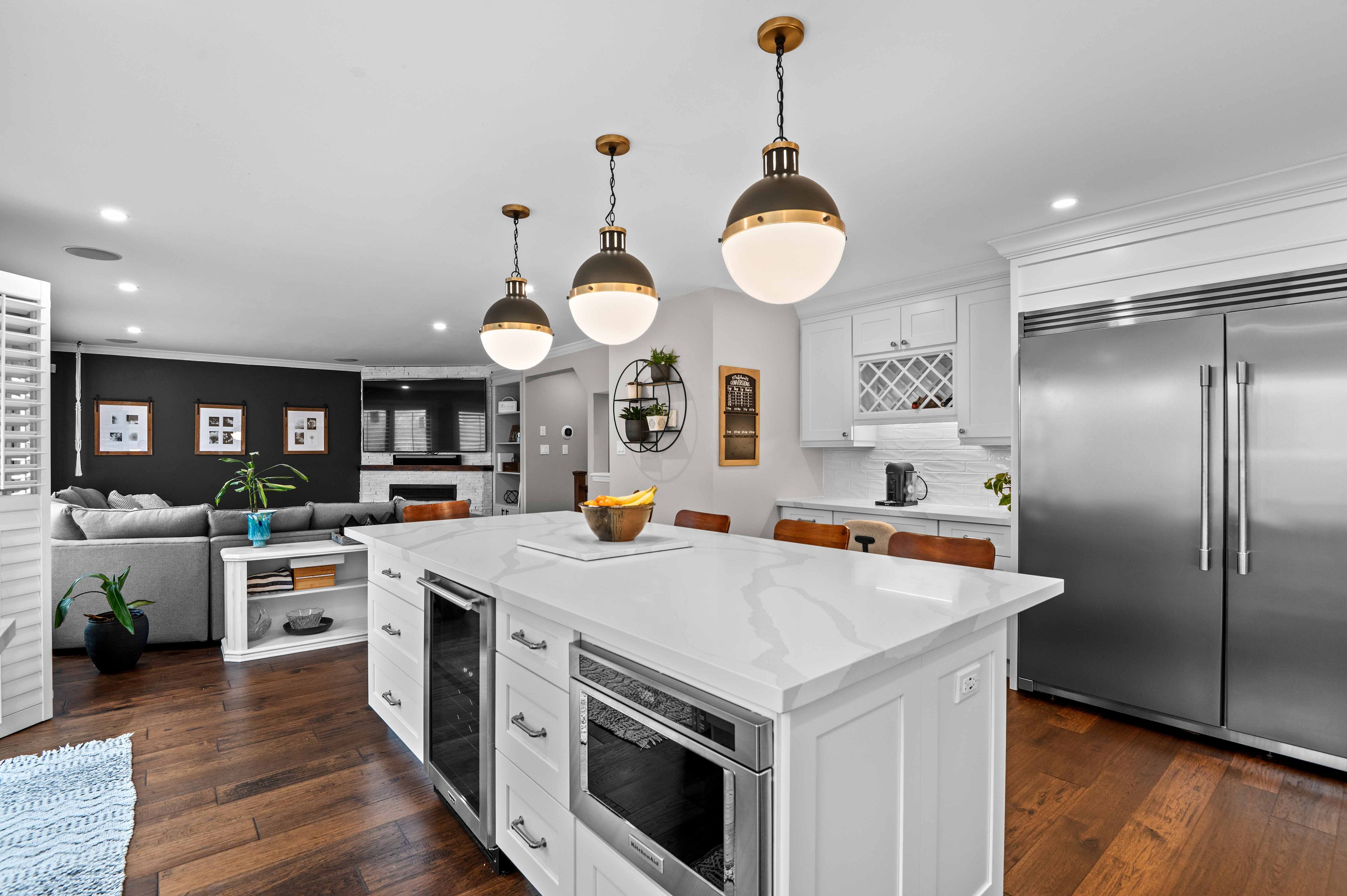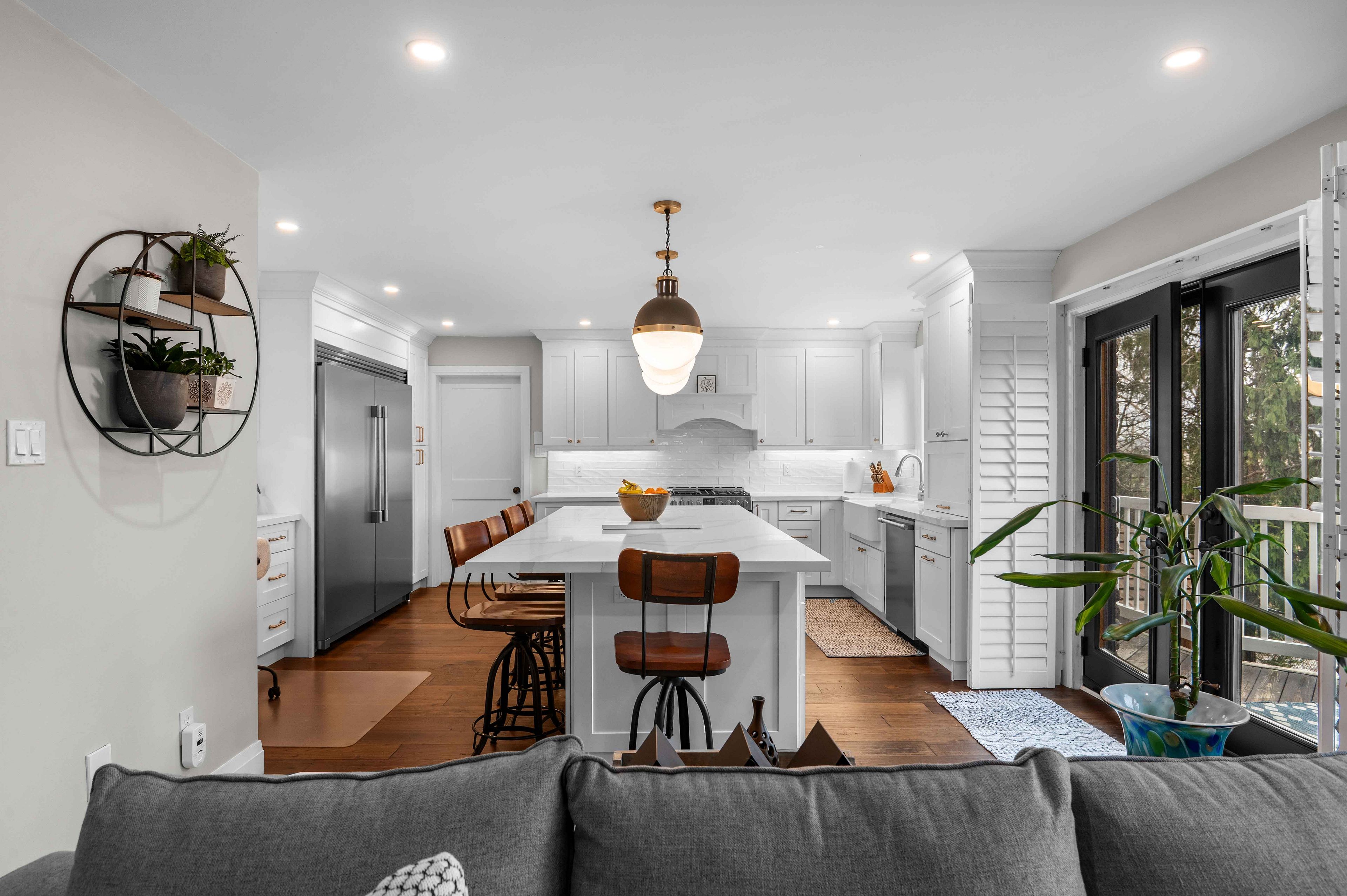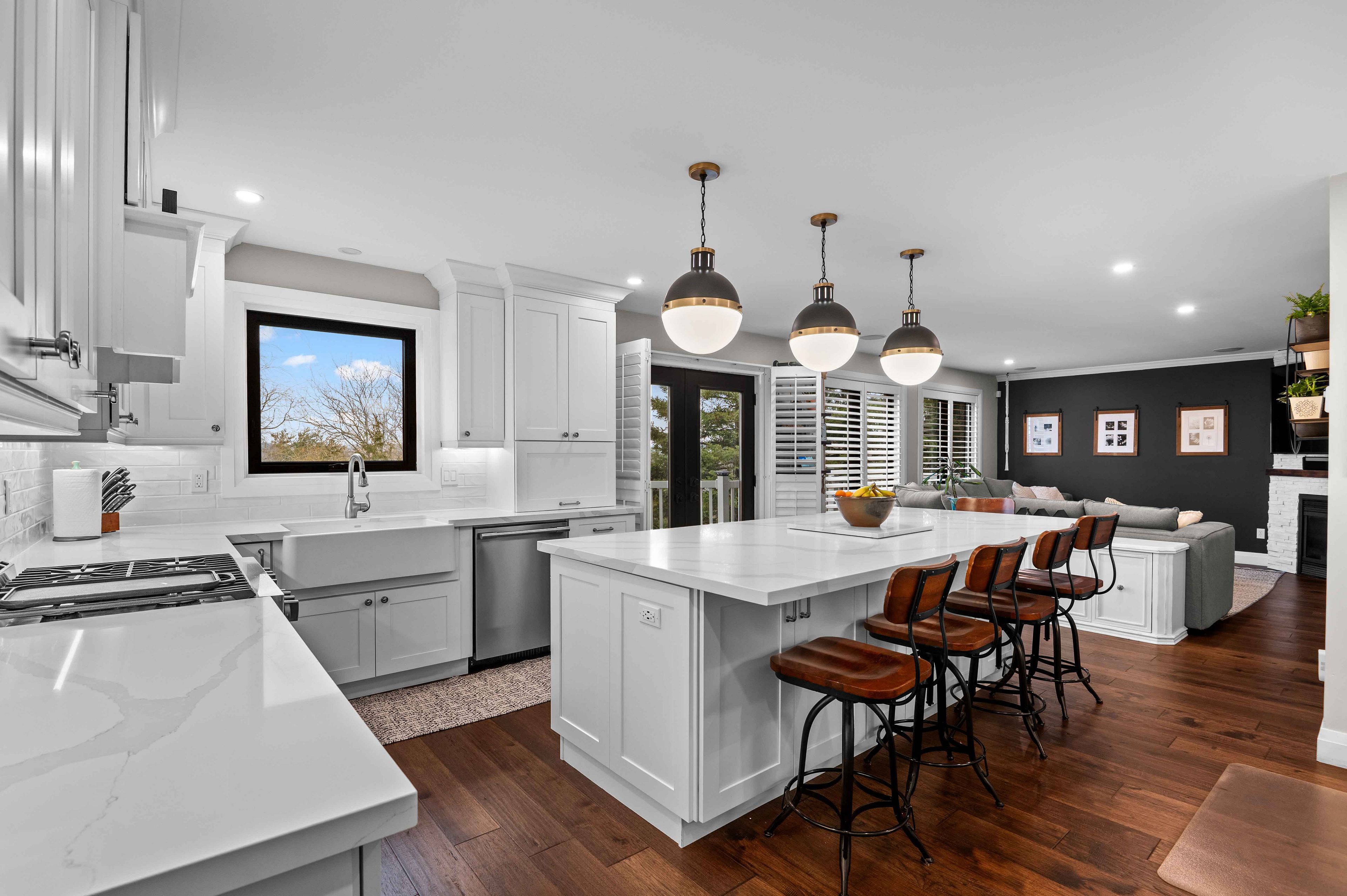 • Massive kitchen island and walk-out deck overlooking a private backyard.