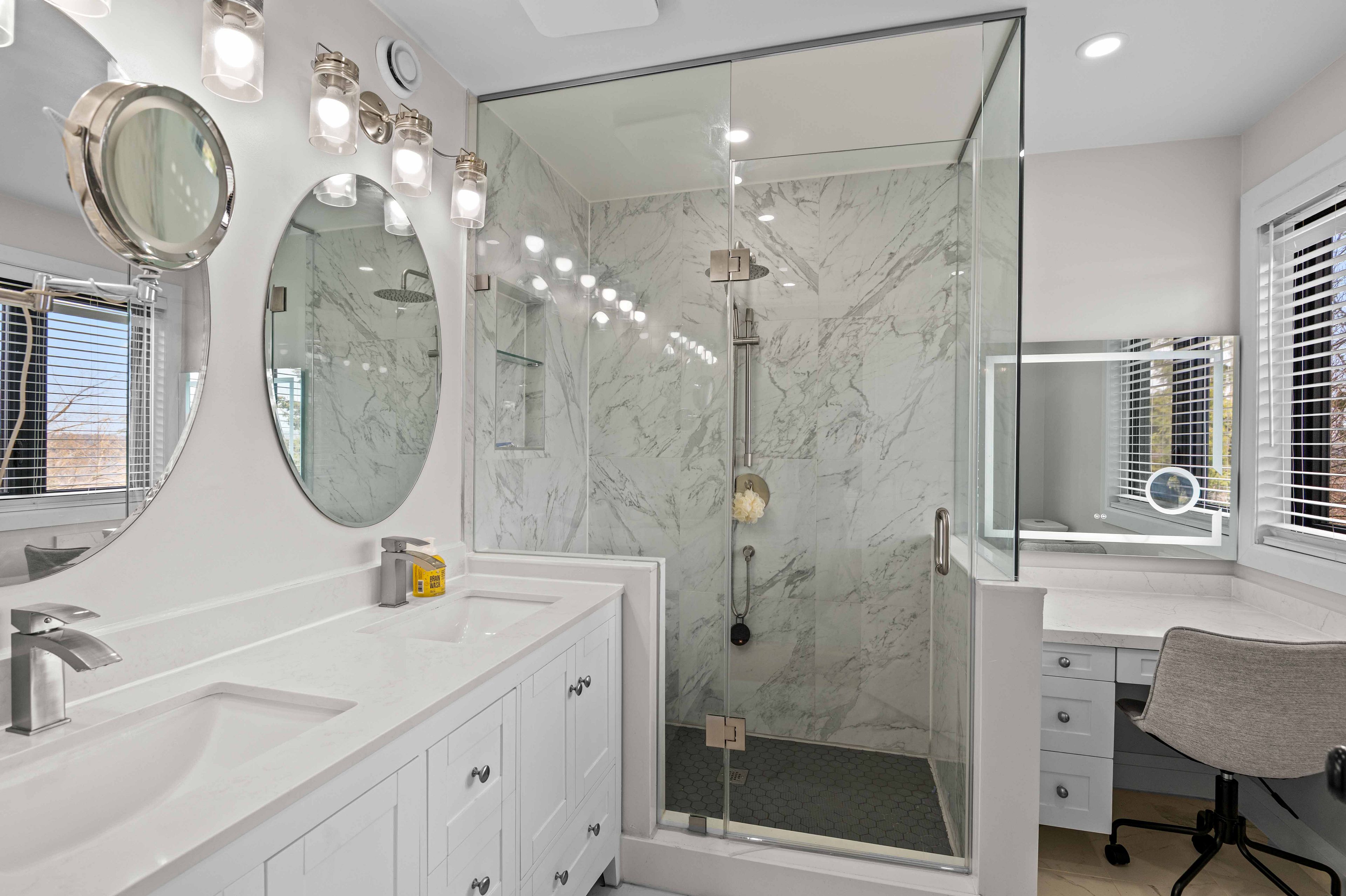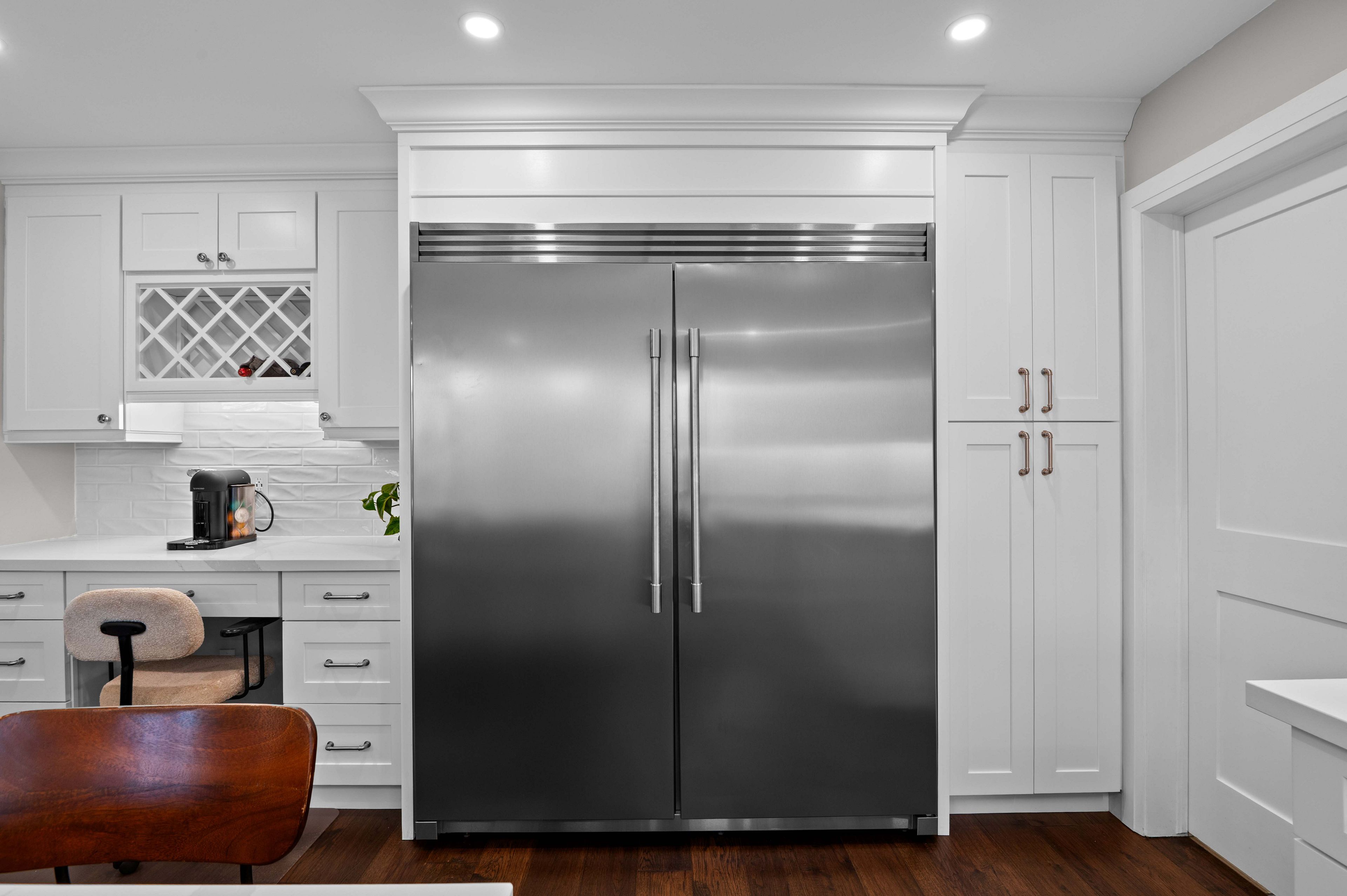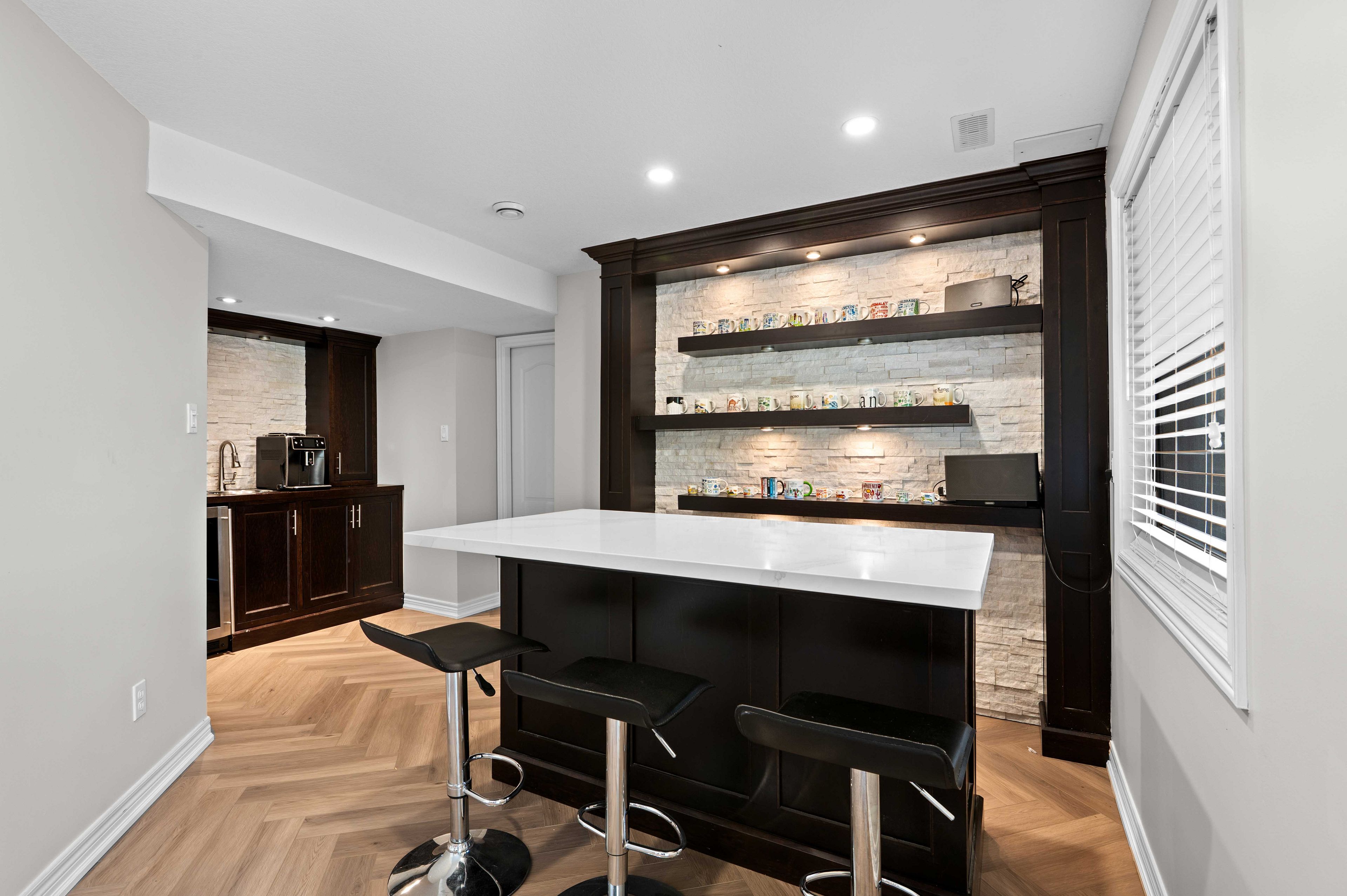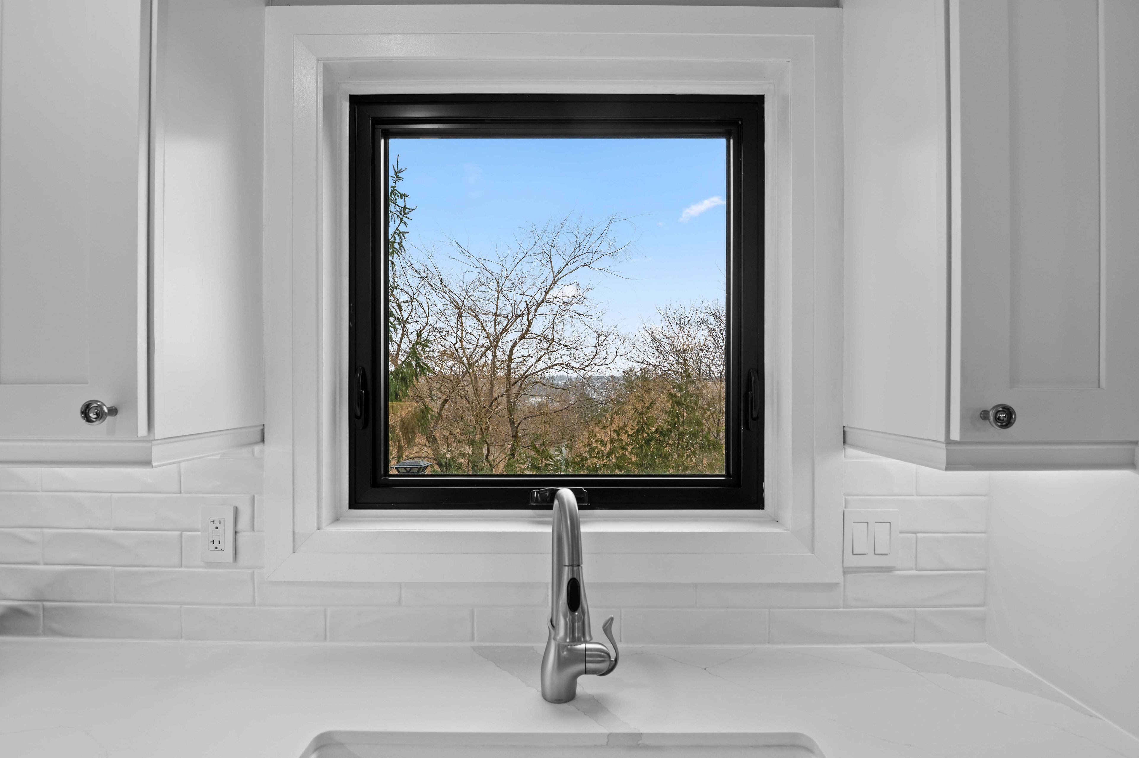 • Massive kitchen island and walk-out deck overlooking a private backyard.