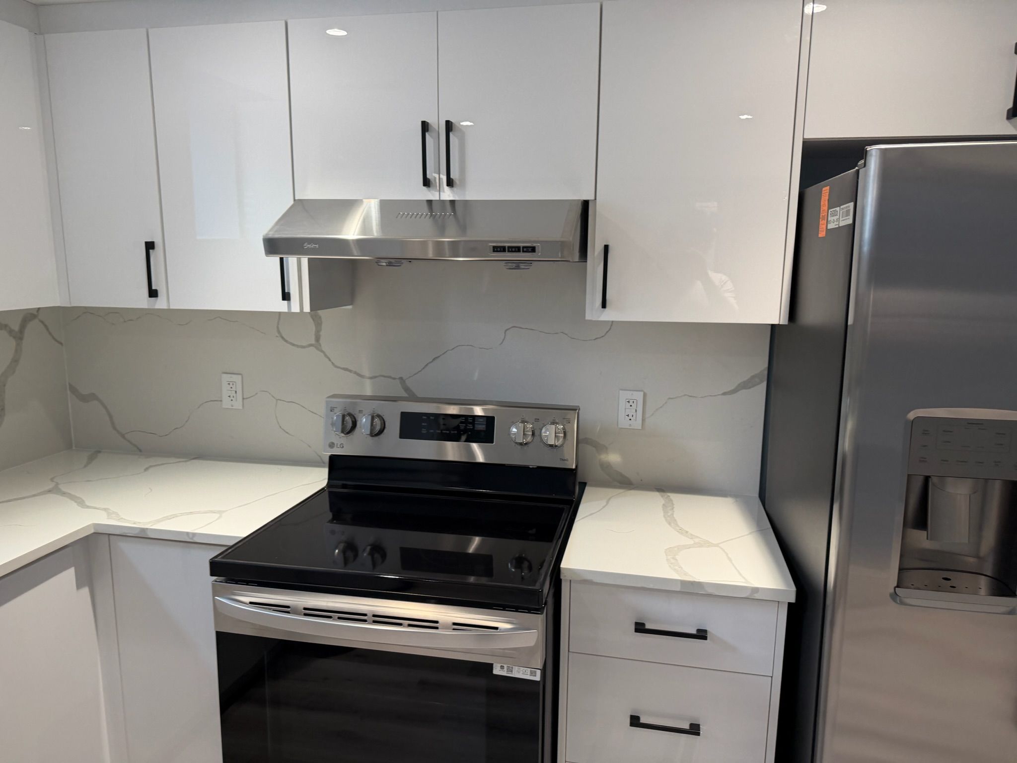 • Modern open-concept design with a stylish all-white kitchen.