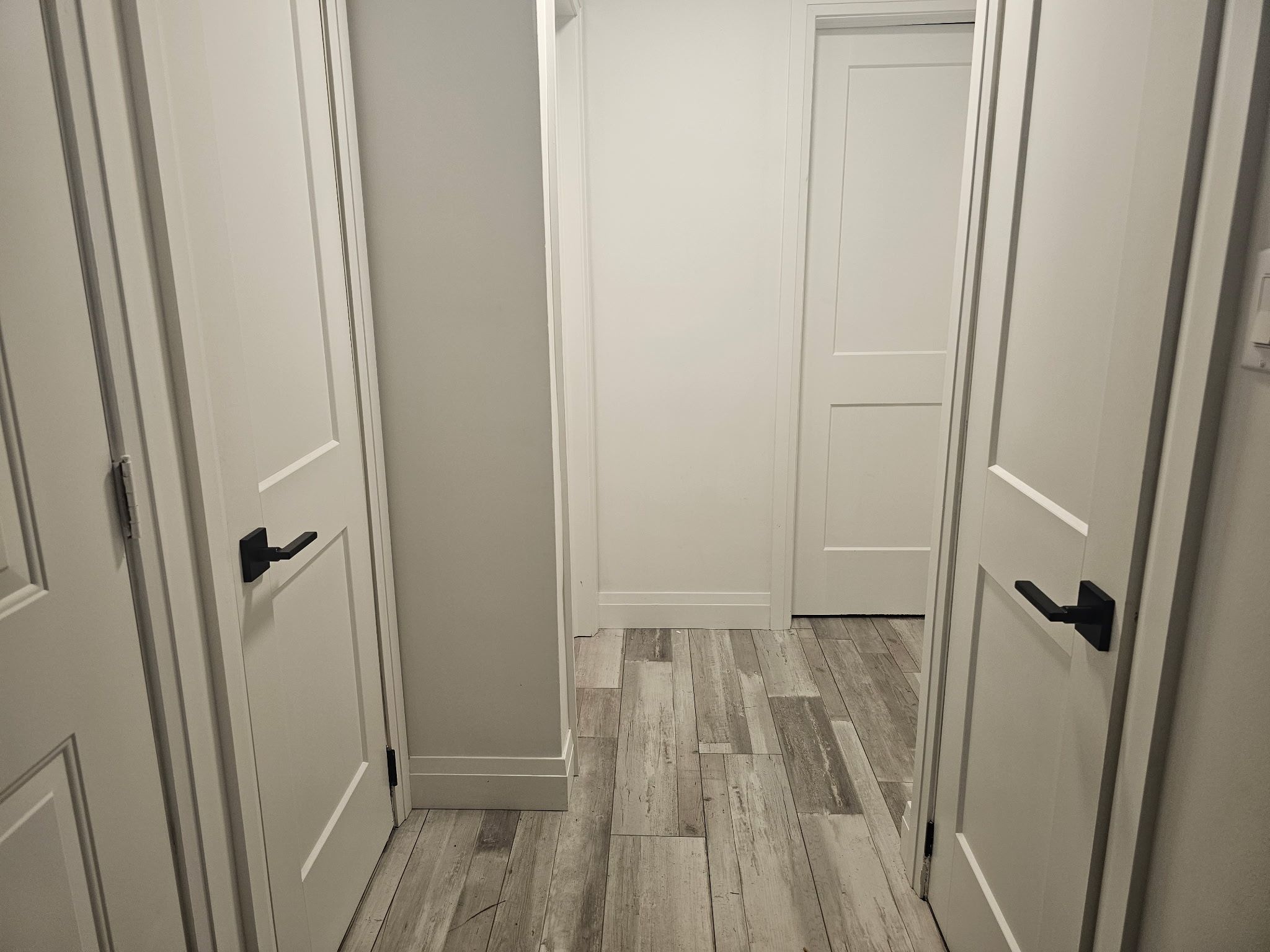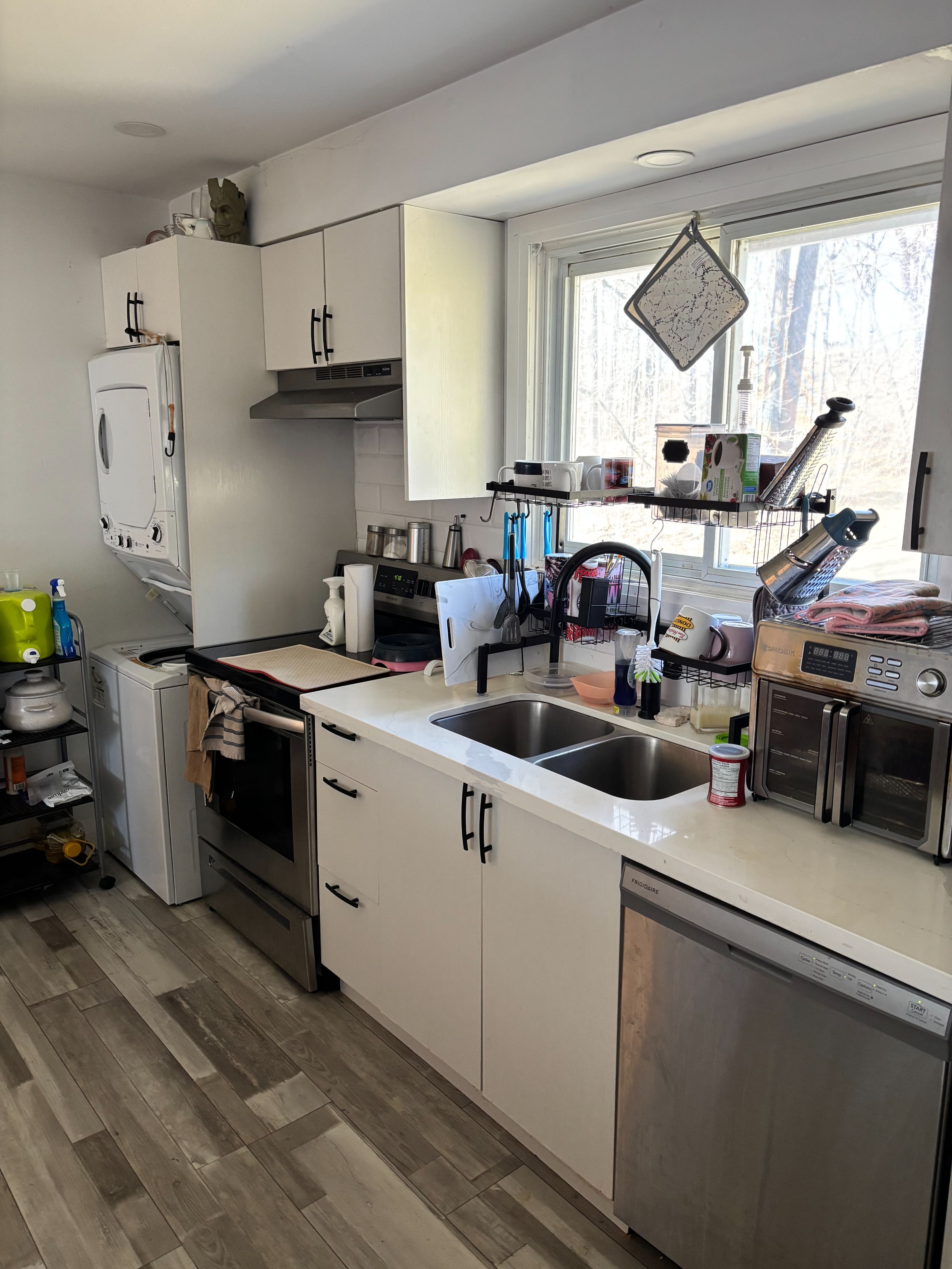 • Modernized kitchen featuring quartz countertops and stylish vinyl plank floors.