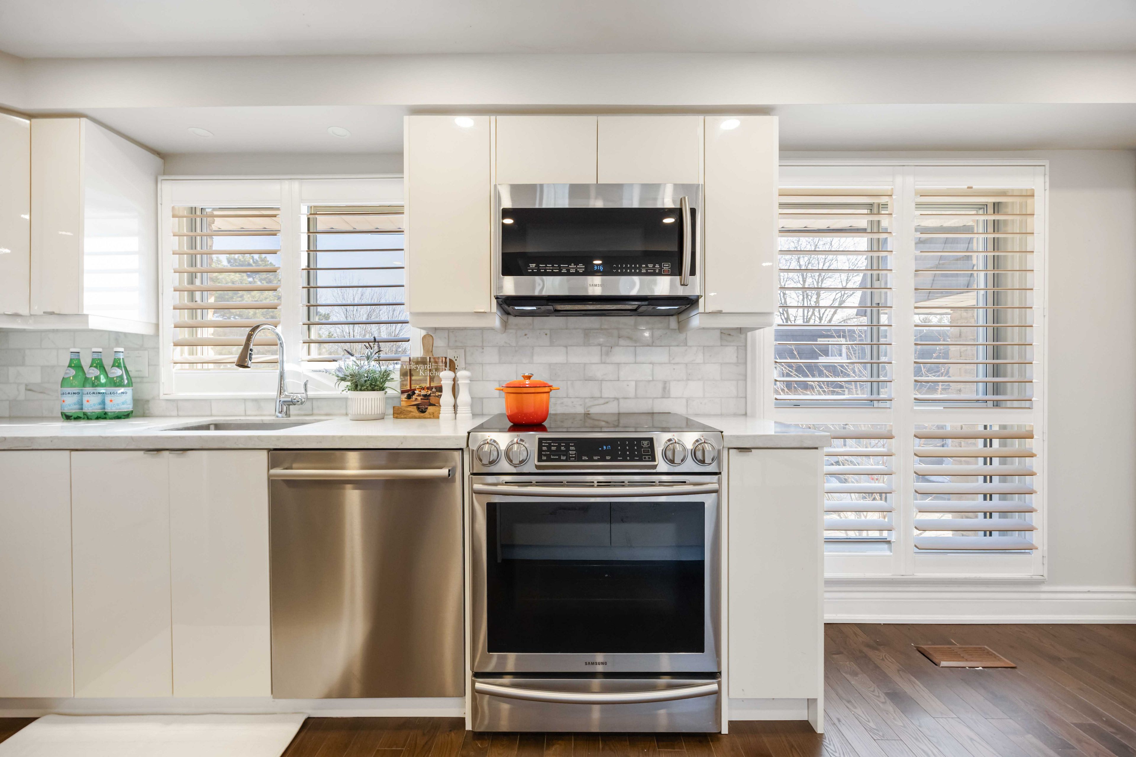 A rare opportunity to own one of the best end-unit townhomes in the complex. Fully renovated with refined finishes throughout and freshly painted throughout, this home offers the perfect balance of style, comfort and functionality. The kitchen is designed for both everyday living and entertaining, seamlessly flowing into the dining area and overlooking a rare, open backyard framed by mature trees. The unobstructed view and added privacy truly set this home apart. The living room impresses with soaring ceilings and a custom feature wall complete with a sleek electric fireplace, built-in shelving and integrated tv space. Spacious layout. Thoughtful upgrades. Exceptional value. Ideally located close to highways, shopping, schools, parks and all major amenities. Move-in ready and exceptionally well cared for. A standout opportunity within the community.