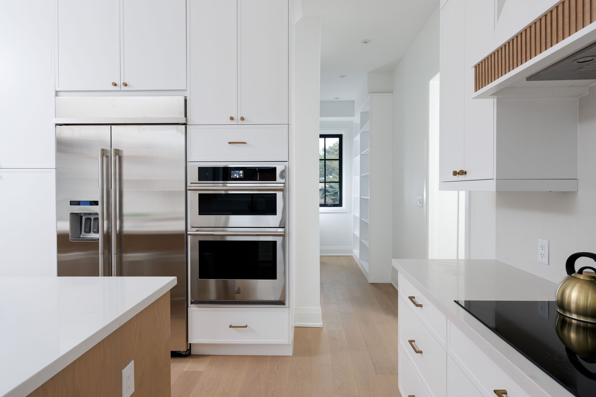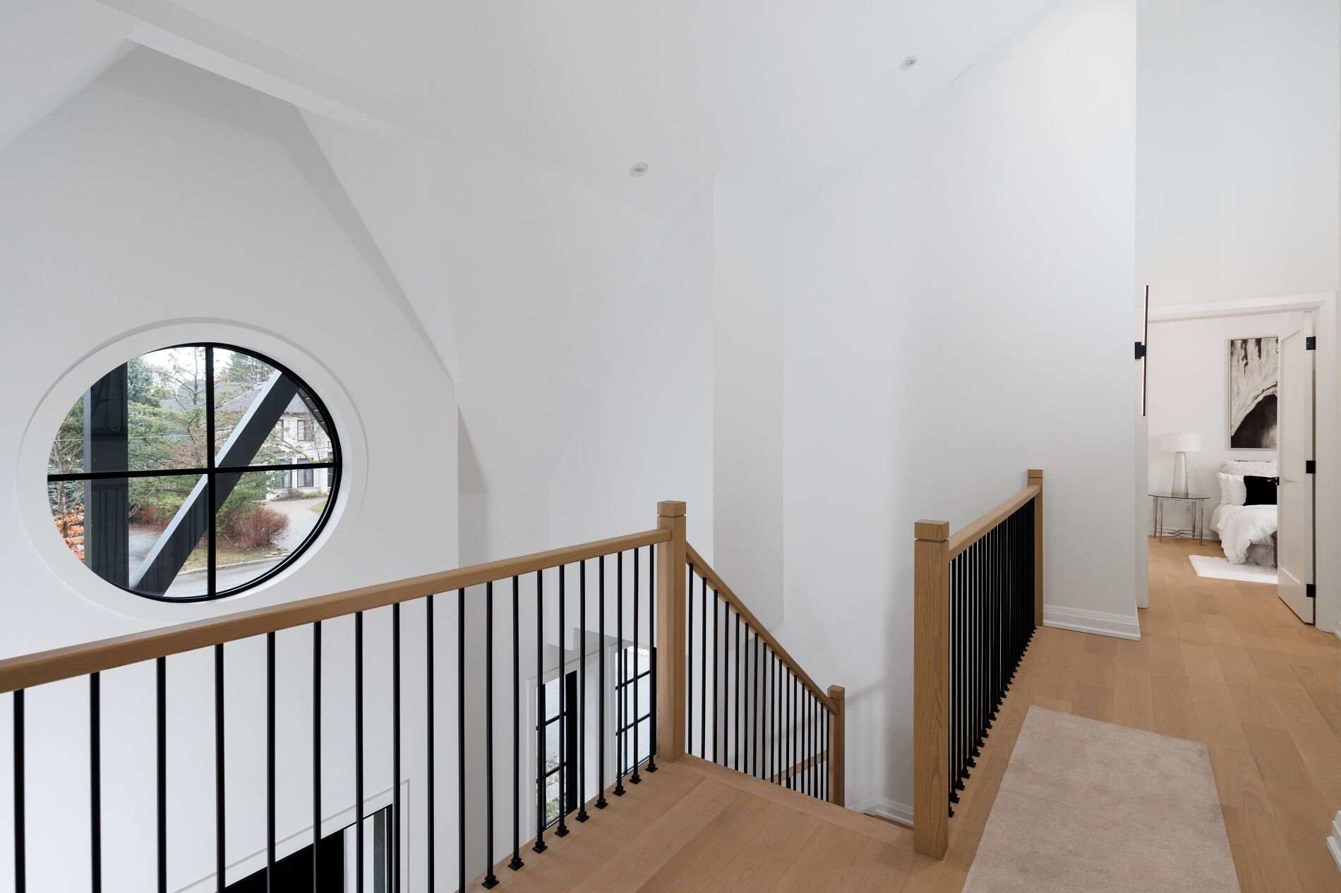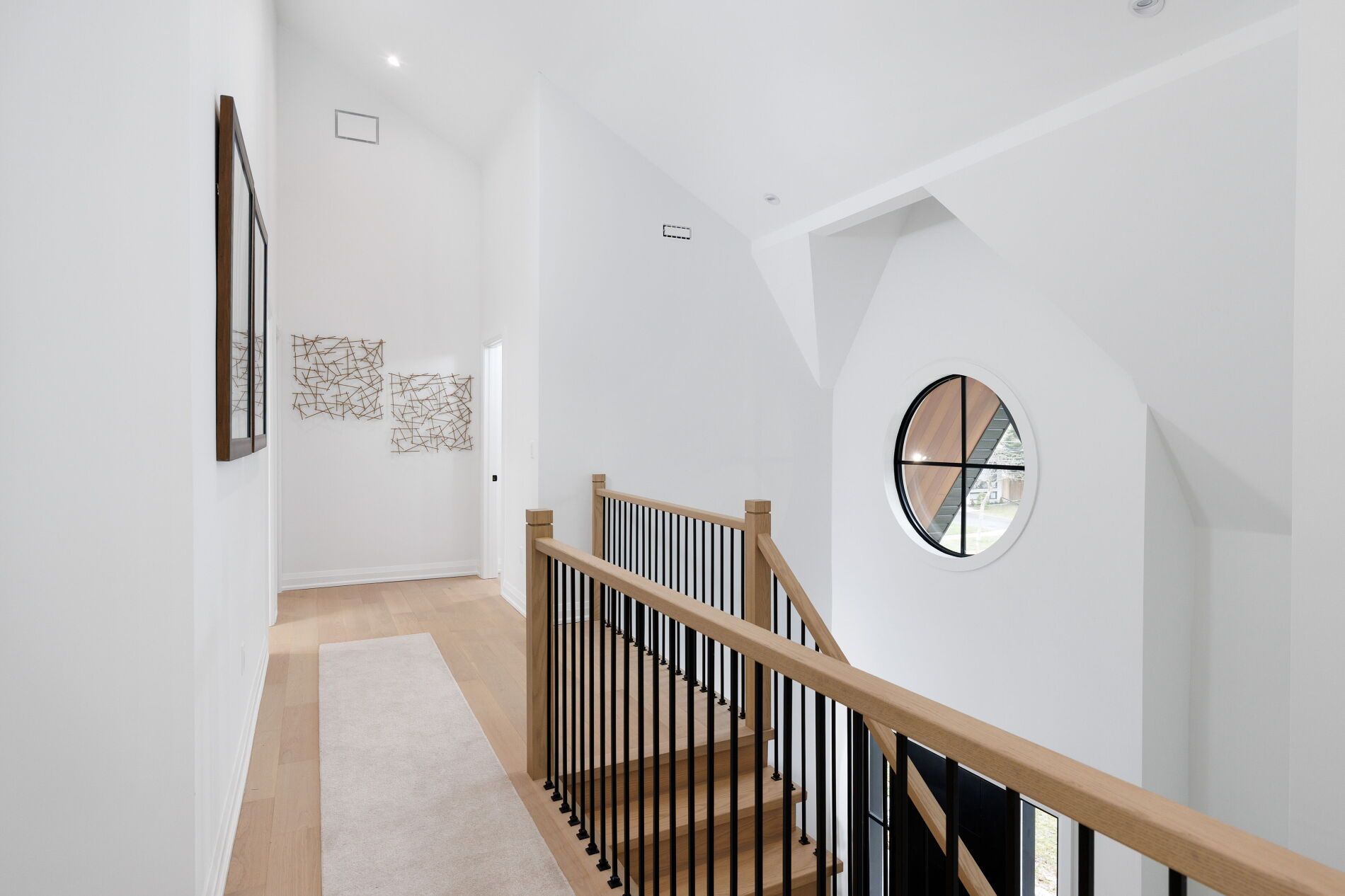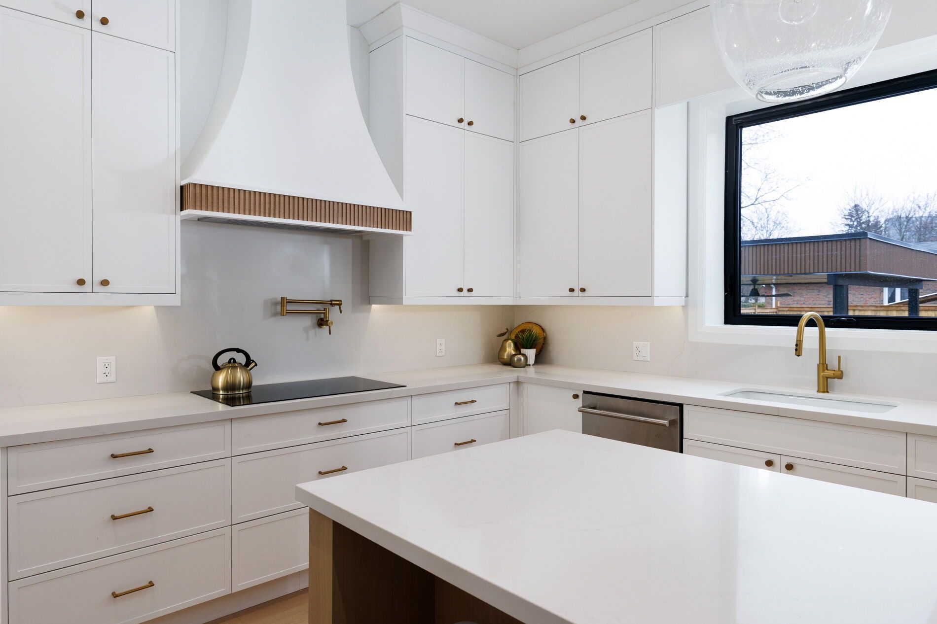• Open, sunlit spaces with vaulted ceilings and a large quartz island.