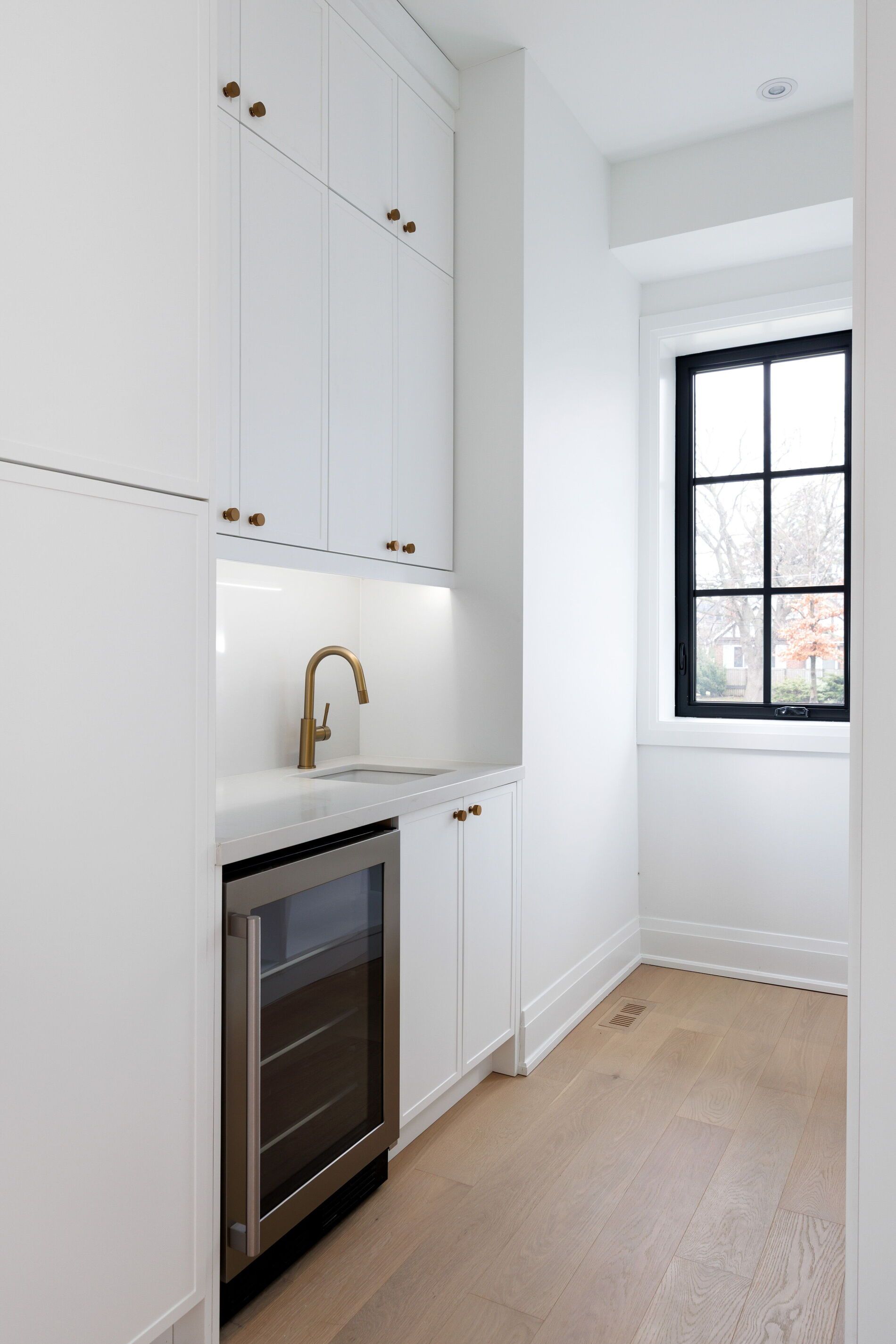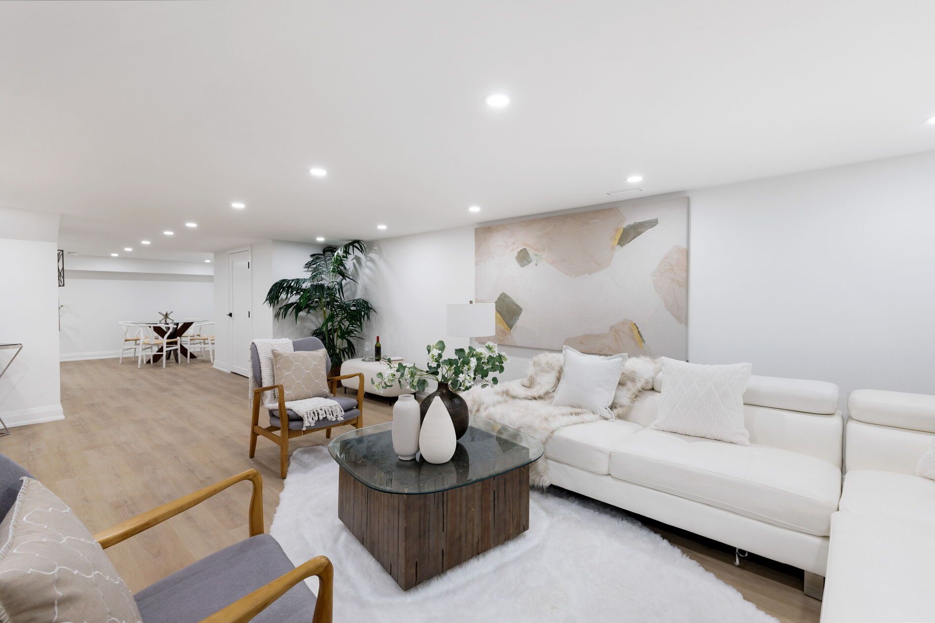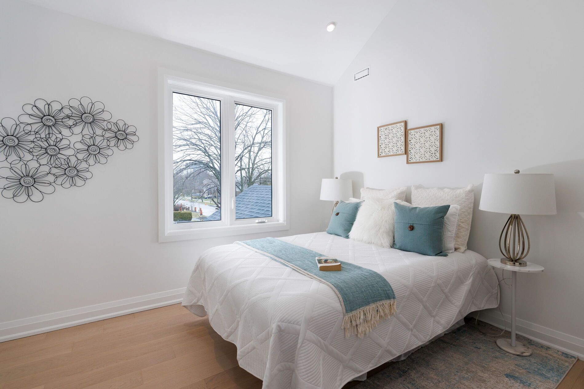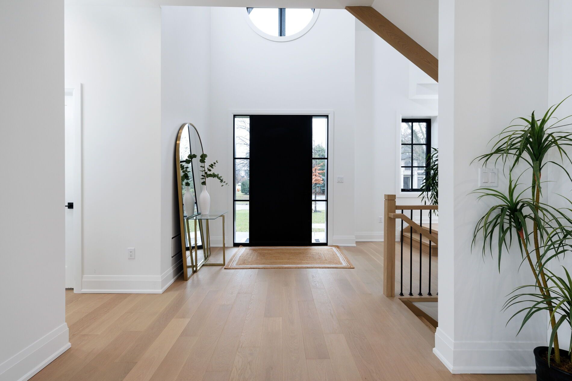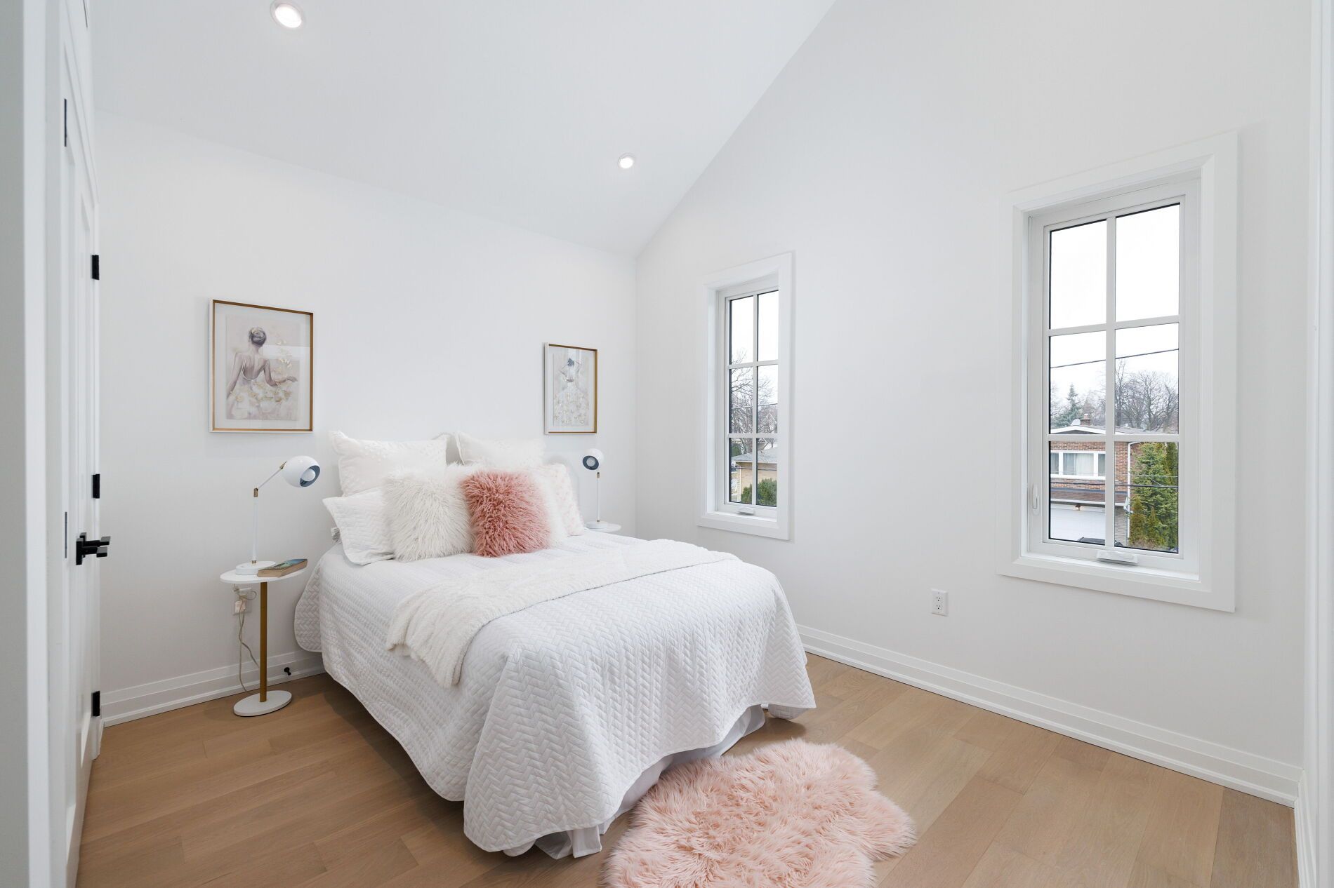 • Open, sunlit spaces with vaulted ceilings and a large quartz island.
