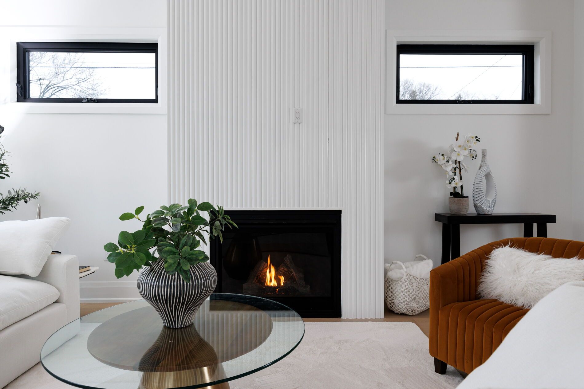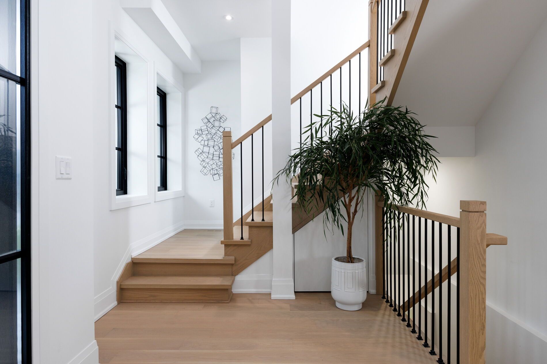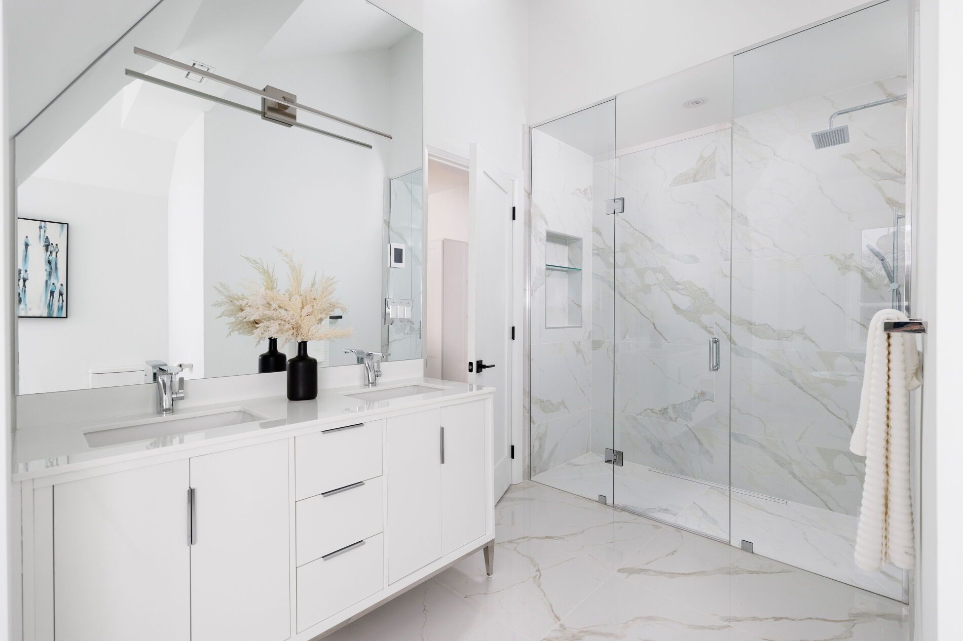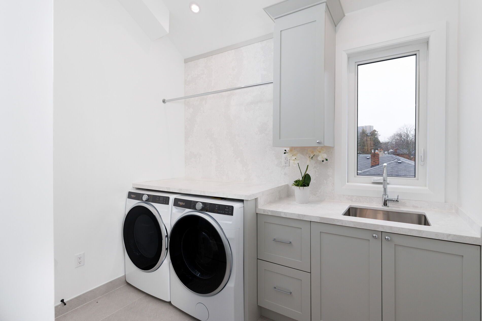 • Open, sunlit spaces with vaulted ceilings and a large quartz island.
