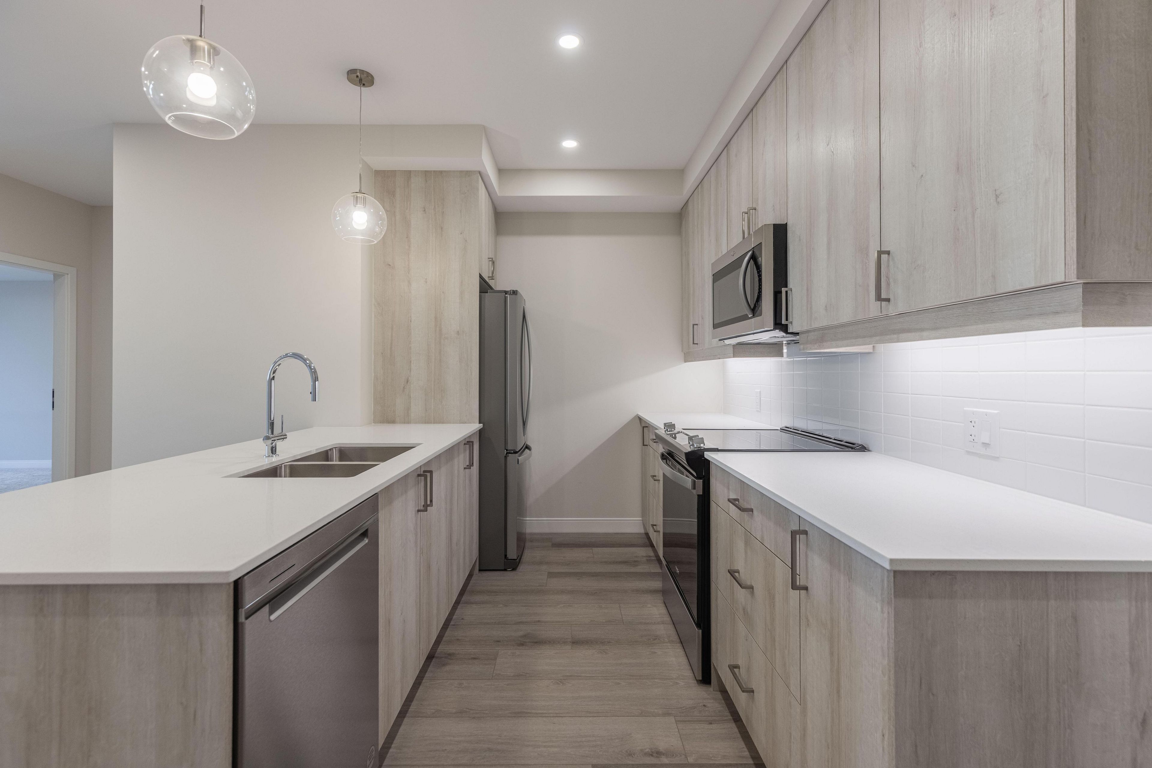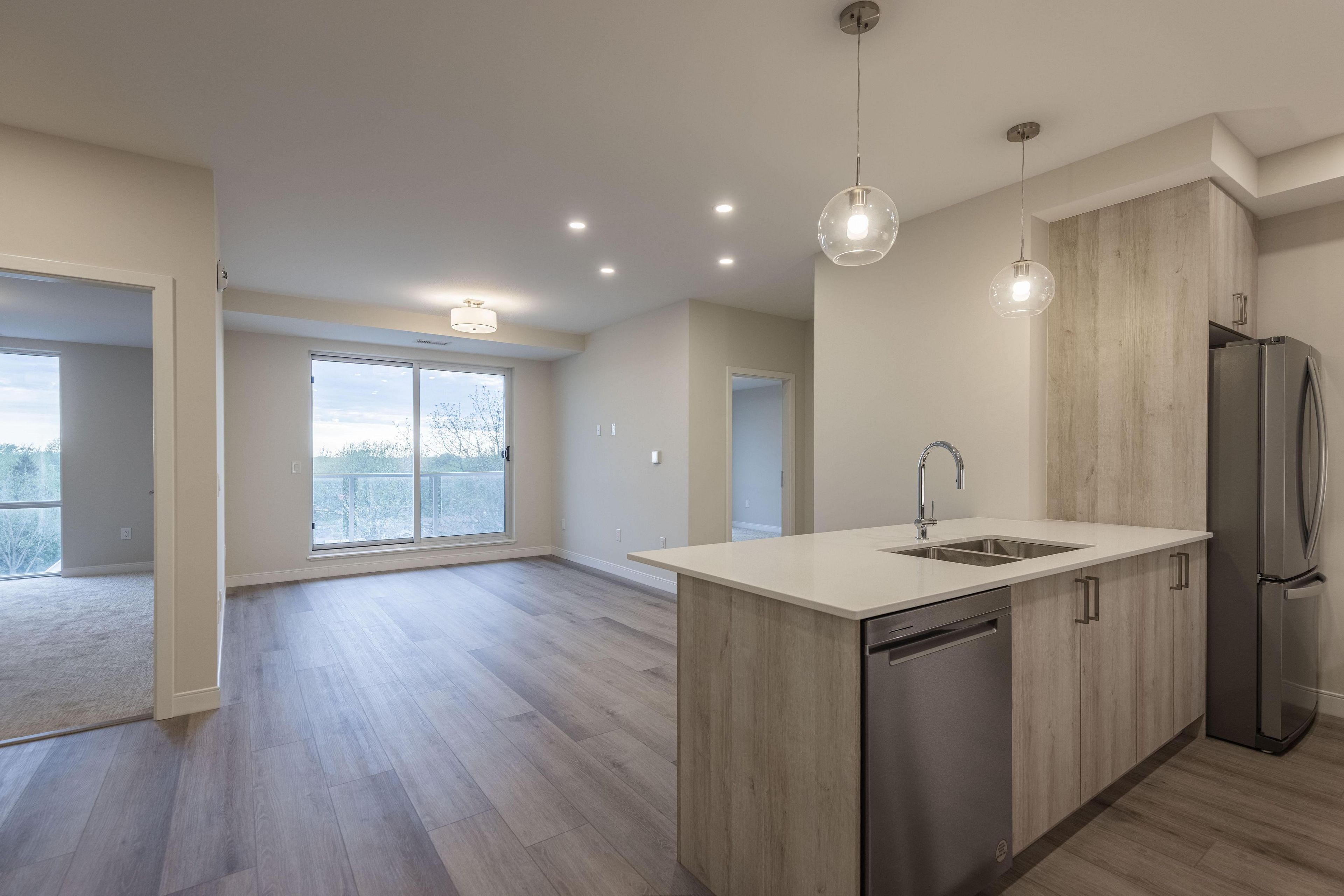 Lovely 2-bedroom condo offering water views and a bright, modern layout. Enjoy the convenience of in-suite laundry and an upgraded kitchen featuring stainless steel appliances and a breakfast bar perfect for entertaining. The spacious primary bedroom includes a generous walk-through closet leading to a stylish ensuite with double sinks, a sleek glass shower, and beautiful cabinetry with ample storage. Quality upgraded flooring throughout adds a warm, contemporary touch. This unit also comes with two parking spaces, one equipped with ev charging. Located in the heart of port colborne, you're just steps from charming shops, great restaurants, and scenic views of ships passing through the canal.