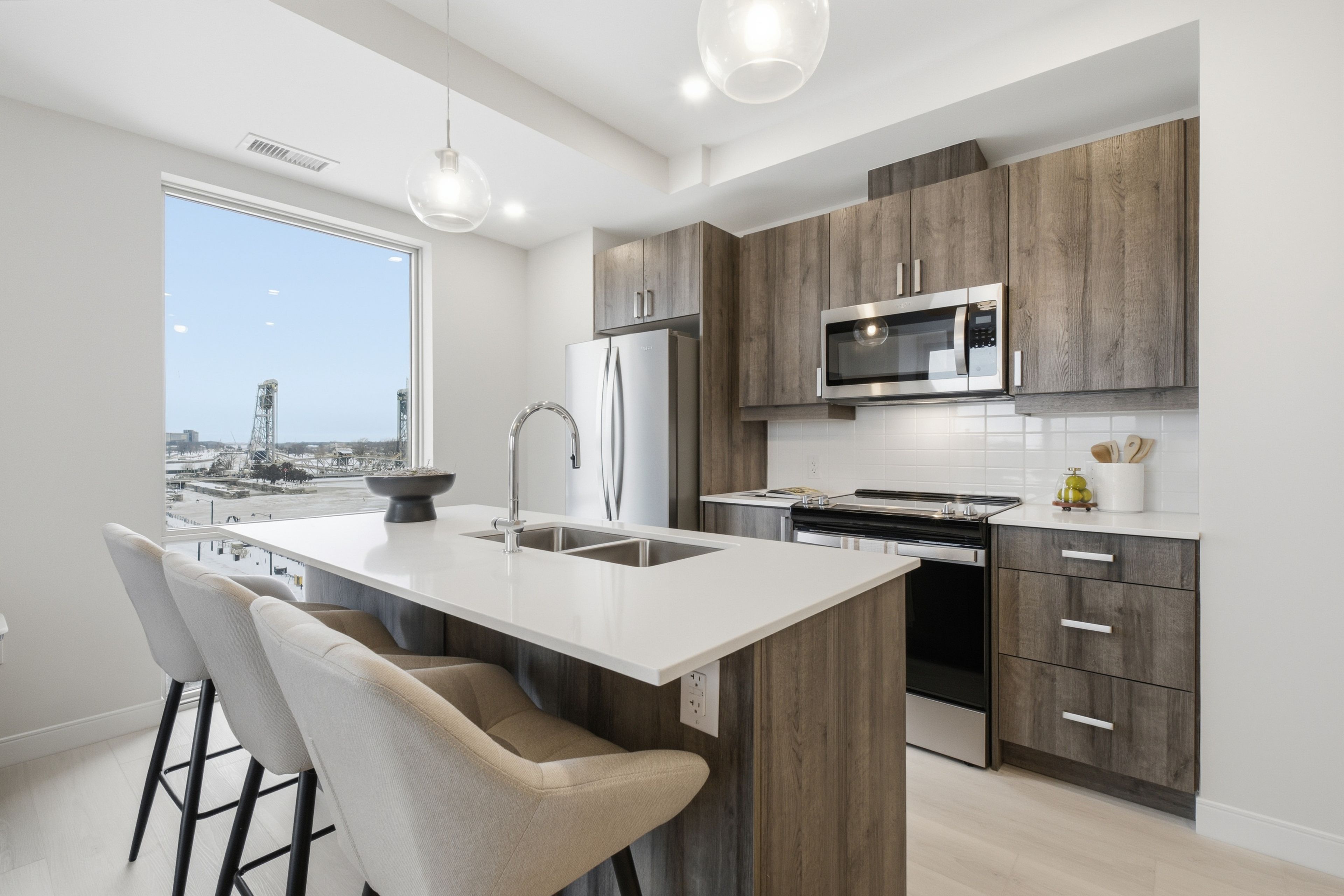 • Sleek kitchen featuring quartz countertops and modern appliances.