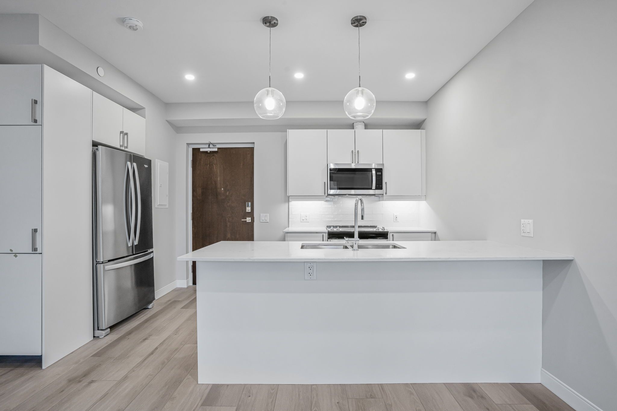 • Contemporary kitchen features quality cabinetry and quartz counters.