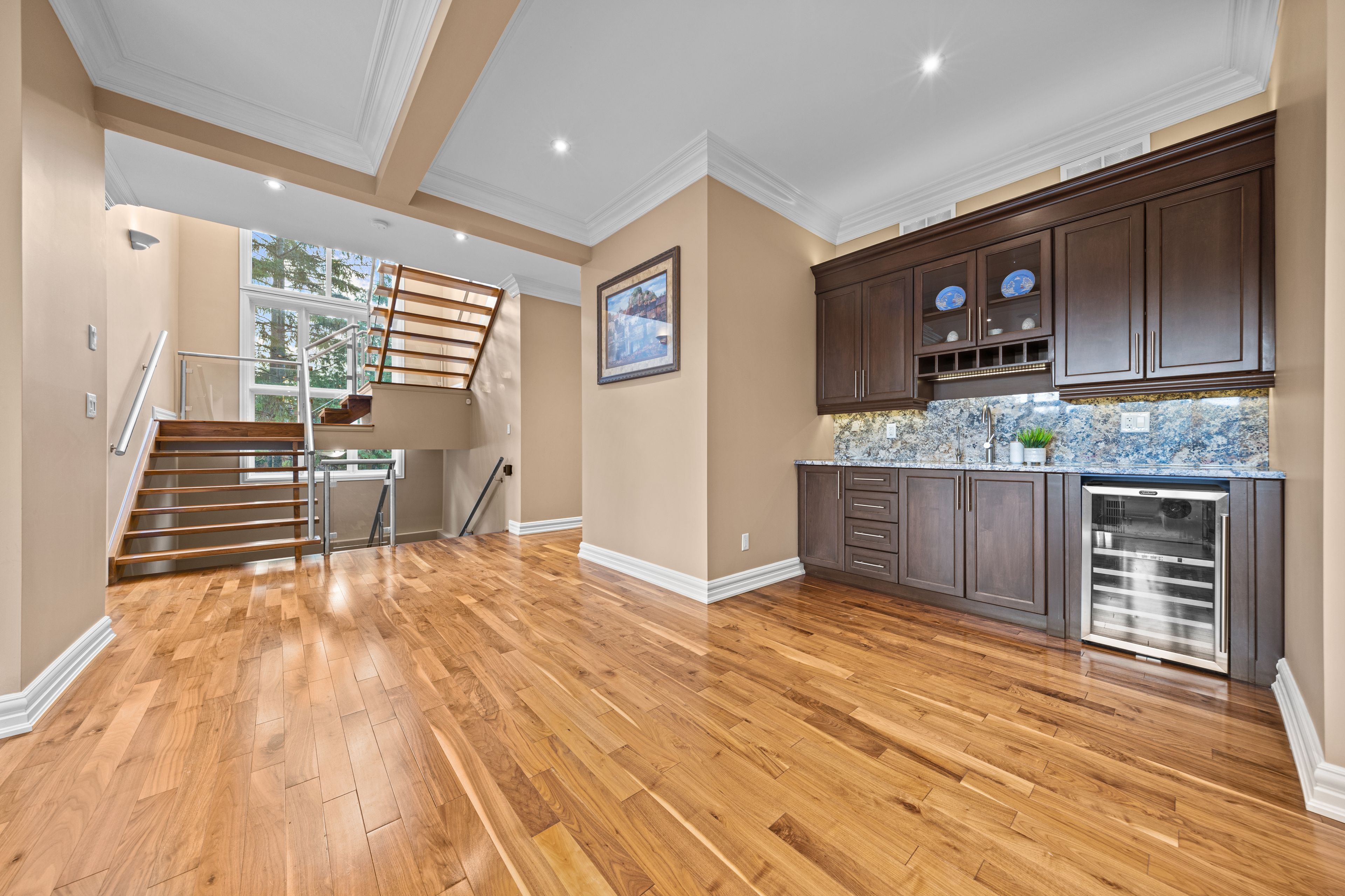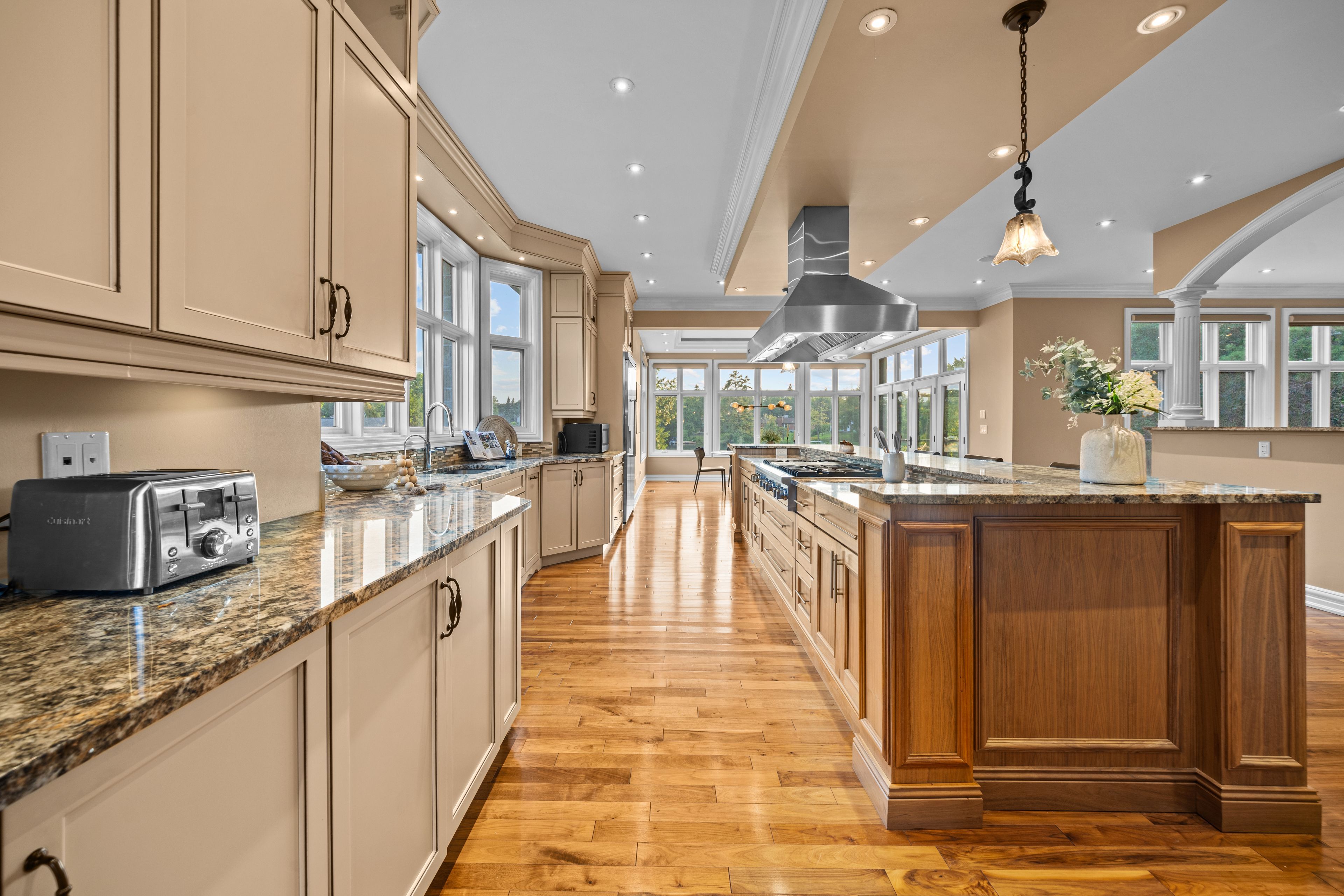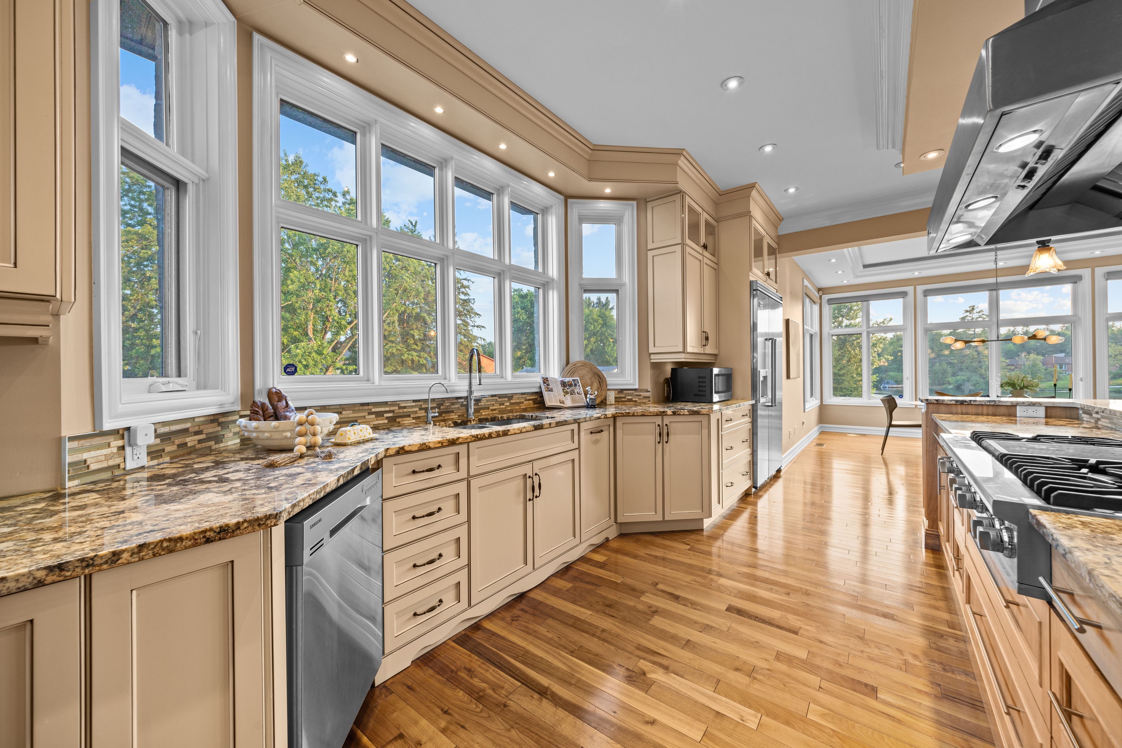 • Gourmet kitchen features high-end appliances and a large granite island.