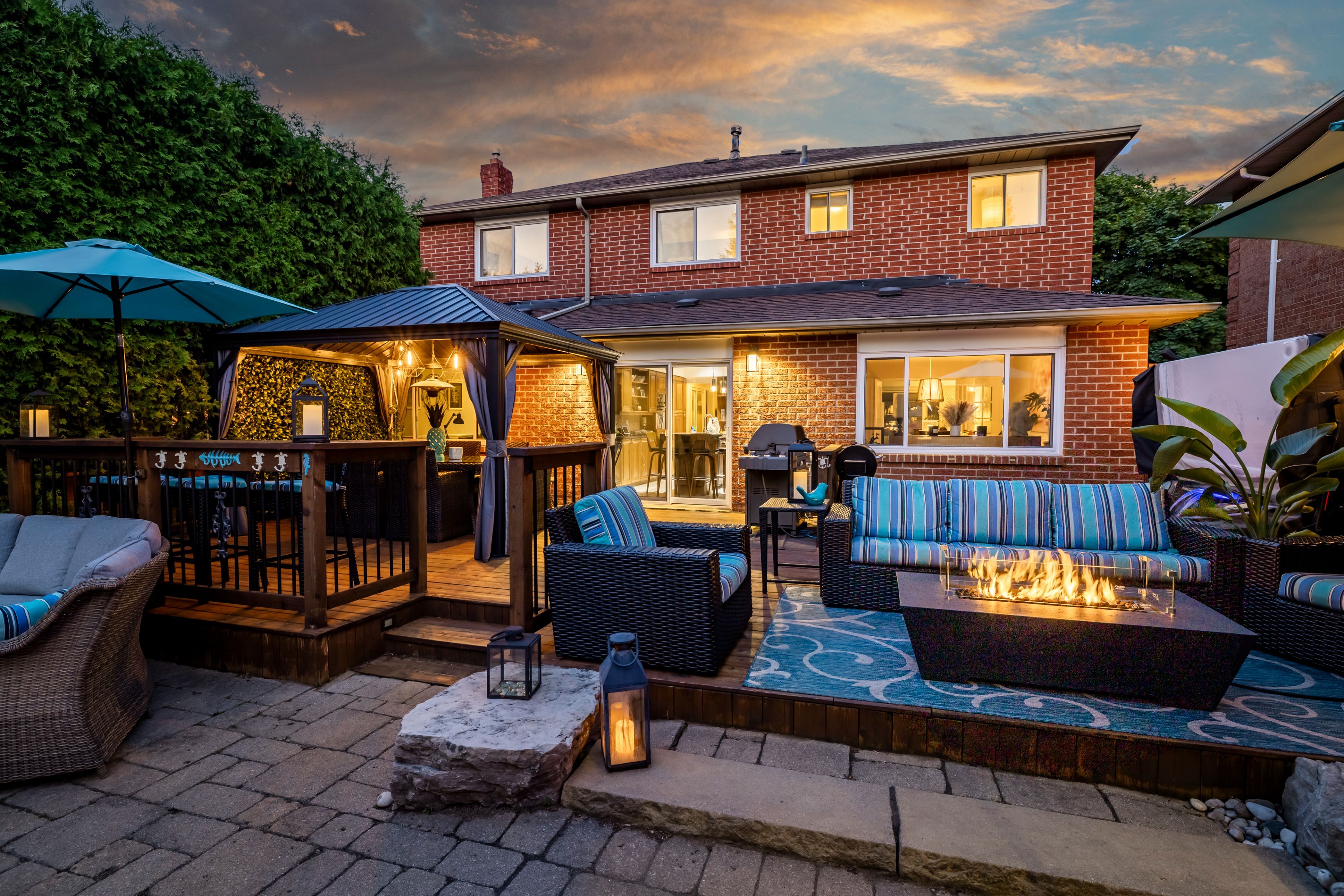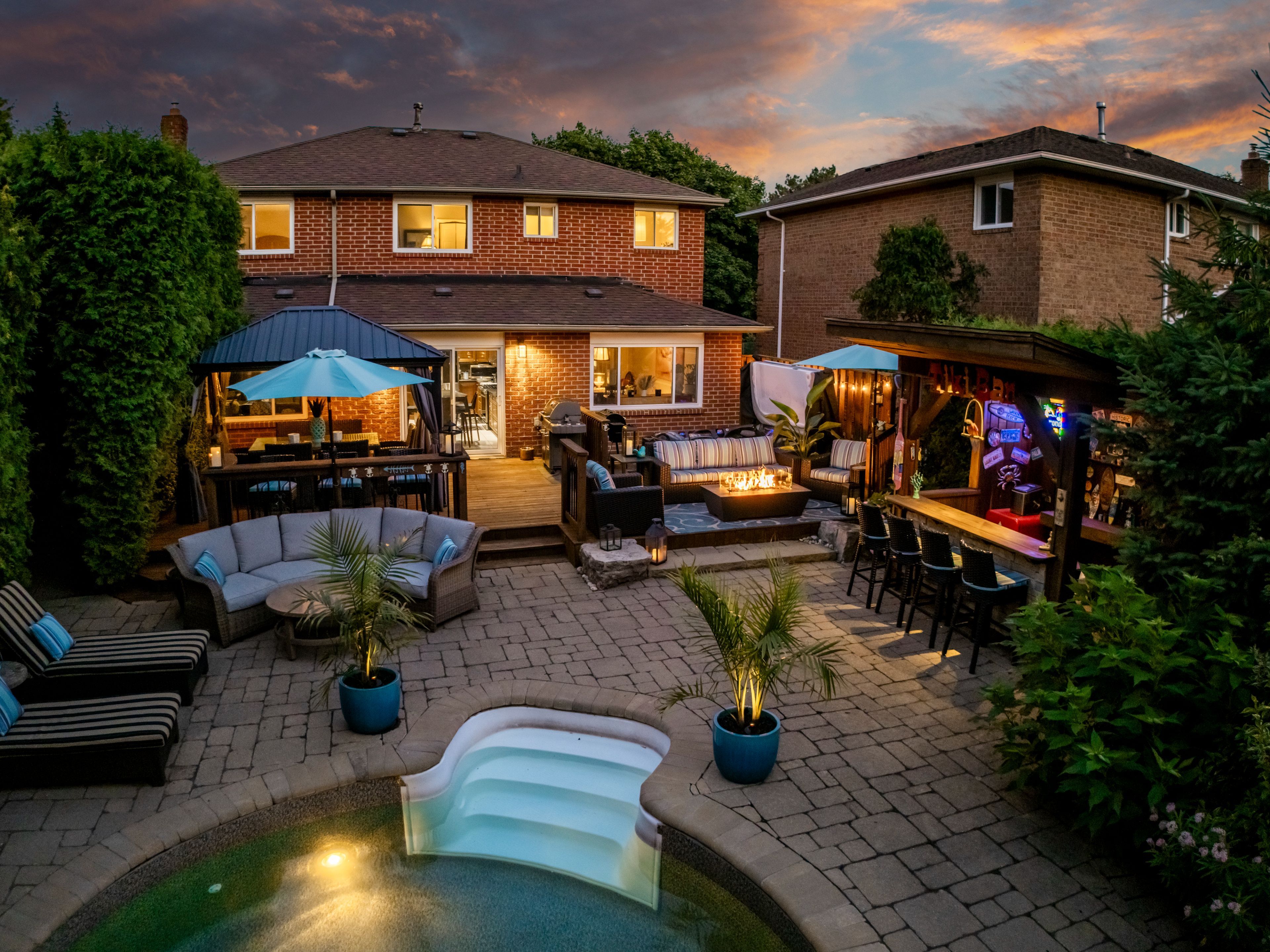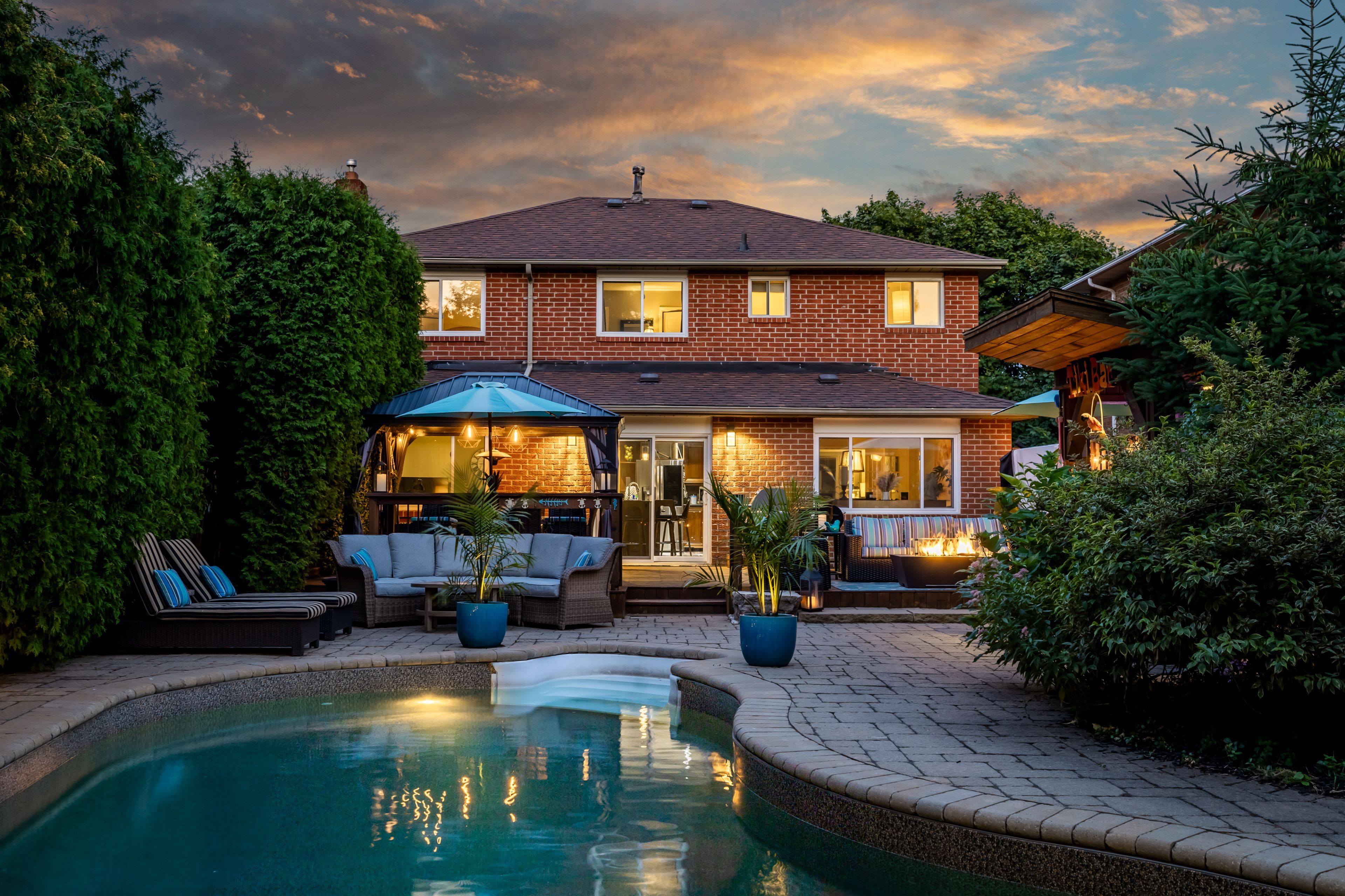 Welcome to an exceptionally rare find in falgarwood, featuring an approximately 200-foot-deep lot that creates a truly private sanctuary. This stunning 4-bedroom home perfectly blends luxury with unbeatable convenience, offering a spectacular, resort-style backyard oasis complete with a custom in-ground pool, a new 6-person hot tub (2022), ambient lighting, a fully equipped tiki lounge, and a fire-pit area-the ultimate setting for private relaxation or grand entertaining. Inside, enjoy freshly painted principal rooms, including a superb living/dining great room, alongside an oversized primary suite and three generous secondary bedrooms. Situated on a family-friendly street, you're just a short walk from iroquois ridge high school and all major amenities, with immediate access to every major highway, making this a unique and highly sought-after forever home. Follow your dream home as your backyard paradise awaits. Don't miss this one!
