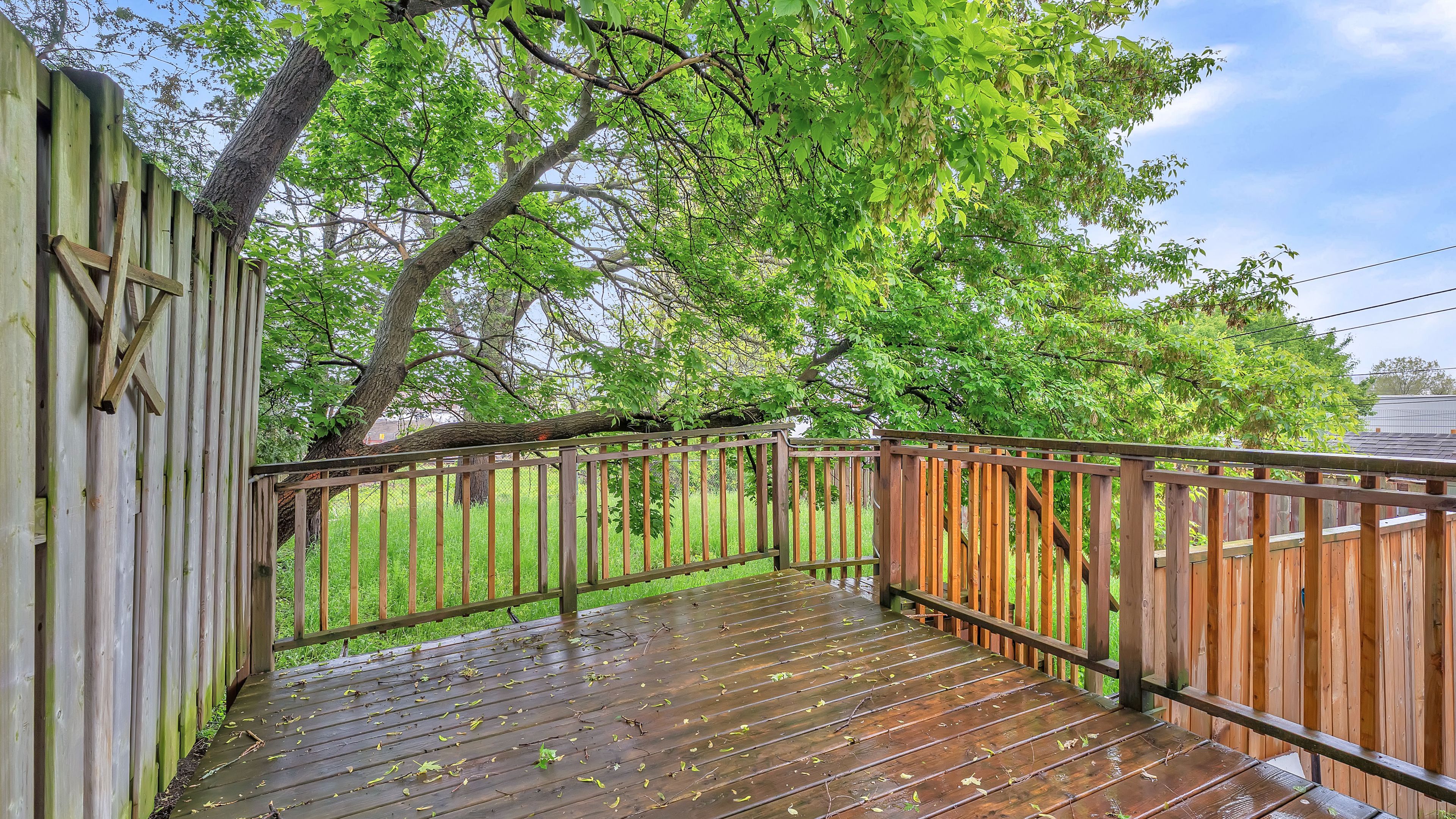 • Fully fenced yard with deck, mature trees, and storage shed.