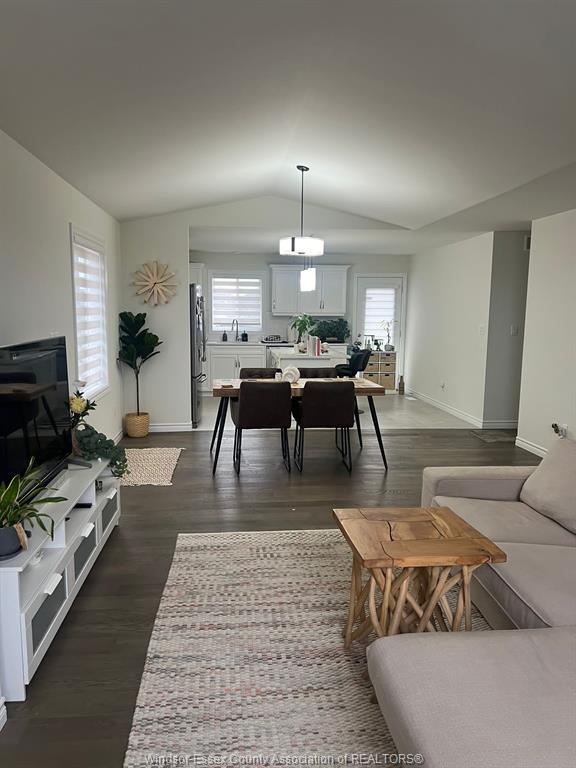 • Living area boasts a tall cathedral ceiling and engineered hardwood flooring.