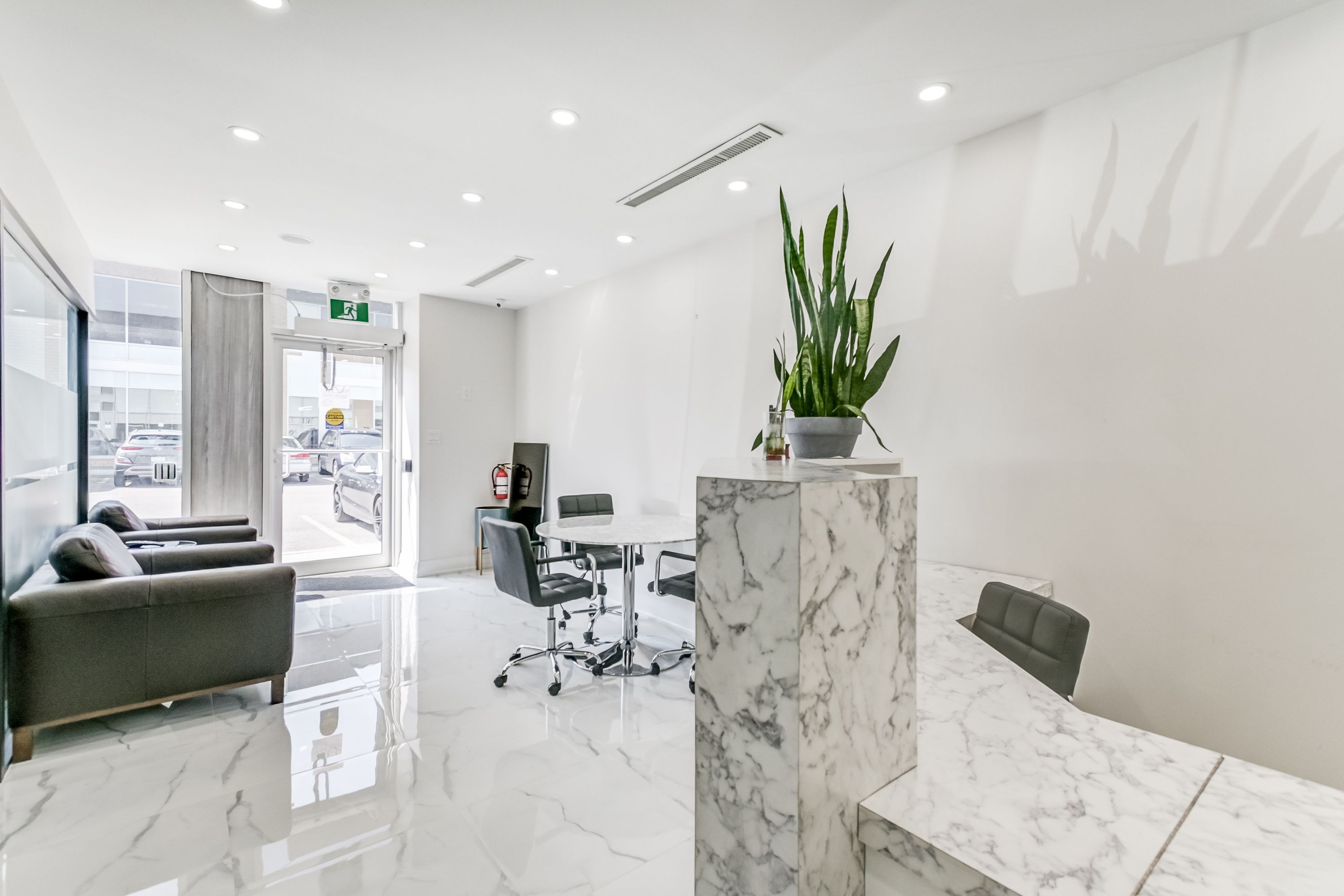 Ground floor office space spanning approx 2000sqft in a bustling commercial retail & industrial mixed use newly constructed plaza. Professionally finished and move in ready suitable for multiple uses including: insurance, real estate, law, engineering, accounting, architecture, marketing, advertising, design, & more. A variety of businesses within the plaza currently operating include: medical, pharmaceutical, dental, physio, restaurant & many more to make this a high traffic area. Excellent south exposure on queensway providing visible signage & tons of natural light. 1 front desks, 7 private offices, 8 cubicles + 2 private cubicle offices, 1 kitchenette, 2 bathrooms (1 handicap accessible). Modern finishes throughout including glass office walls, motion-sensor led lights, stainless steel appliances, custom cabinetry.