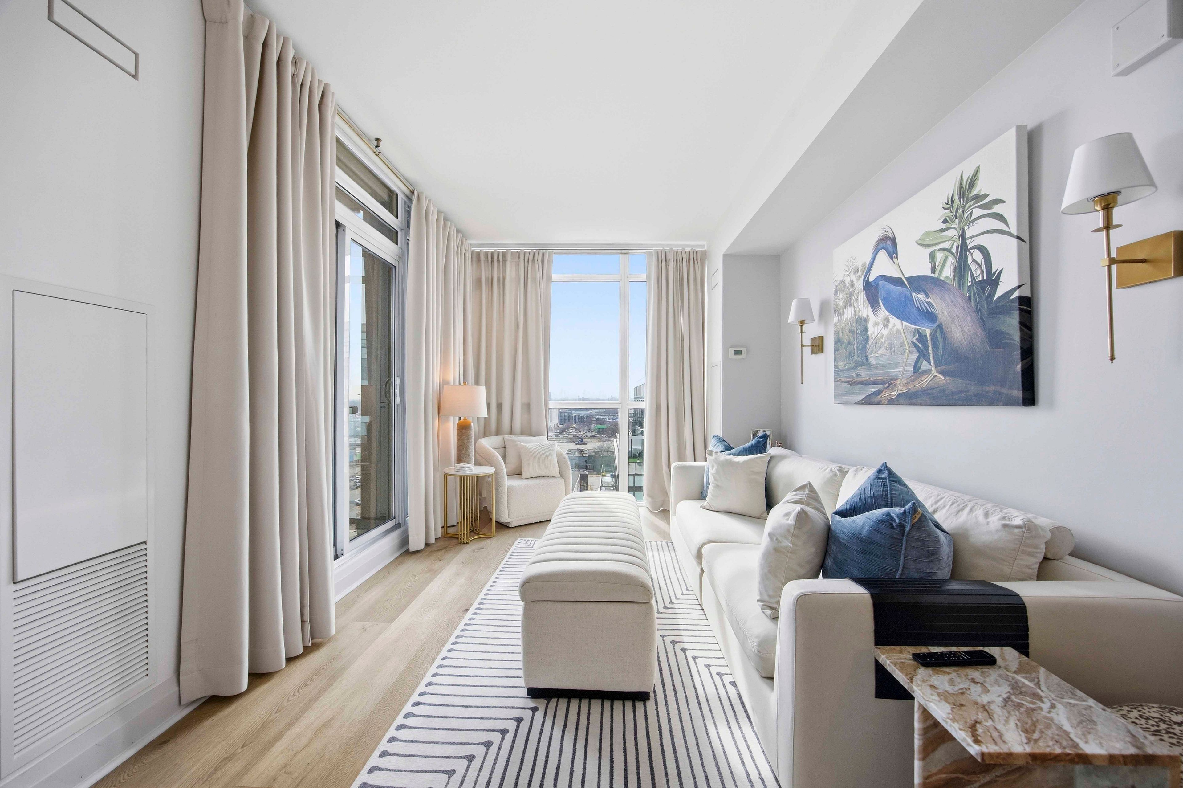 This beautifully updated suite is located in one of etobicoke's most rapidly evolving communities. Offering strong long-term growth potential and an unbeatable lifestyle for young professionals and commuters. Featuring updated flooring, smooth ceilings, fresh paint throughout, and modern light fixtures, this unit is completely move-in ready. The fantastic layout is both functional and inviting, highlighted by a custom built-in dining area with bench seating for 8, perfect for hosting. Enjoy tranquil views overlooking lake ontario, with a park just steps away, ideal for dog lovers and outdoor enthusiasts. The desirable corner unit with southwest exposure fills the space with natural light and offers stunning evening sunsets. Designed with convenience in mind, this location is ideal for commuters with seamless access to transit and highways. Ttc is right at your doorstep, and you're just minutes from the gardiner expressway for an easy downtown commute. Plus, toronto pearson airport is only 10 km away, perfect for frequent travelers. Walk to groceries, restaurants, and entertainment, all while being surrounded by green space in a fast-growing, high-demand neighborhood. A perfect blend of style, comfort, and convenience. This is urban living at its best. Residents enjoy exceptional building amenities, including an indoor pool, sauna, hot tub, fully equipped gym, rooftop terrace with bbqs, party room, guest suites, visitor parking, pet wash, car wash station, and 24-hour concierge.