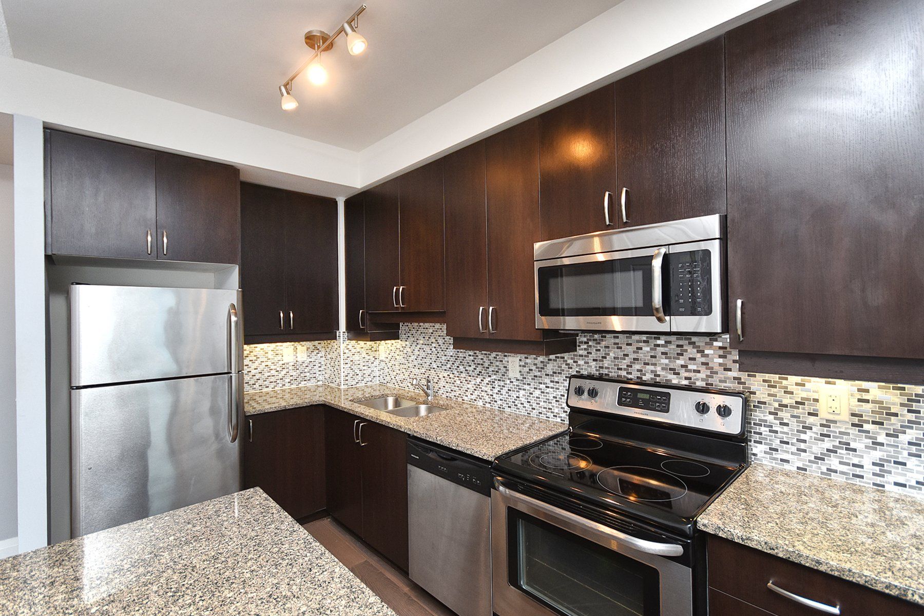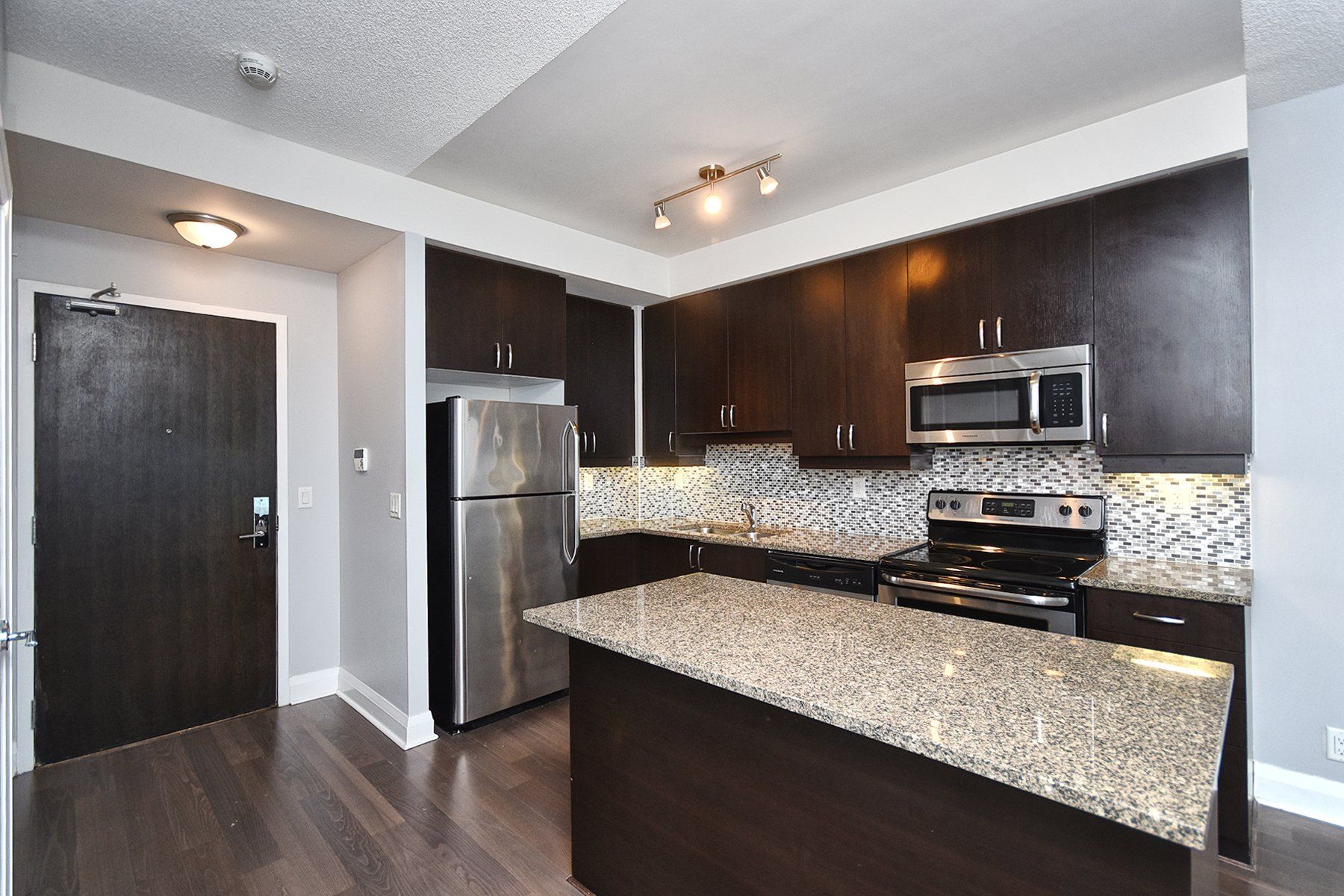 • Modern kitchen with stainless steel appliances and quartz countertops.