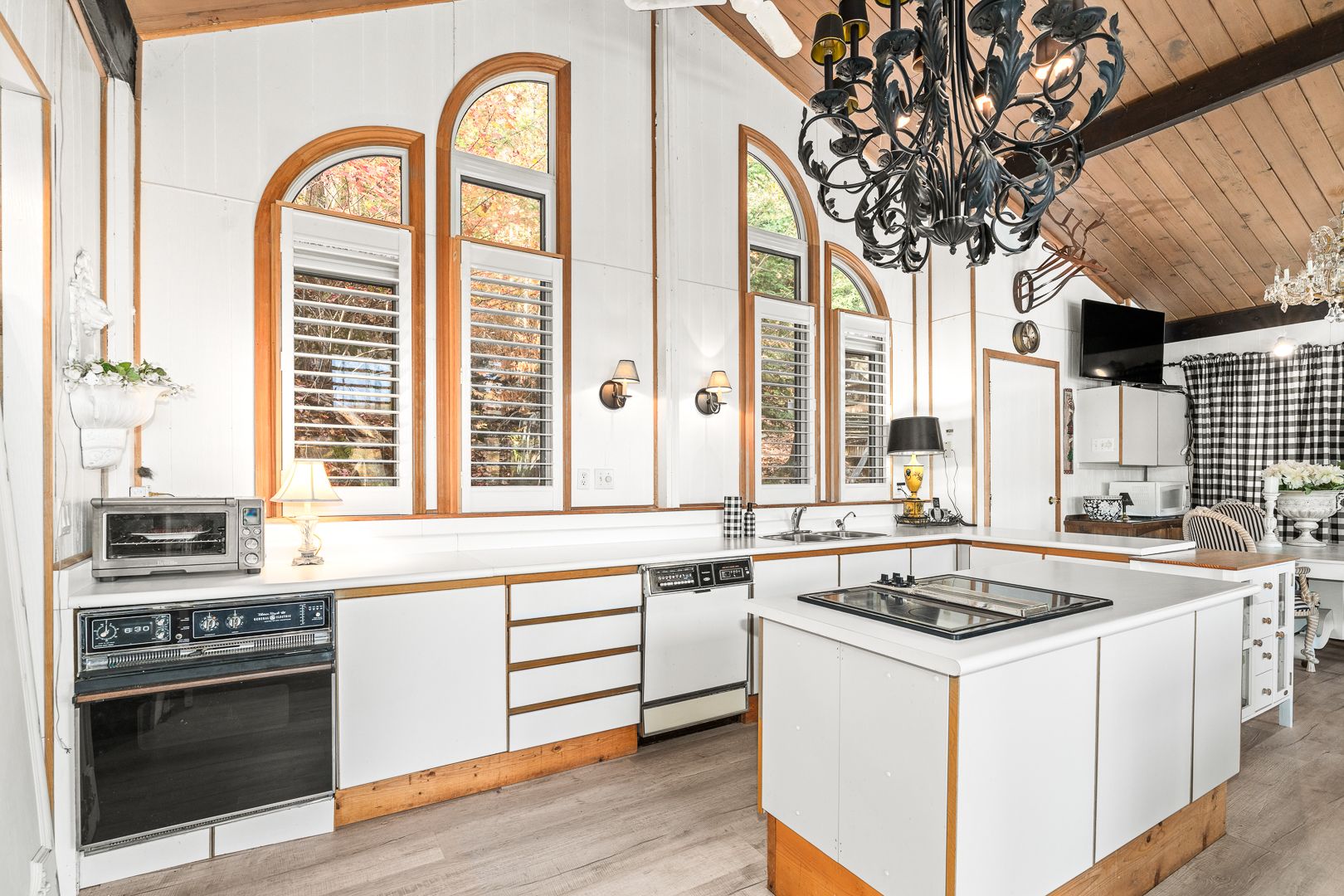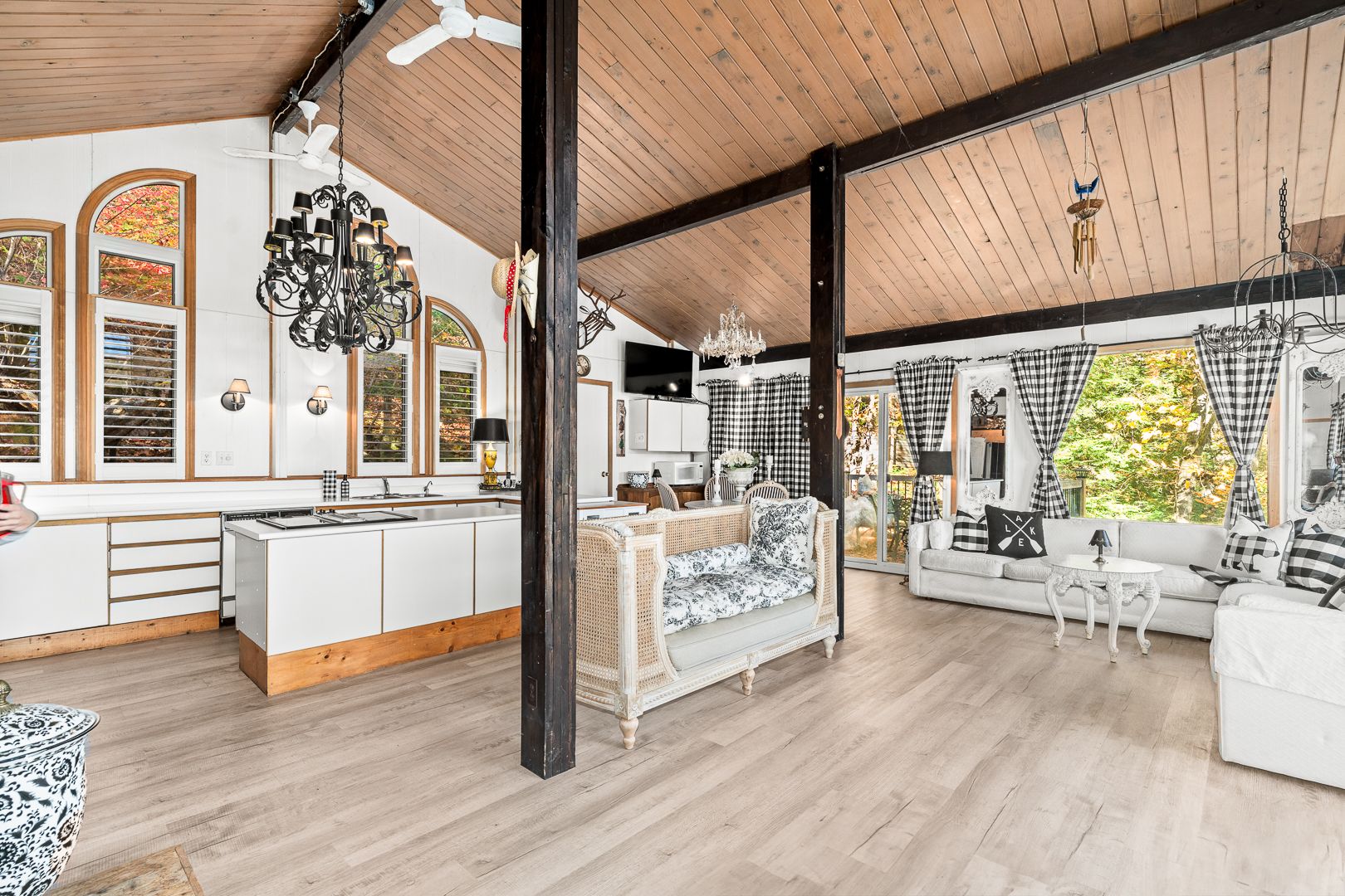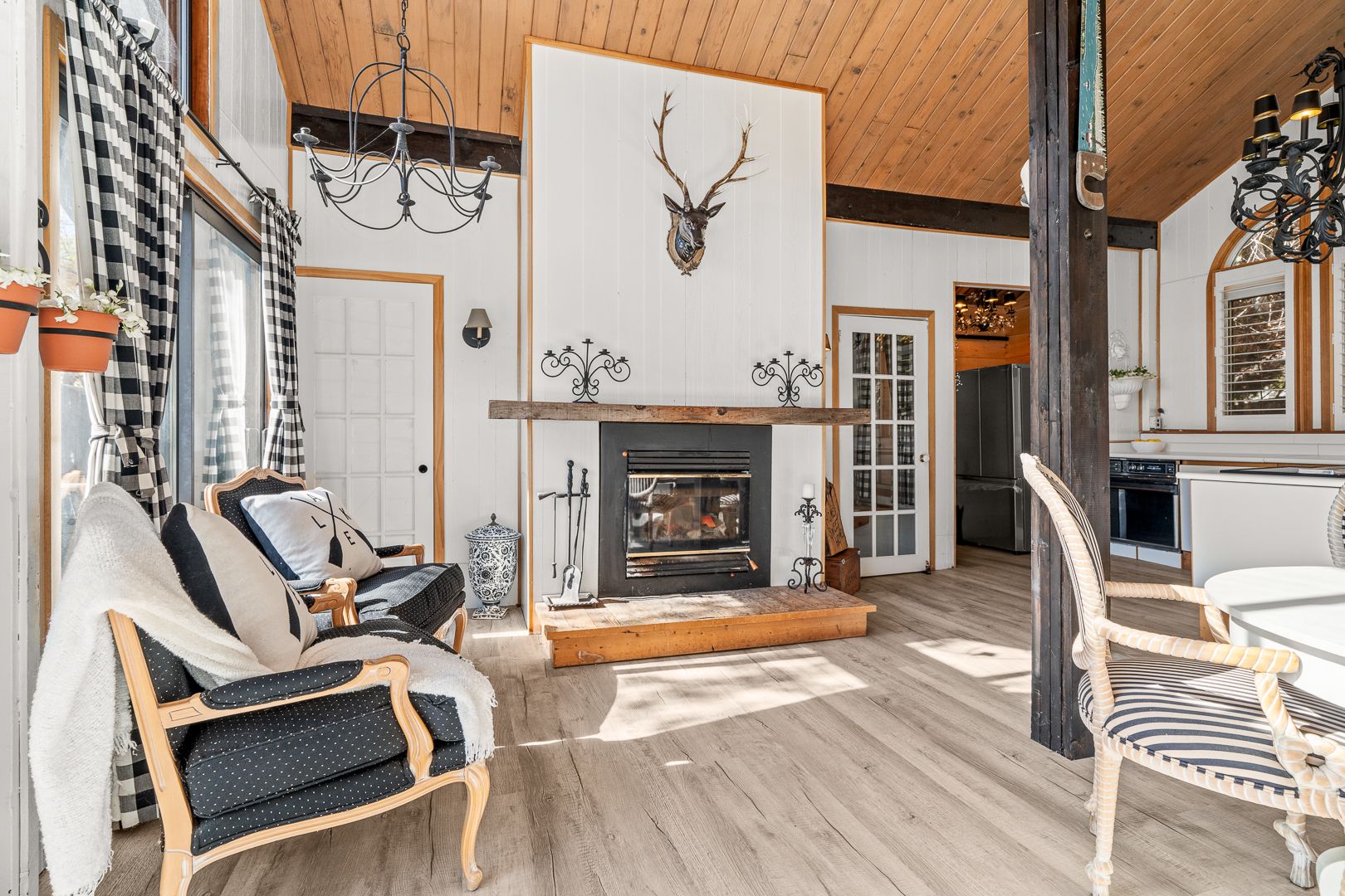 • Lofted main living area with large windows and a cozy fireplace.