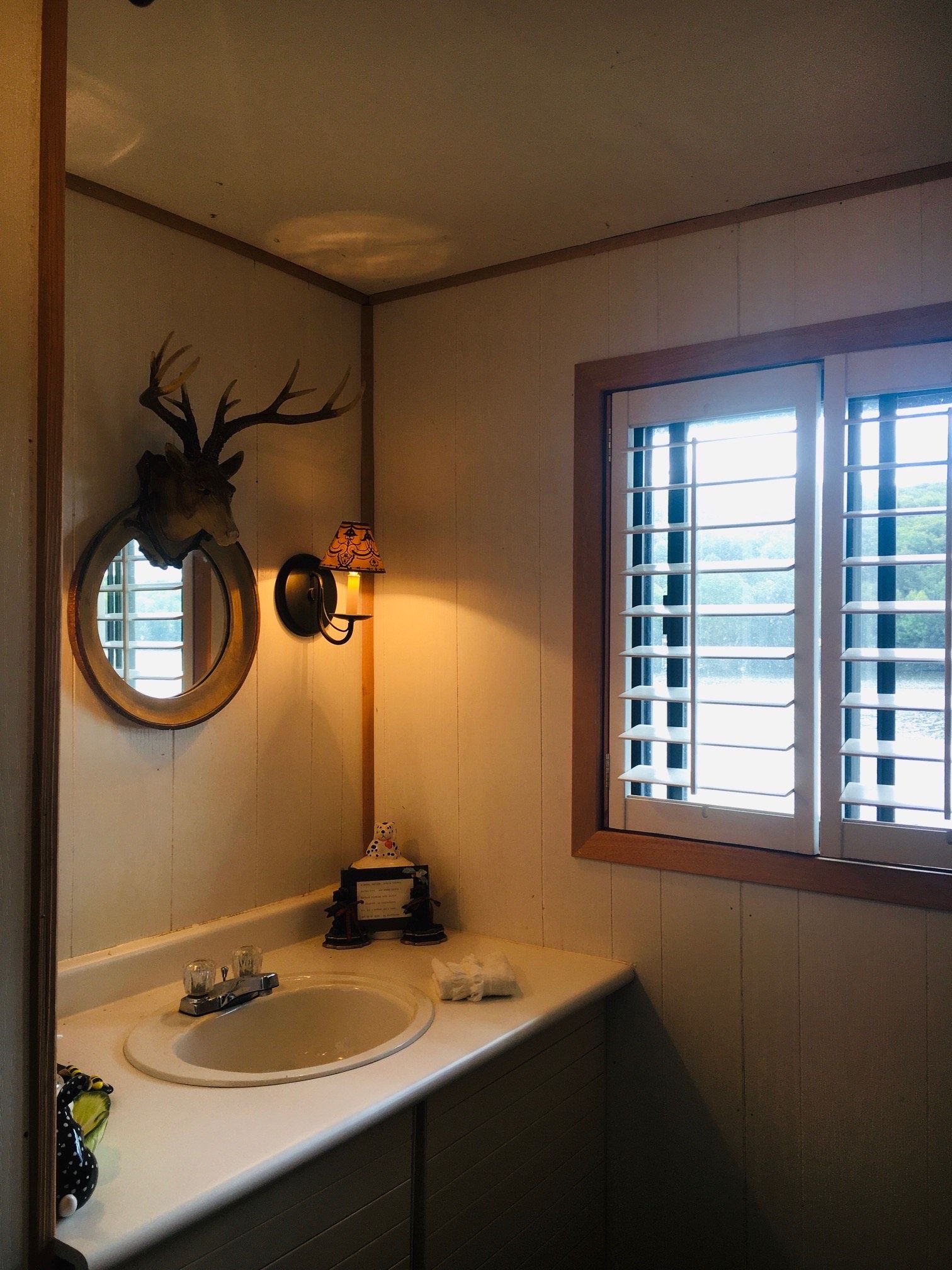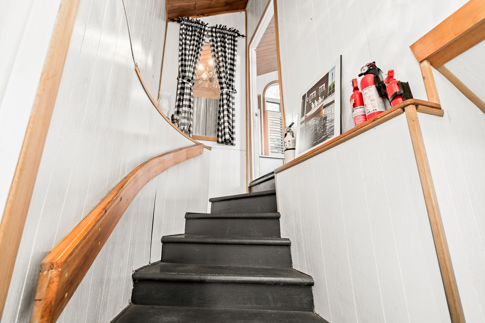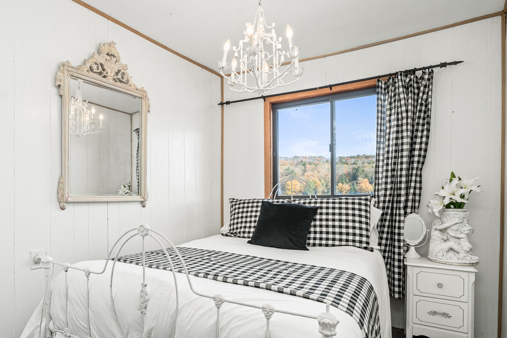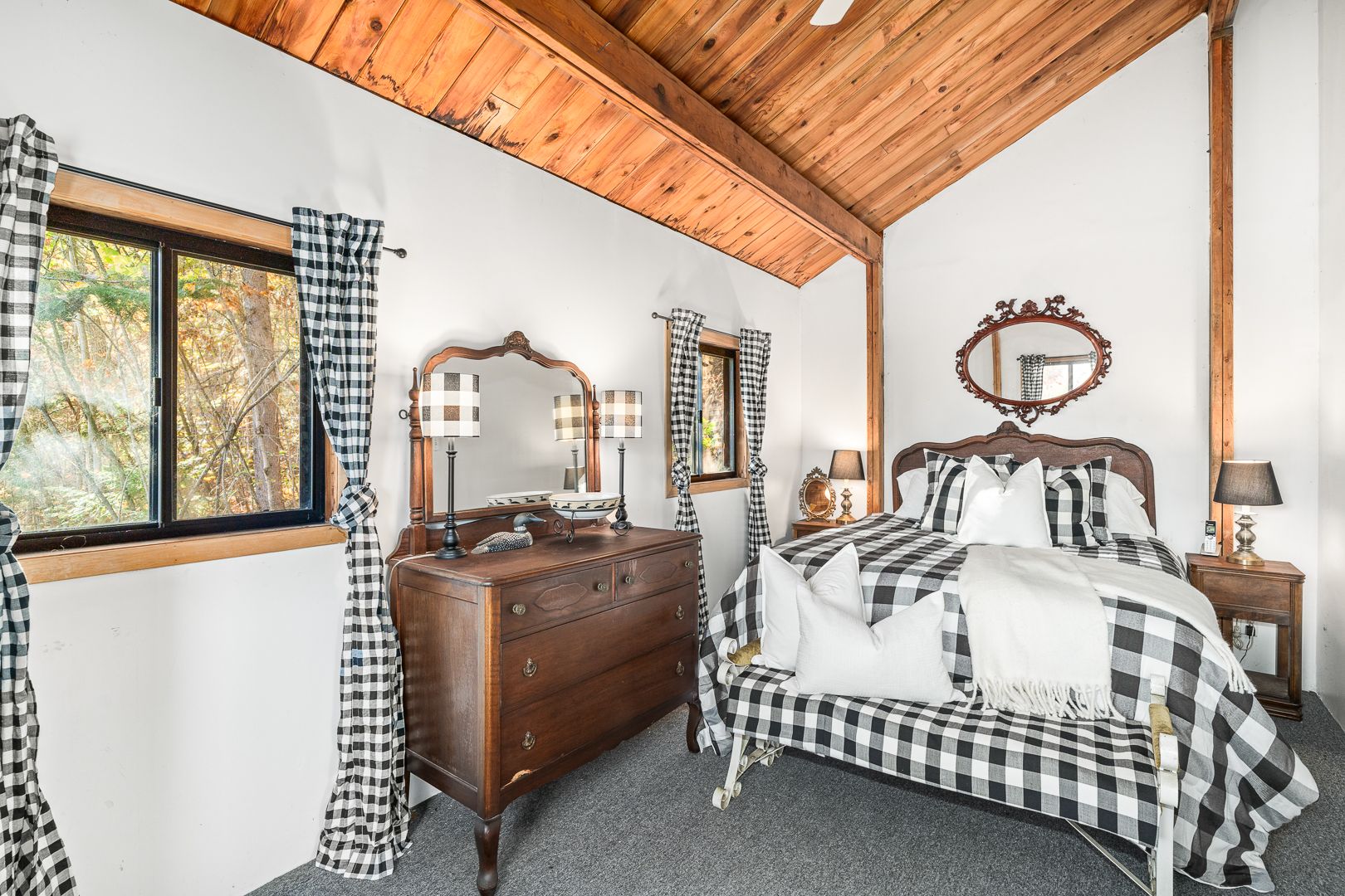 • Lofted main living area with large windows and a cozy fireplace.