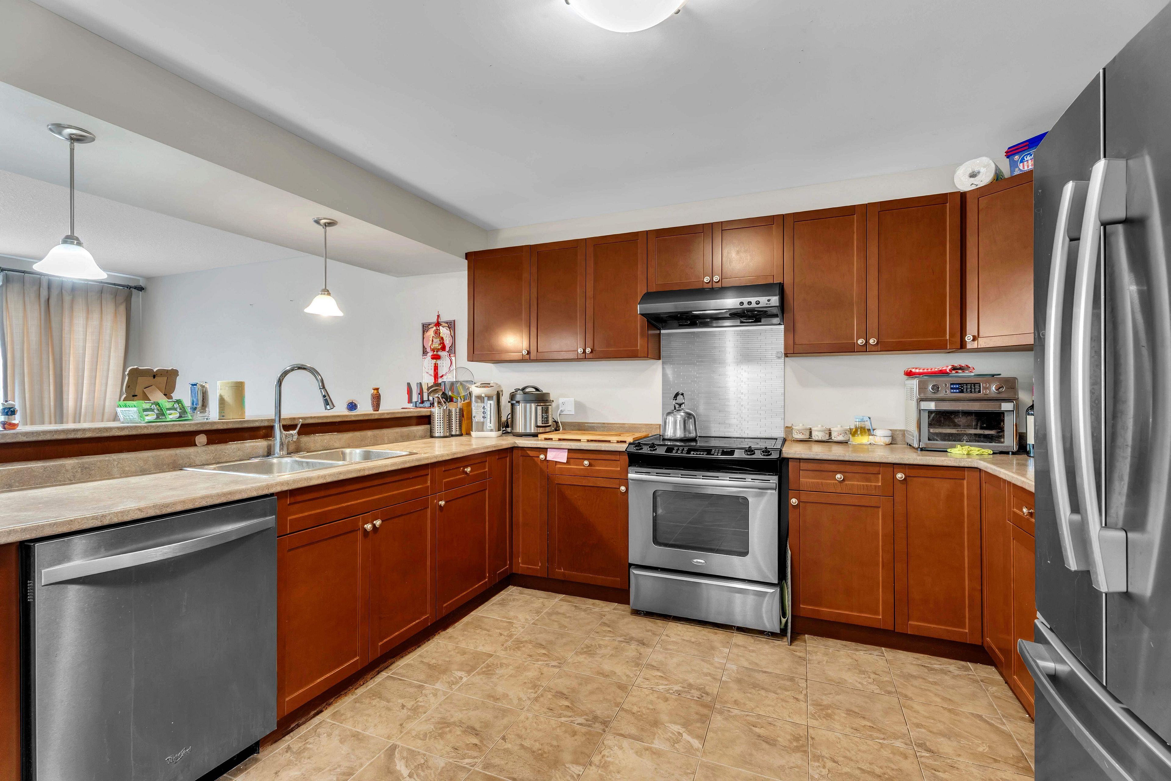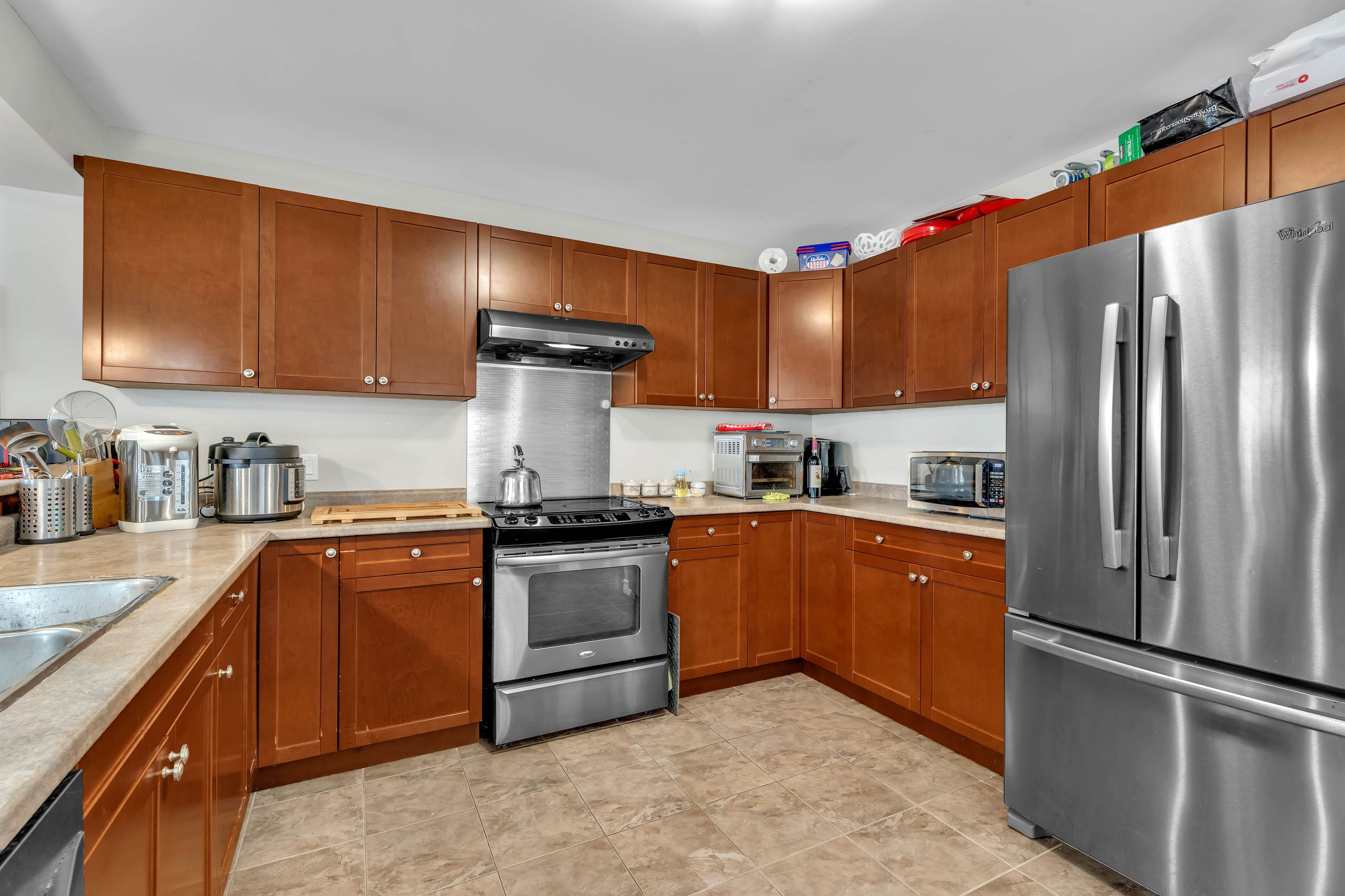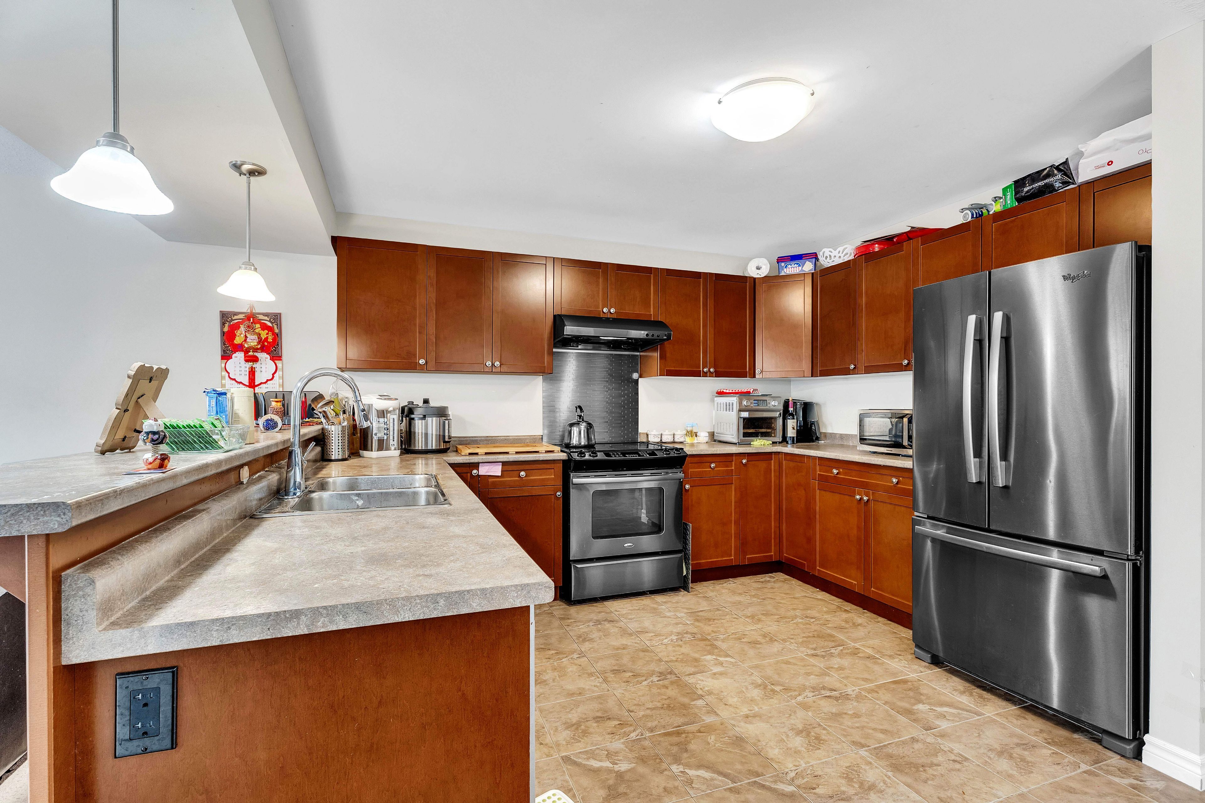 • Spacious kitchen with maple cabinetry and stainless steel appliances.