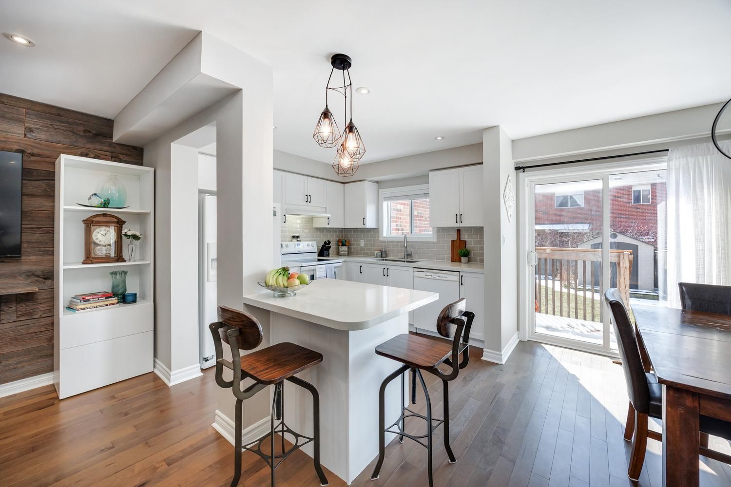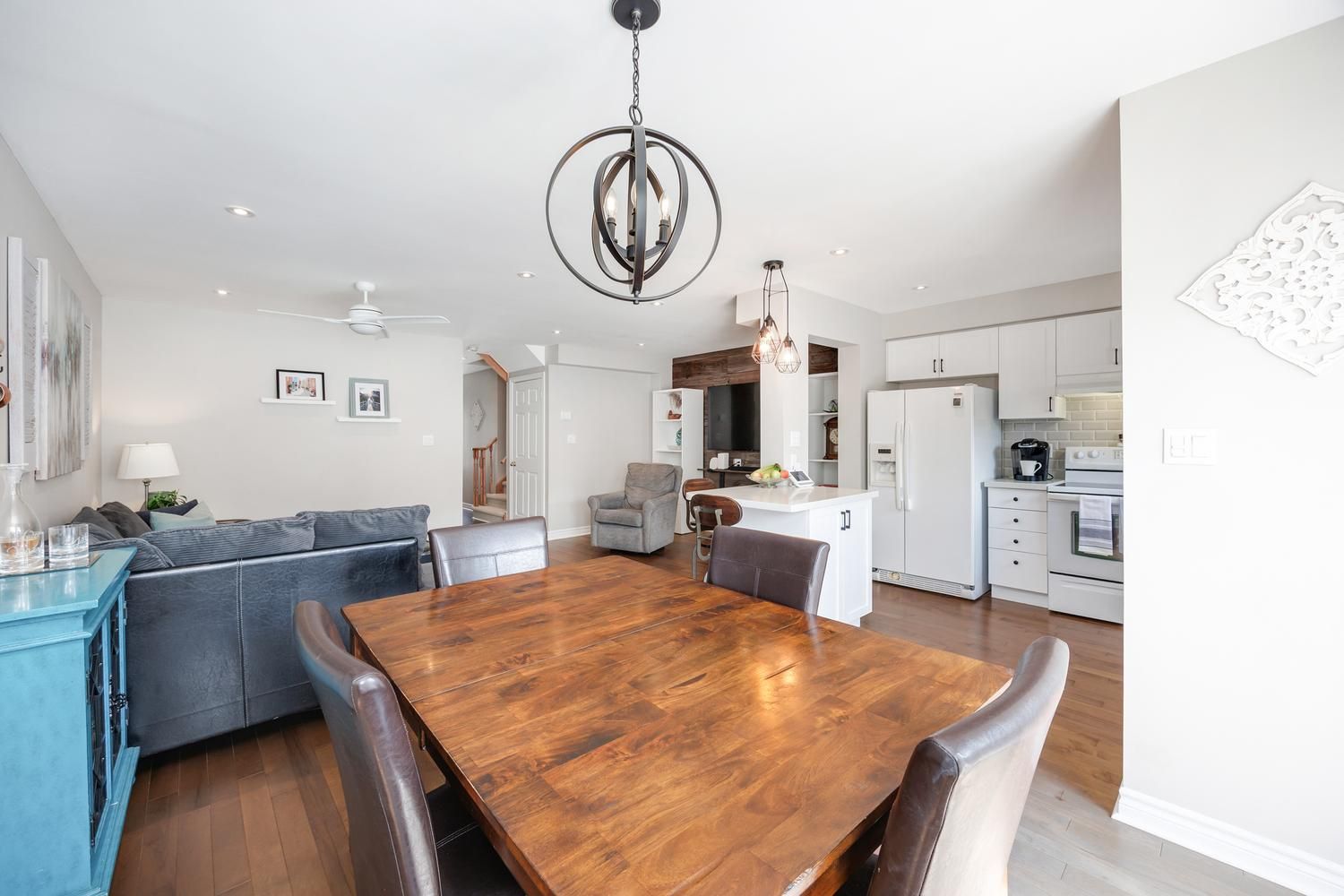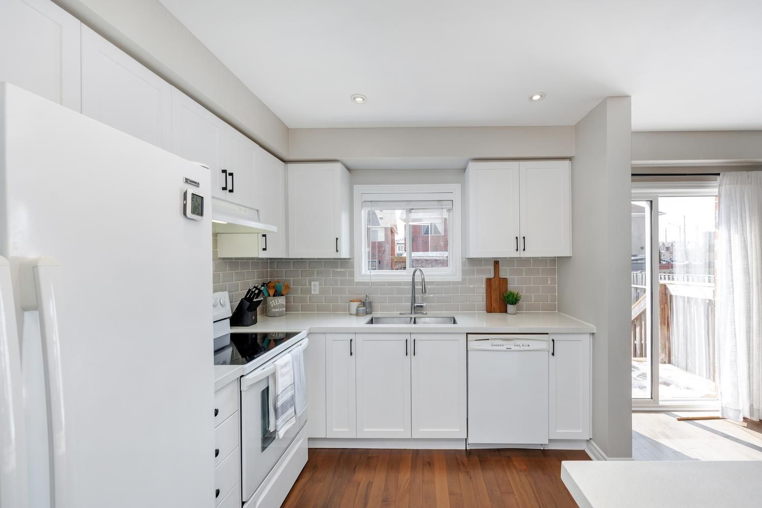 Come and check out this beautiful townhome, with great curb appeal, in a sought-after family-friendly neighbourhood, in south-east ajax - you won't be disappointed! Convenient to both the 401 and the 407 for your commuting needs. This home exudes pride of ownership at every turn, as it has been tastefully upgraded and lovingly maintained by the current owners. Features include maple hardwood floors throughout the main level, a stylish barnboard feature wall in the living room, pot lights, new white kitchen with shaker style cabinets and classic black hardware, quartz counters, and a convenient sit-up island. Upgraded lighting fixtures throughout. The spacious primary bedroom features a 4 piece ensuite bathroom, walk-in closet and an electric fireplace. Both of the other bedrooms are a generous size, with one also having a walk-in closet. The sliding glass door walk-out from the dining room opens up to a newer deck and a spacious paver stone patio for those great summer get togethers. Enjoy the additional living space that the professionally finished basement space provides for your family's needs, including pot lights, durable berber carpet and a cozy electric fireplace! Your nicely fenced backyard will be the envy of the neighbourhood, with its lush green grass, and perennial gardens, thanks to the inground irrigation system. Convenient garden shed for your outdoor storage needs. Close to amenities, shopping, schools and parks.
