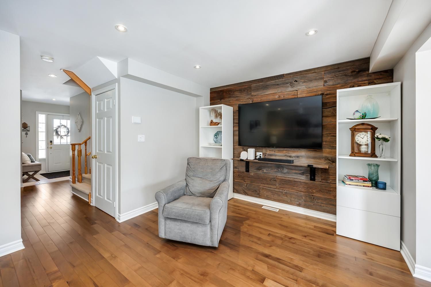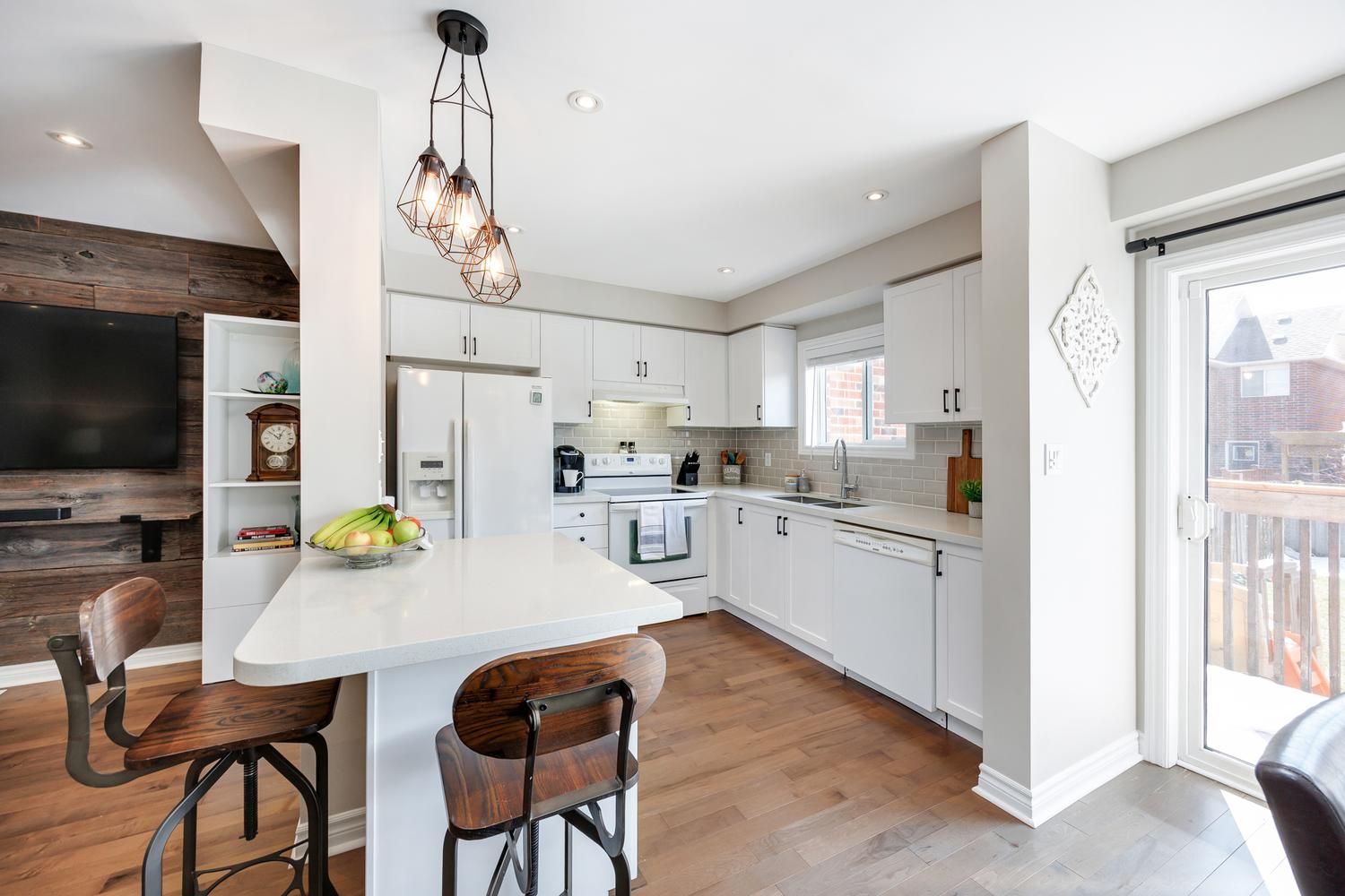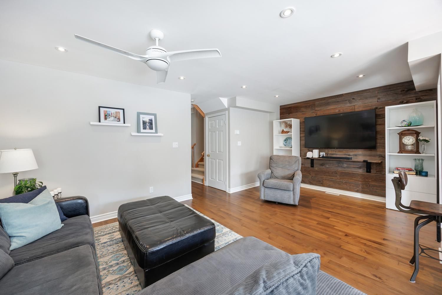 Come and check out this beautiful townhome, with great curb appeal, in a sought-after family-friendly neighbourhood, in south-east ajax - you won't be disappointed! Convenient to both the 401 and the 407 for your commuting needs. This home exudes pride of ownership at every turn, as it has been tastefully upgraded and lovingly maintained by the current owners. Features include maple hardwood floors throughout the main level, a stylish barnboard feature wall in the living room, pot lights, new white kitchen with shaker style cabinets and classic black hardware, quartz counters, and a convenient sit-up island. Upgraded lighting fixtures throughout. The spacious primary bedroom features a 4 piece ensuite bathroom, walk-in closet and an electric fireplace. Both of the other bedrooms are a generous size, with one also having a walk-in closet. The sliding glass door walk-out from the dining room opens up to a newer deck and a spacious paver stone patio for those great summer get togethers. Enjoy the additional living space that the professionally finished basement space provides for your family's needs, including pot lights, durable berber carpet and a cozy electric fireplace! Your nicely fenced backyard will be the envy of the neighbourhood, with its lush green grass, and perennial gardens, thanks to the inground irrigation system. Convenient garden shed for your outdoor storage needs. Close to amenities, shopping, schools and parks.