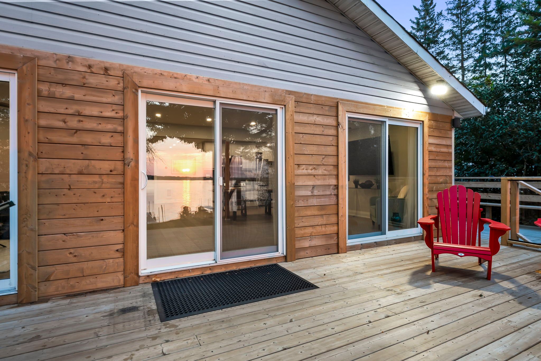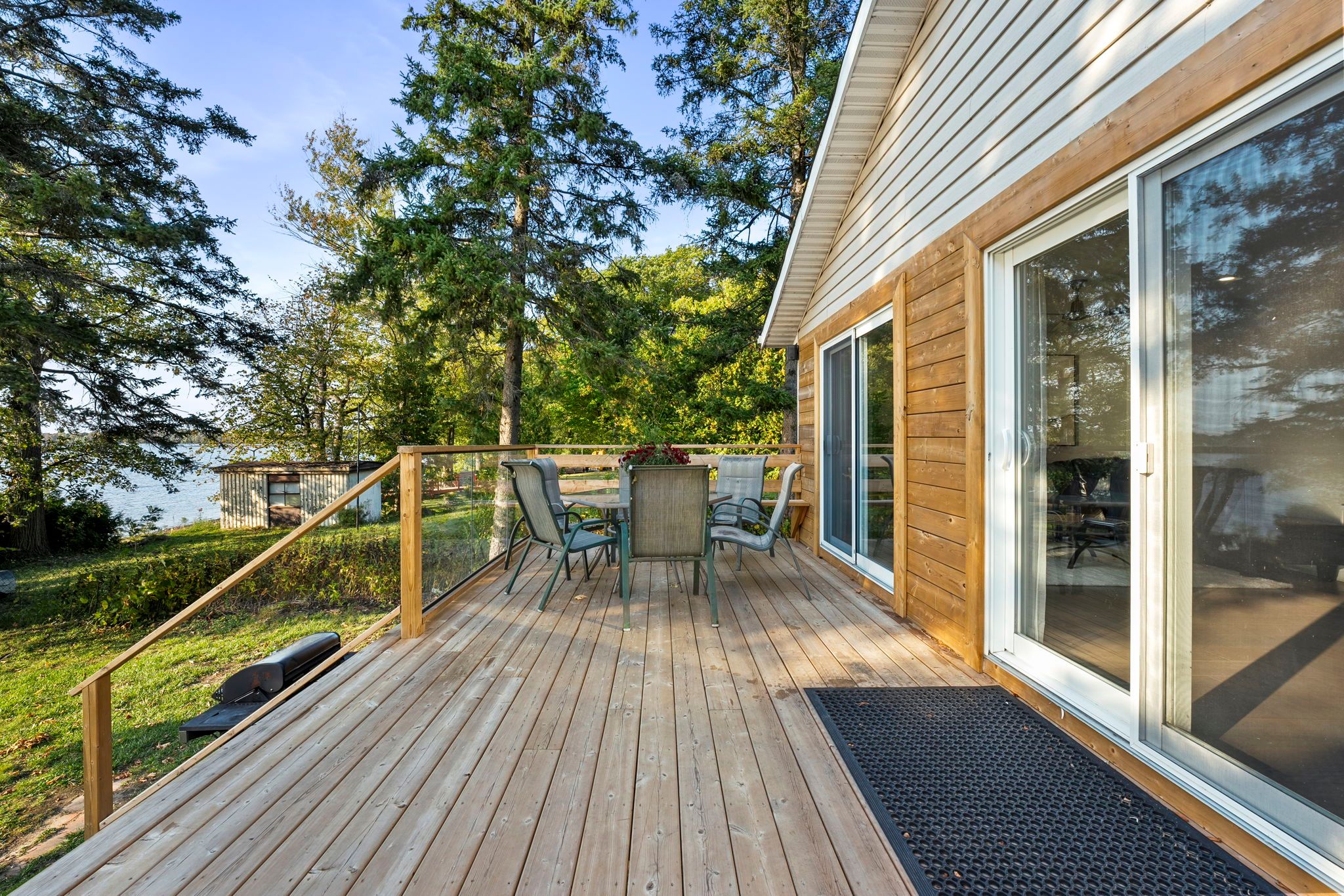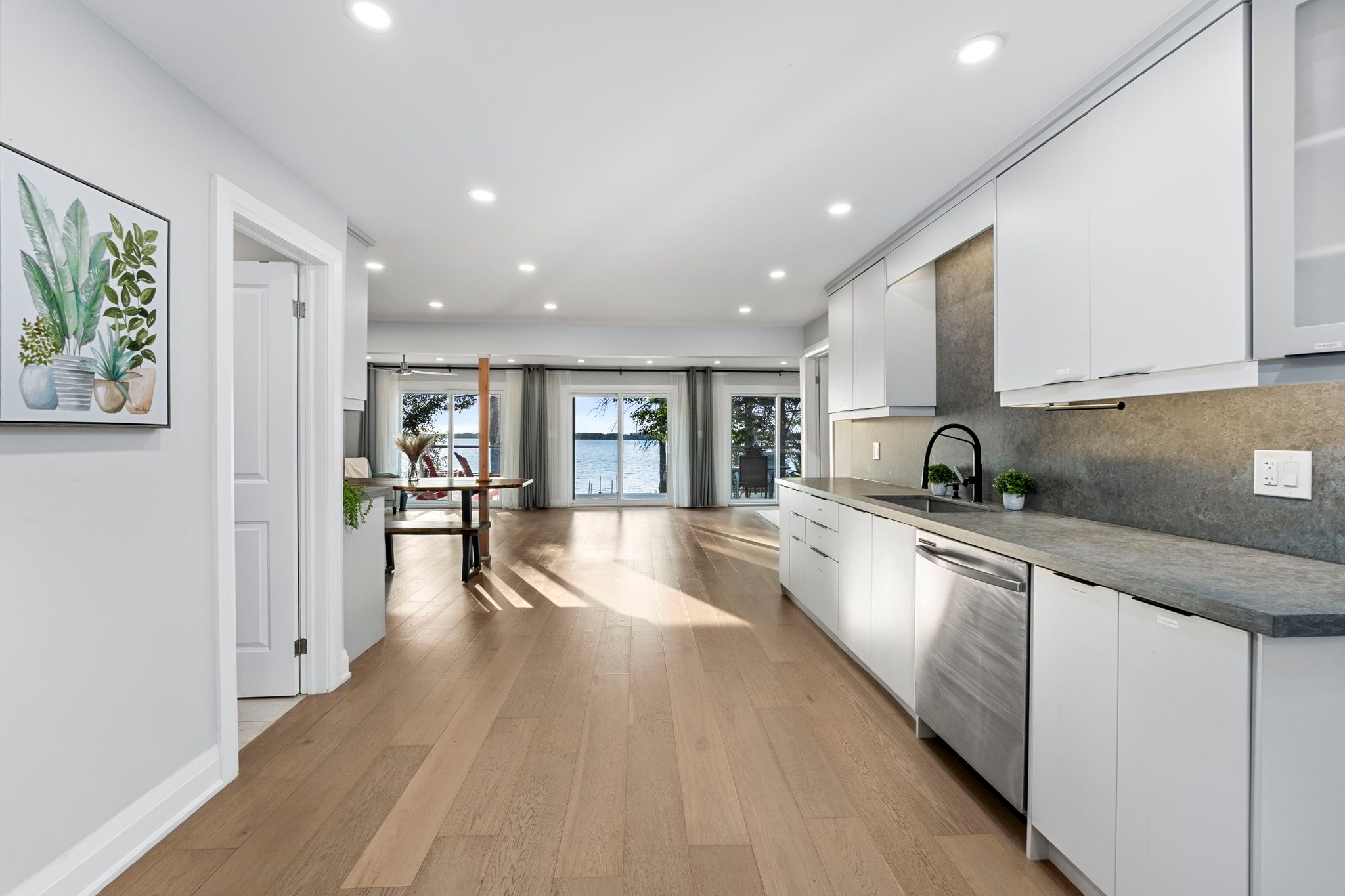 • Bright open-concept living space with large sliding glass doors for lake views.