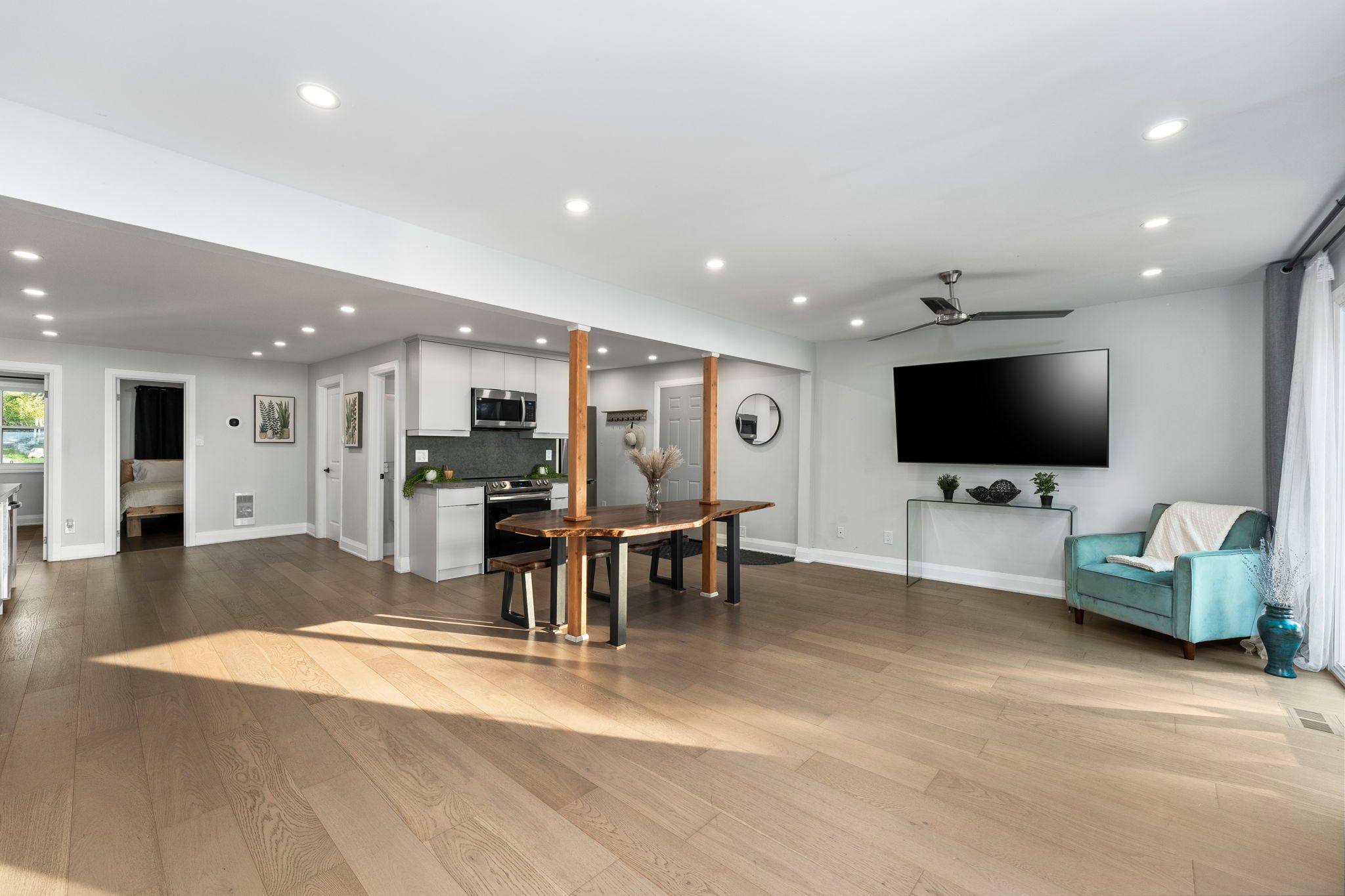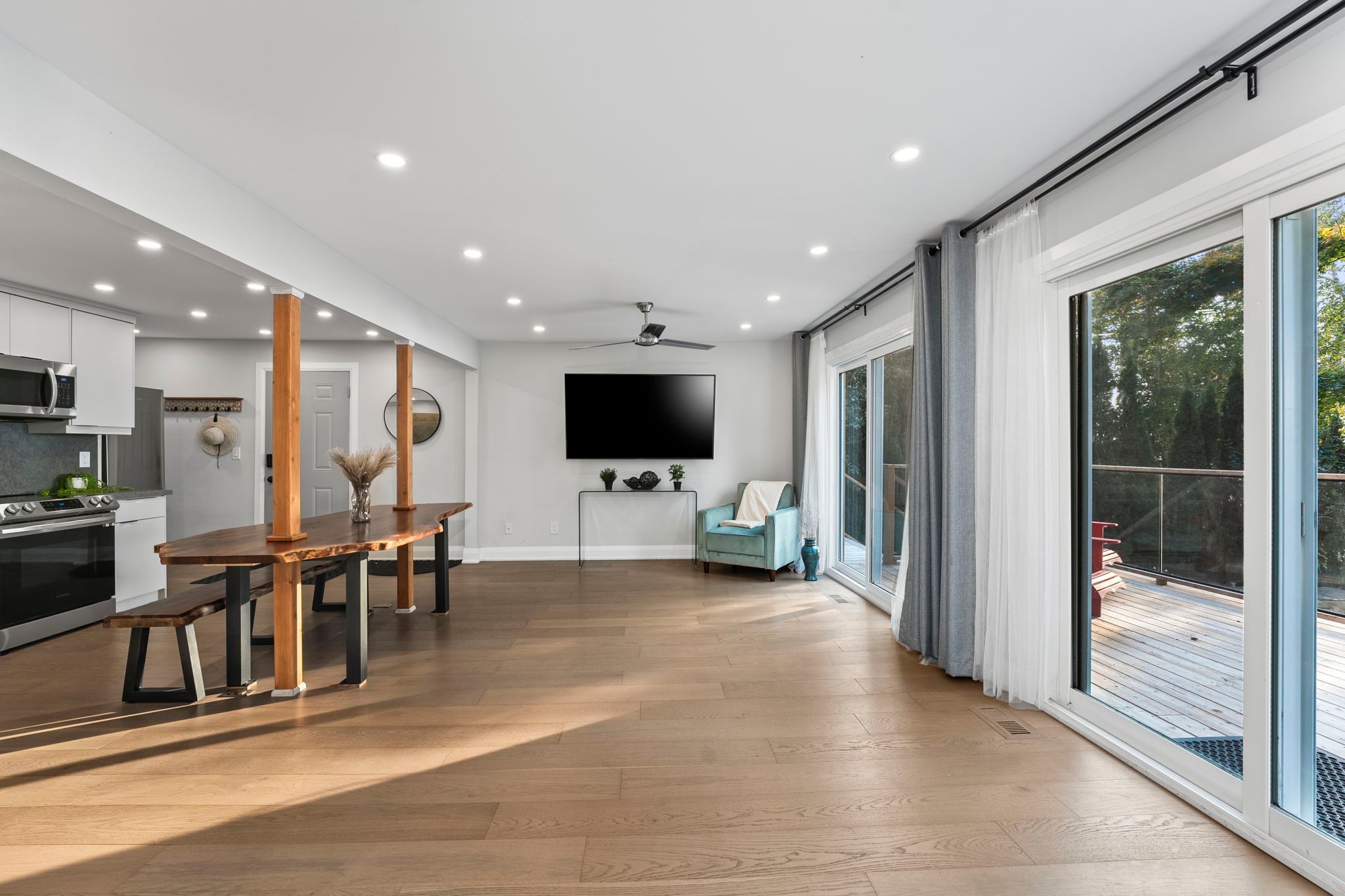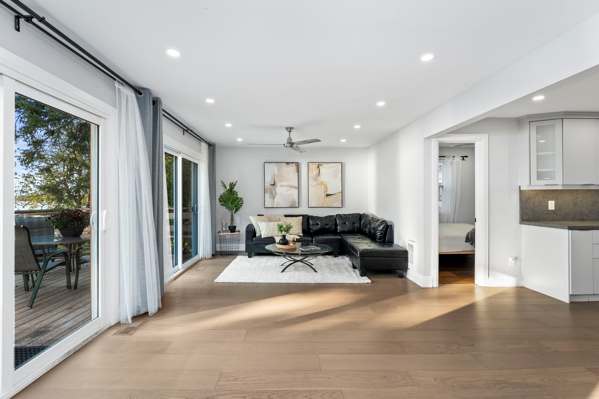 • Bright open-concept living space with large sliding glass doors for lake views.