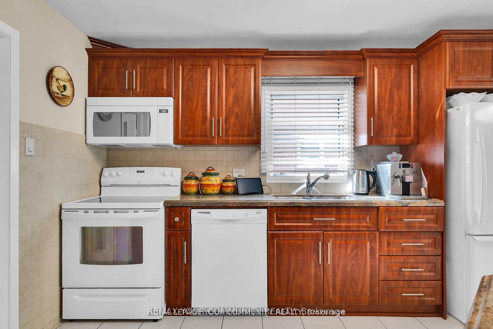 Prime location on a highly desirable street walking distance to transit, local amenities, parks, schools. Location is a+ this home is loved and well maintained. Immaculately clean, tidy, renovated kitchen with granite countertops, additional room added to the back of the home with a wood fireplace, sliding doors leading to the backyard and is used as the eat in kitchen area. Marble stairs, french doors. The backyard is picturesque, reminiscent of a european vibe. 3 spacious bedrooms on the upper level with one bedroom featuring a walkout to an expansive terrace overlooking the gardens. (need size of the terrace). Finished lower level with separate bedroom & full bathroom to accommodate an additional family member. Garage + long driveway to accommodate total of 4 vehicles. Ttc is just around the corner, school across the street, shopping steps away. Smythe park is nearby & dalrymple park is close by. The neighbourhood is family friendly. ** new washer and dryer **
